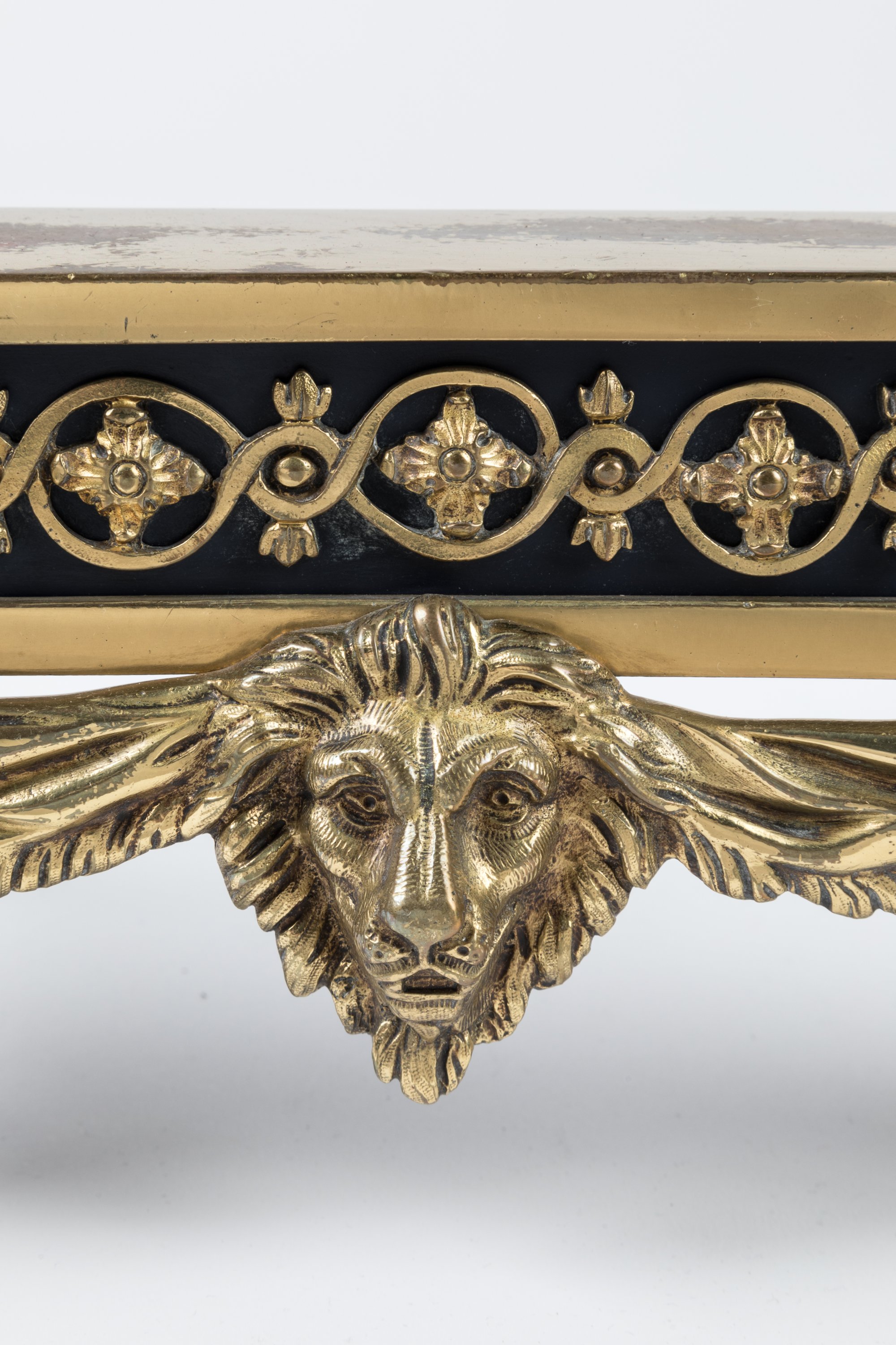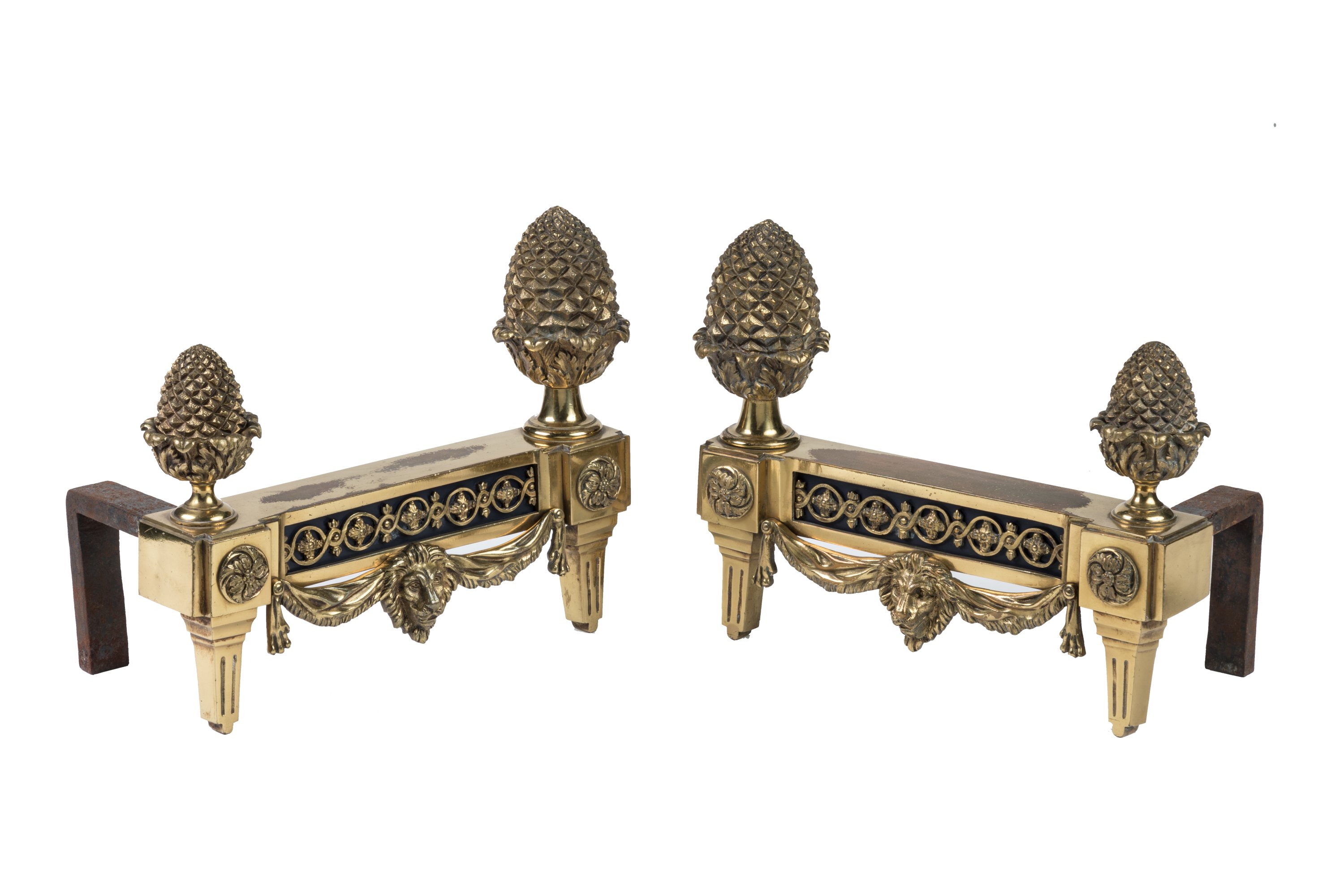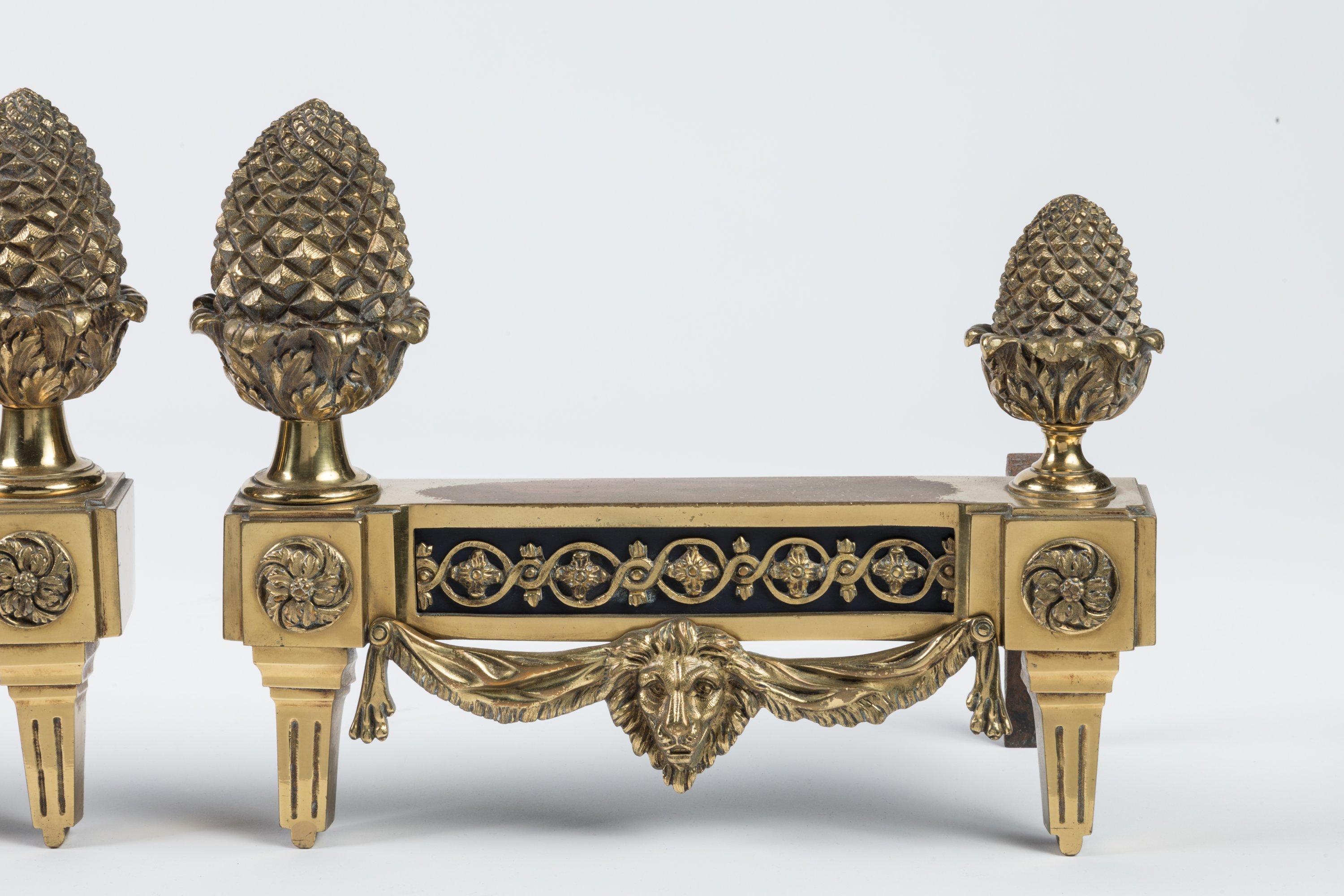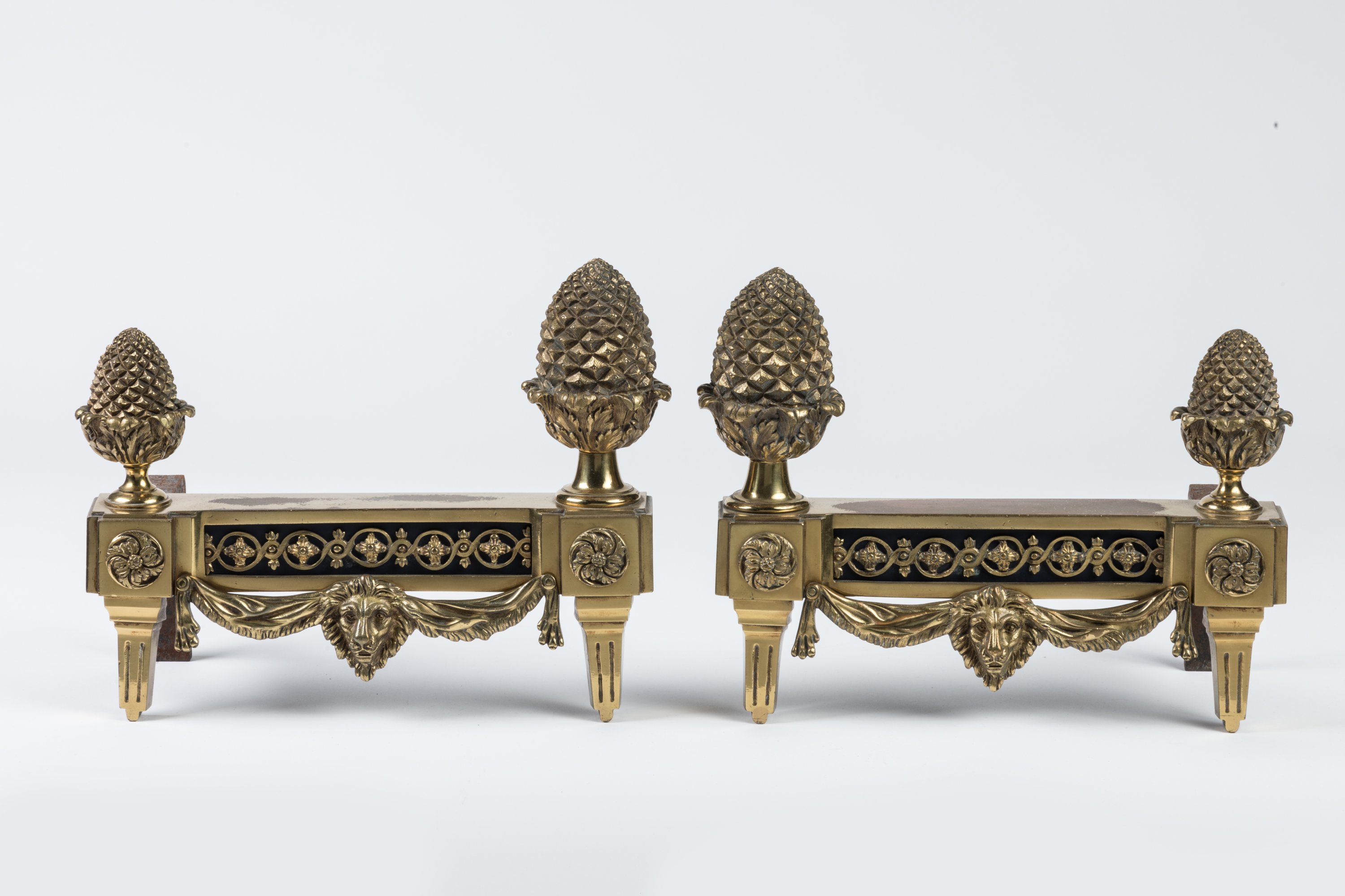 en bronze doré coiffés de deux pommes de pin en deux tailles. La partie centrale à décor d'enroulements surmontant une tête de lion dans un entourage de draperie. Deux pieds gaines cannelés.