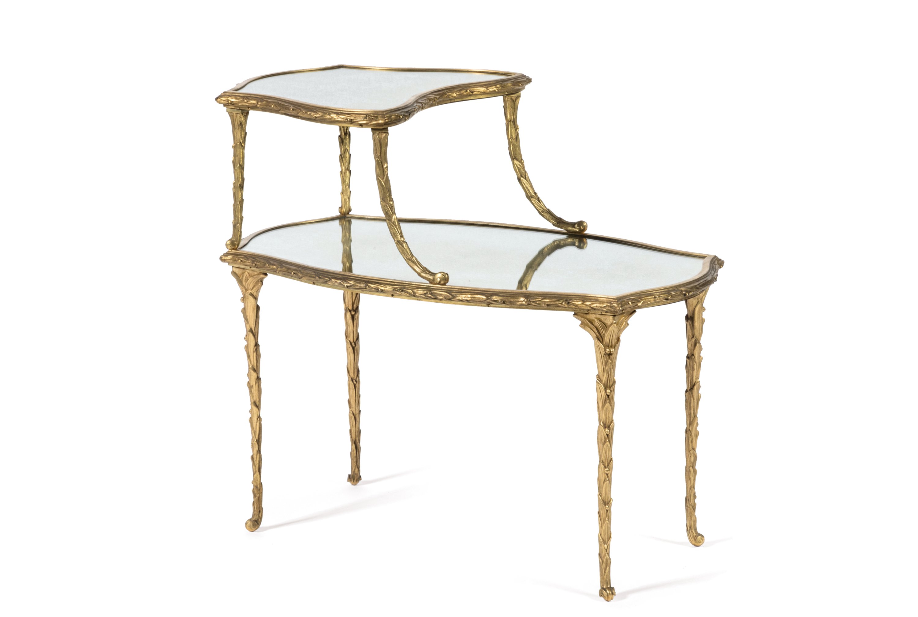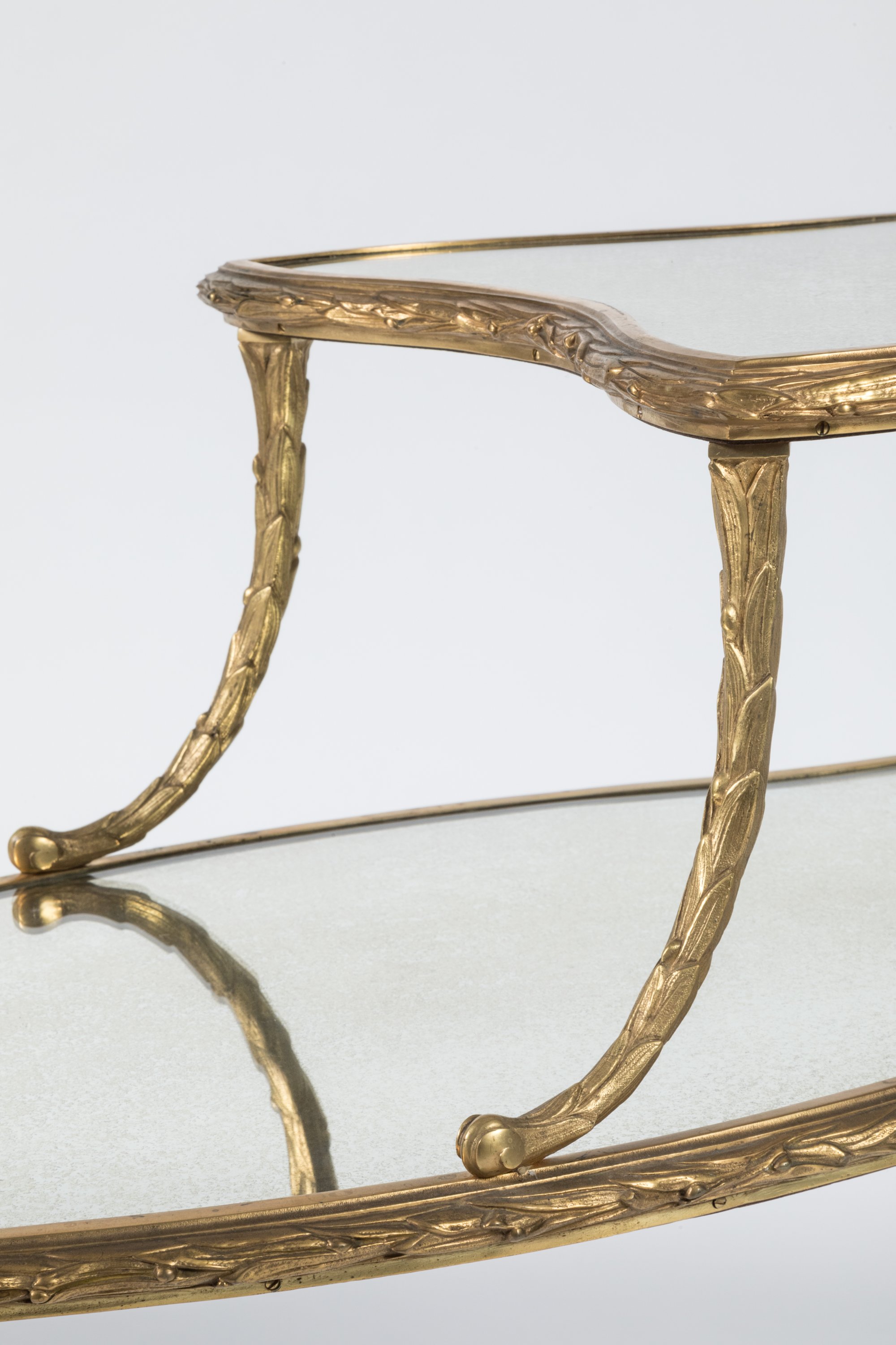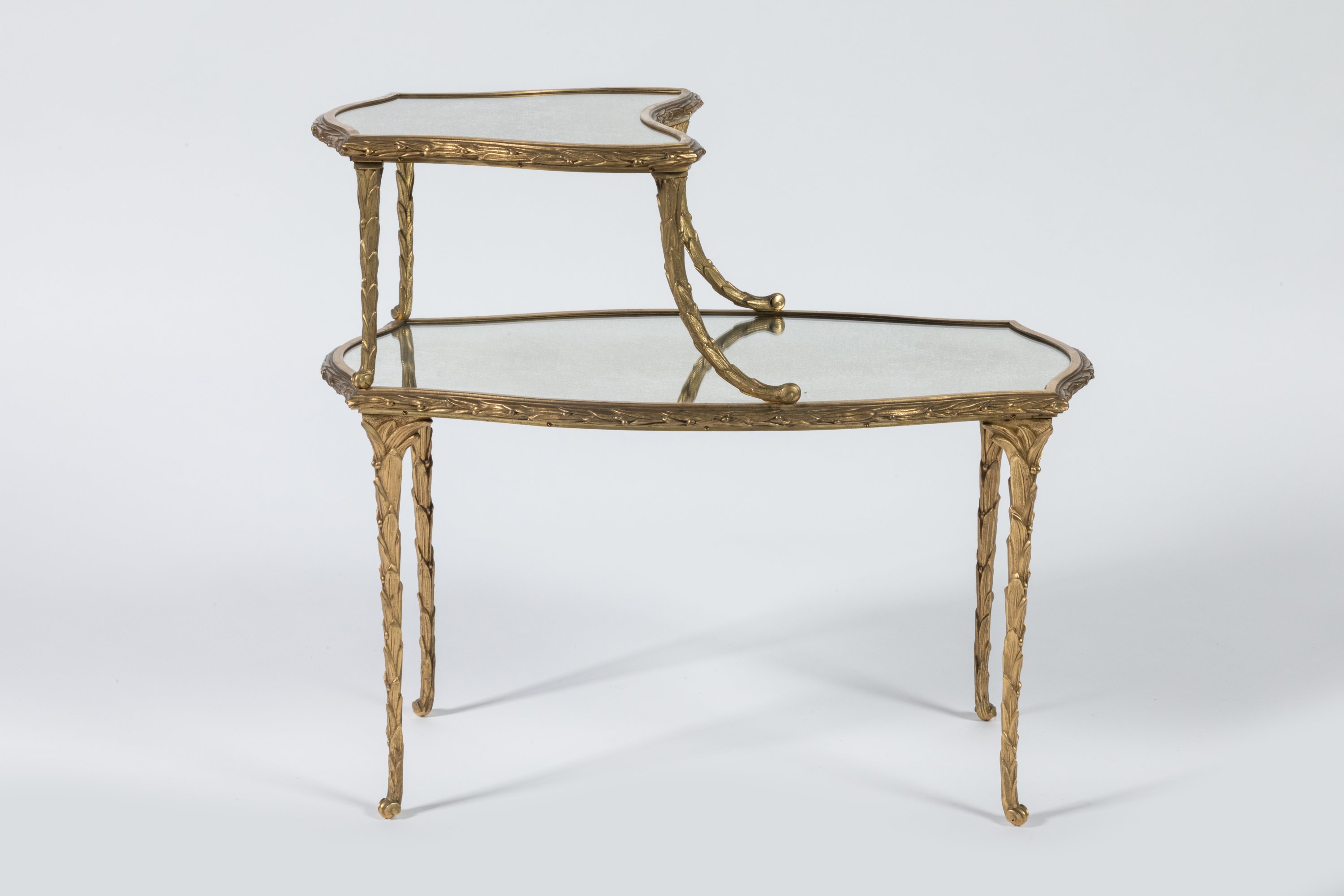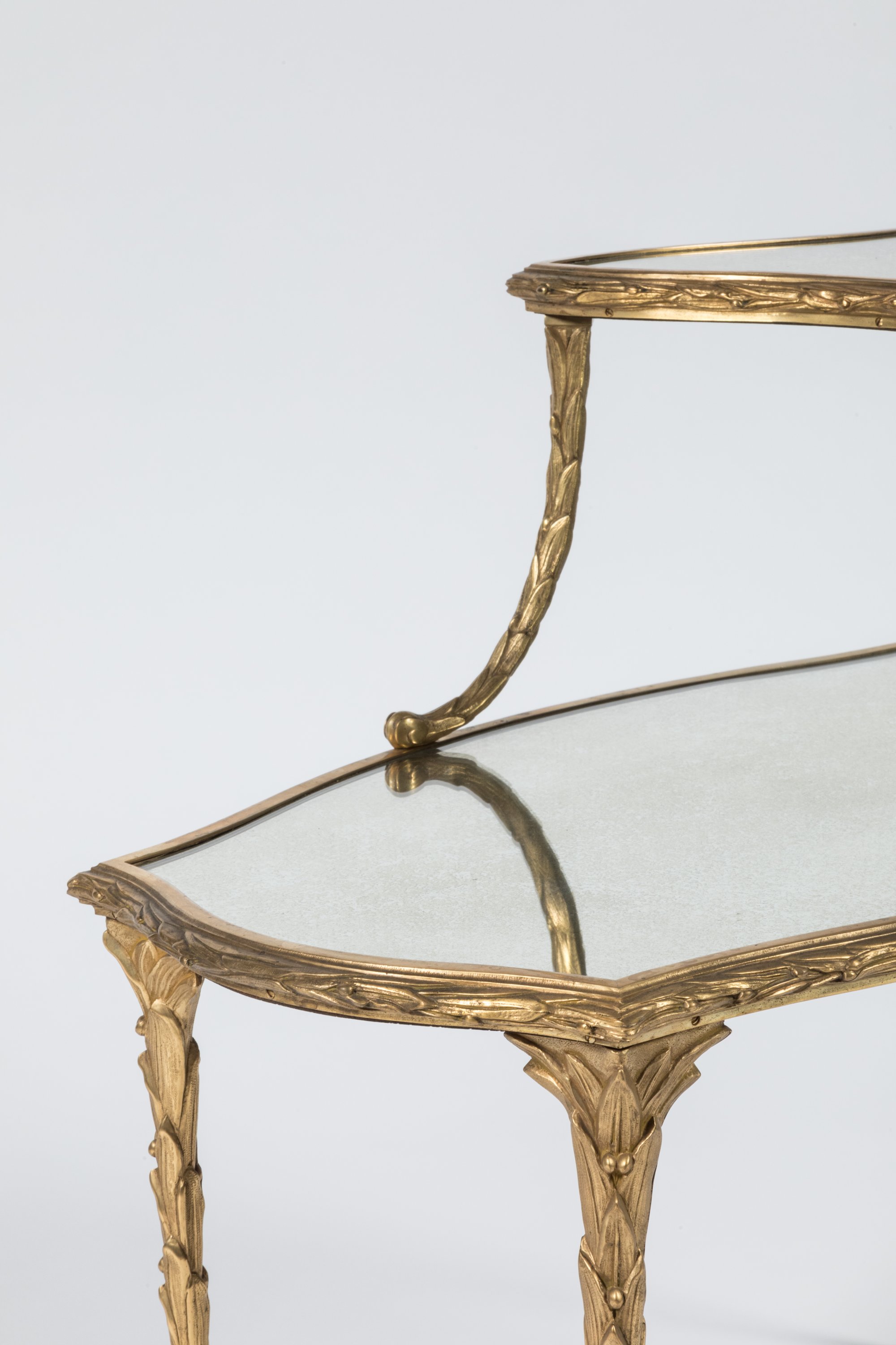 en bronze doré de forme mouvementée, composée de deux plateaux en deux tailles à fond de miroir. L'ensemble est décoré de motifs de feuilles de laurier. Quatre pieds terminés en enroulement.