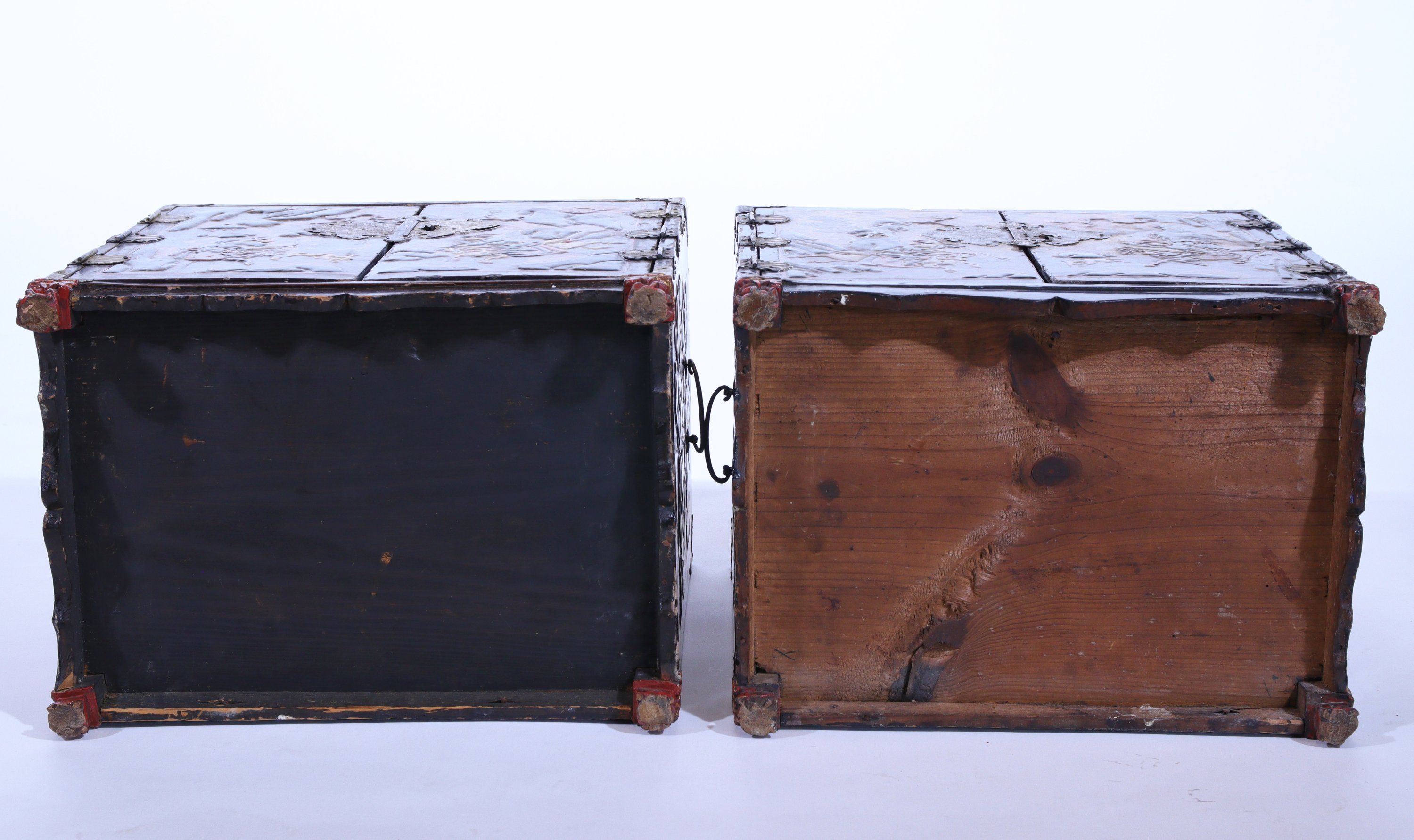 China, Qianlong Period. A pair of lacquered cabinets depicting scenes from the Shui-hu-Zhuan novel.