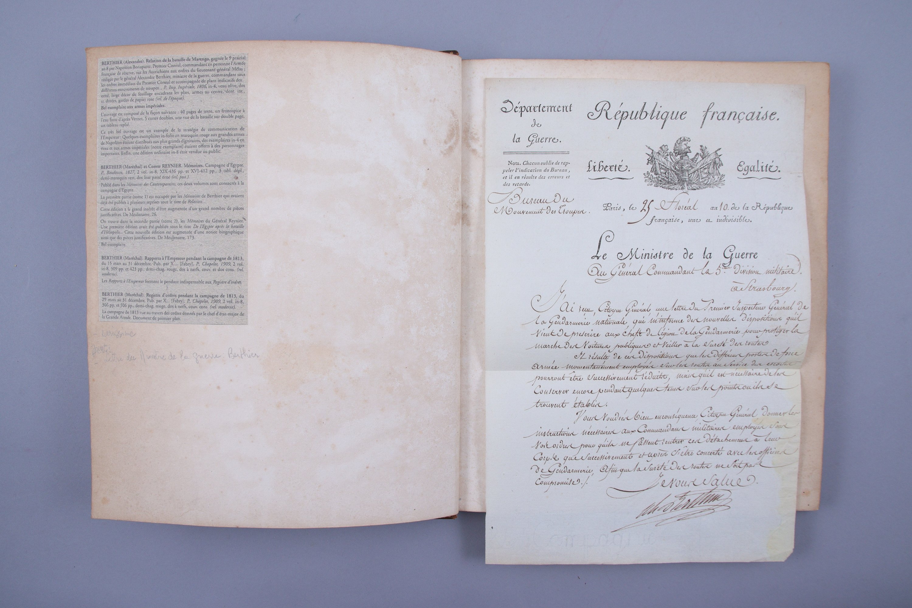 L'exemplaire a été enrichi d'une lettre datée du 25 floréal an 10 (15 mai 1802) signée de Berthier, sur papier à en-tête du Bureau du Mouvement des Troupes, Ministère de la Guerre.