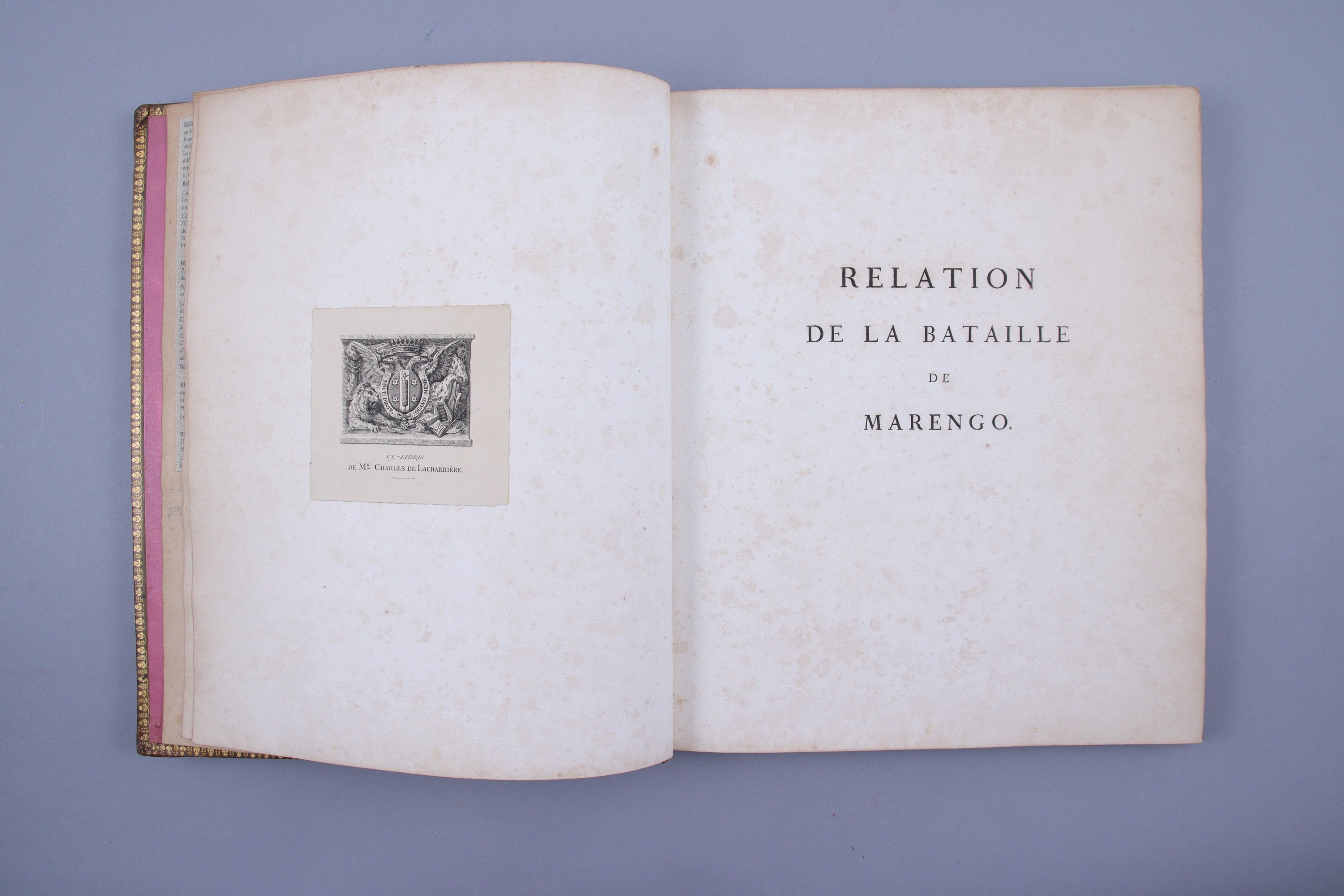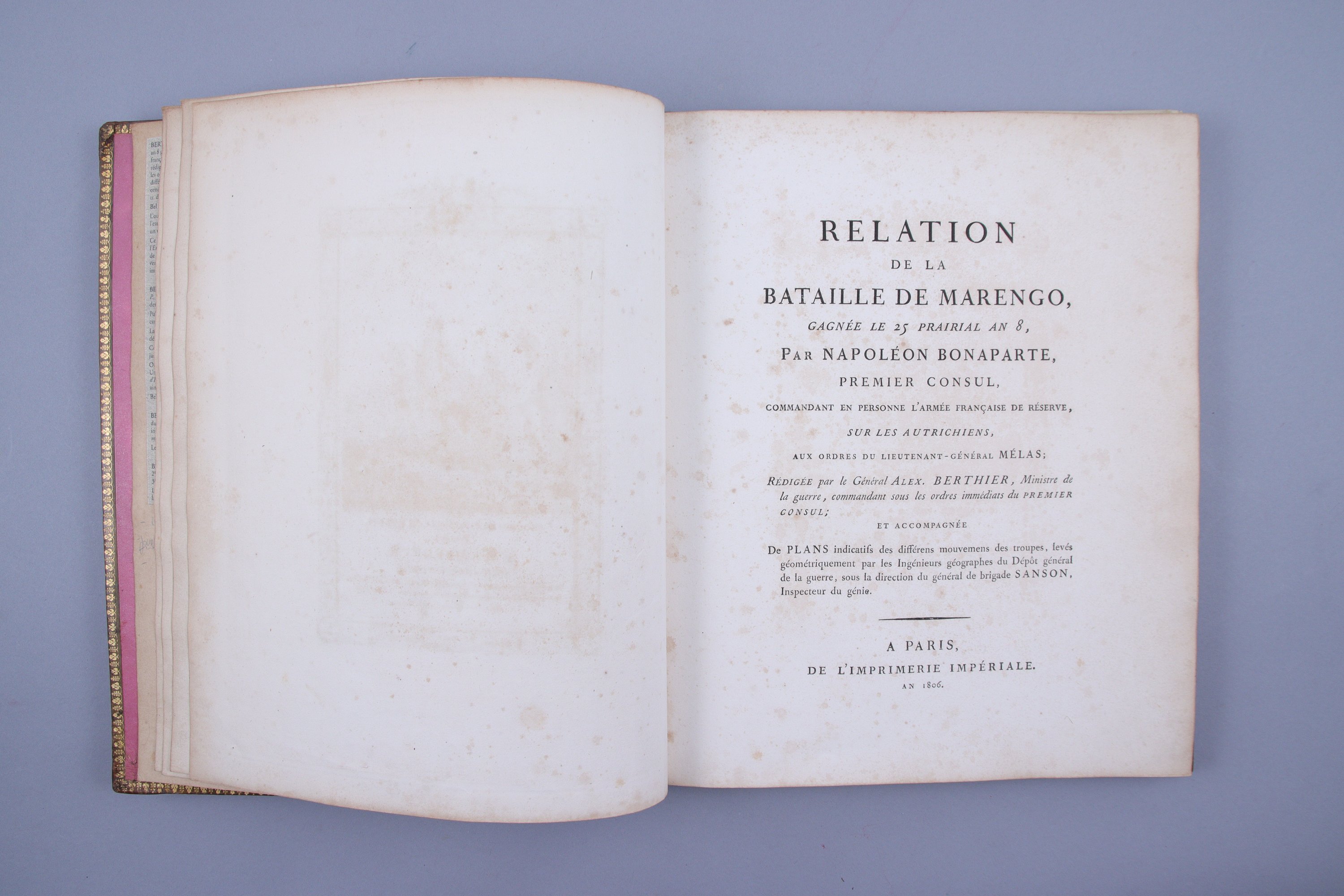 Grand in-4° (290 X 235 mm), (faux-titre, et titre-frontispice gravé par Niquet d'après Vernet), 40 pages. Un tableau dépliant "Situation de l'Armée de réserve" (500 X 400 mm), 5 cartes dépliantes rehaussées à l'aquarelle montées sur onglets, et 1 vue dépliante de la Bataille de Marengo, dessinée par Bagetti, capitaine ingénieur géomètre. Plein veau marbré fauve, large roulette d'encadrement de feuilles de laurier, armes de Napoléon sur les plats, filet sur les coupes, roulette intérieure. Toutes tranches dorées. (Très habiles restaurations, presque invisibles, aux coiffes et à un coin)