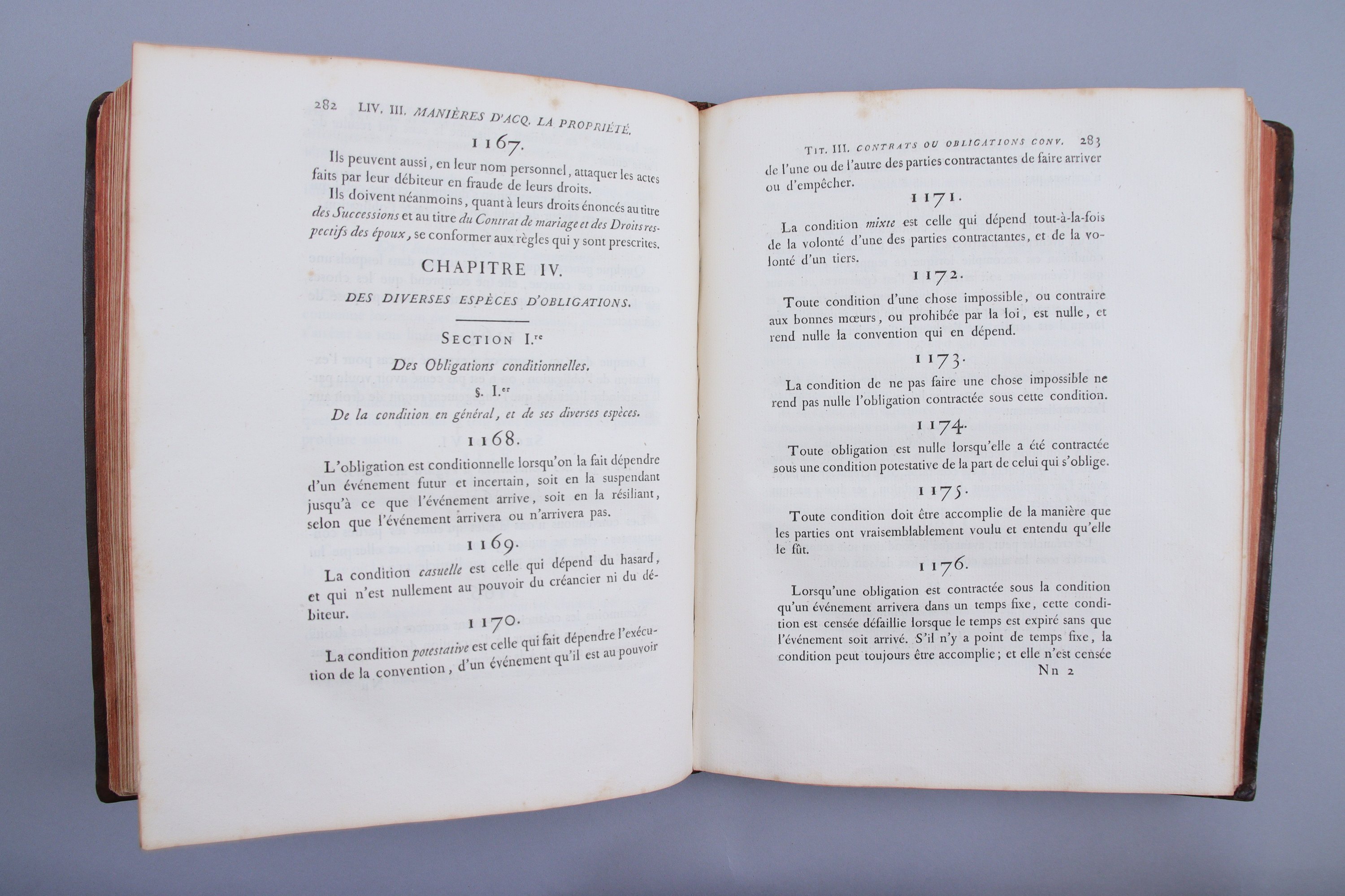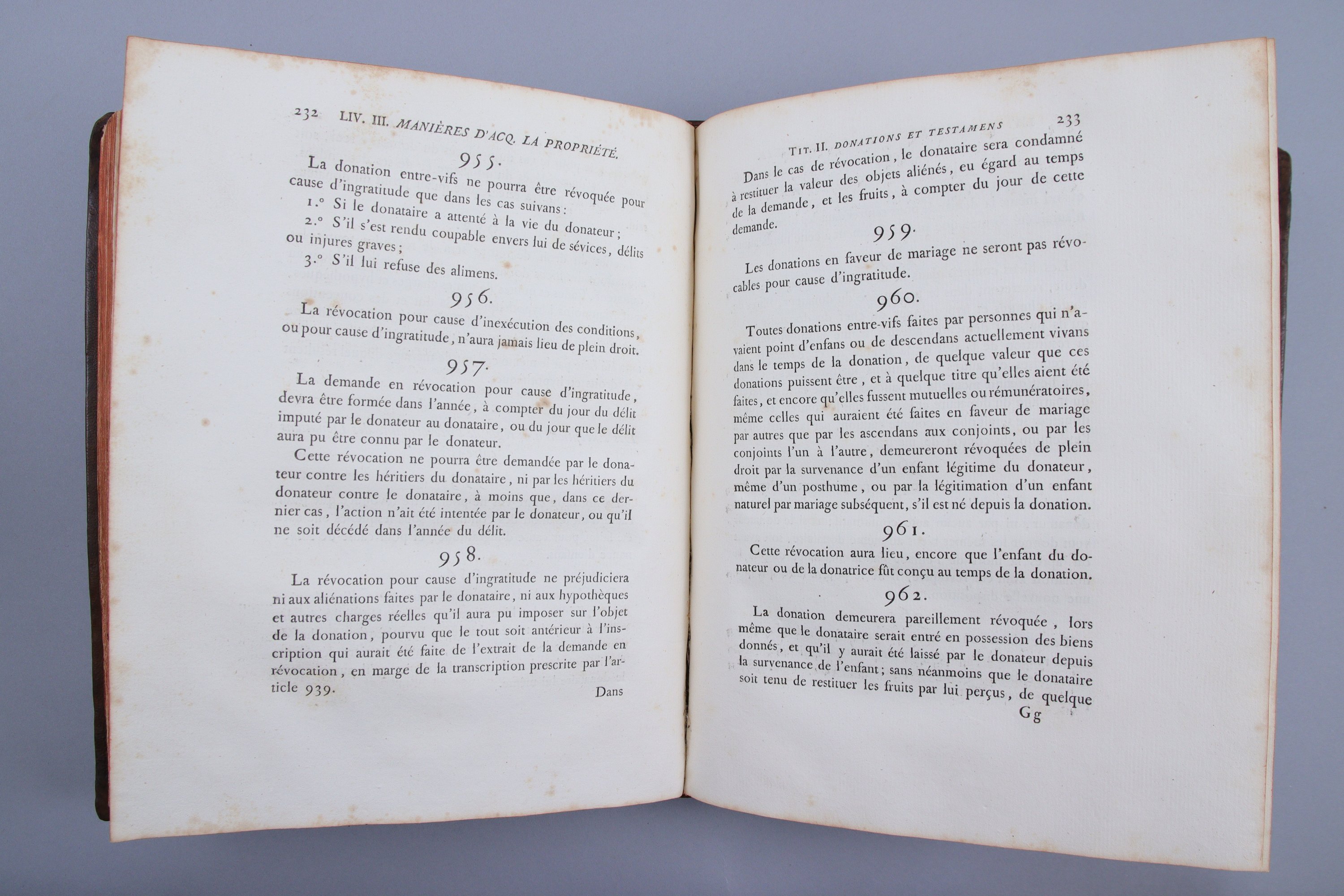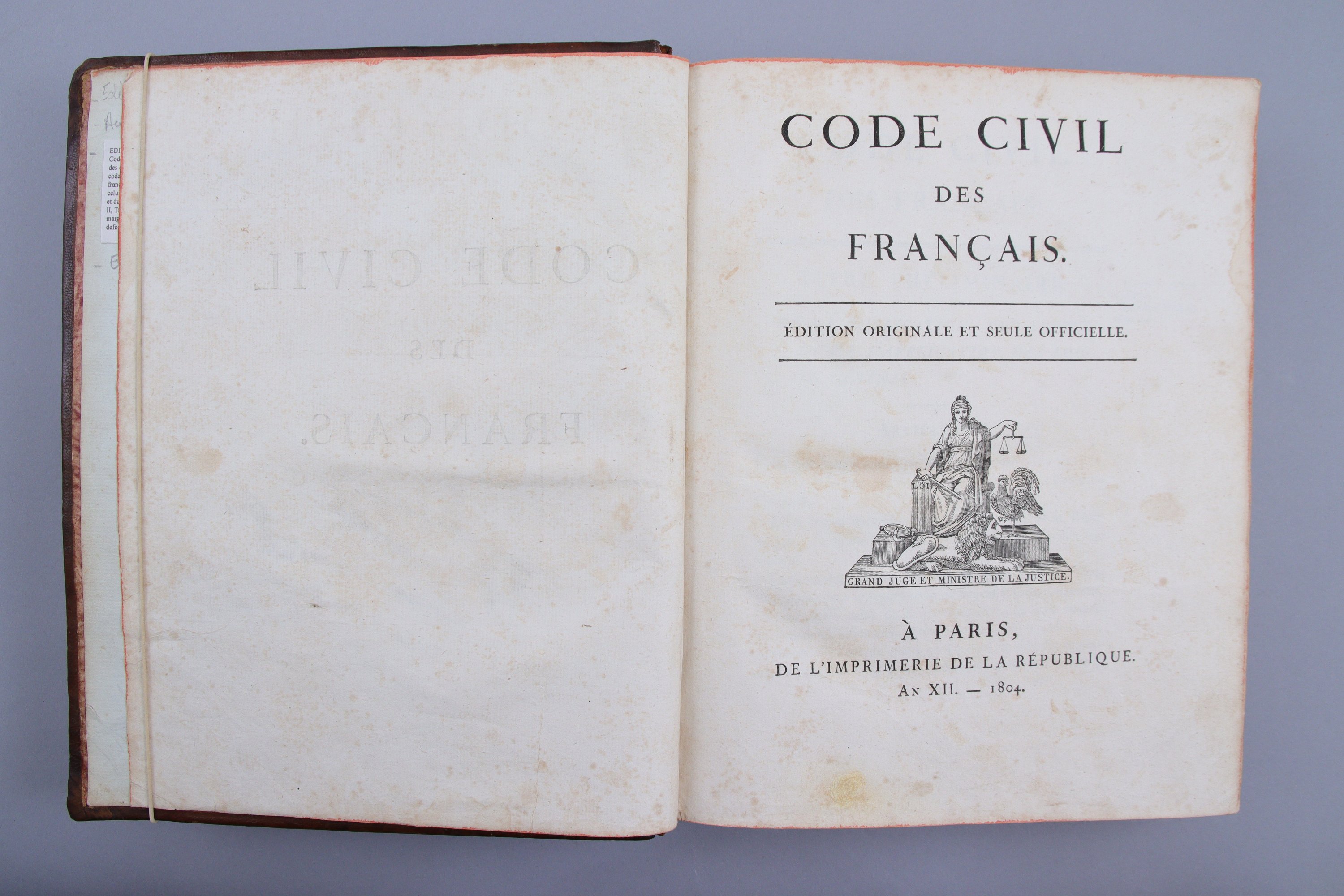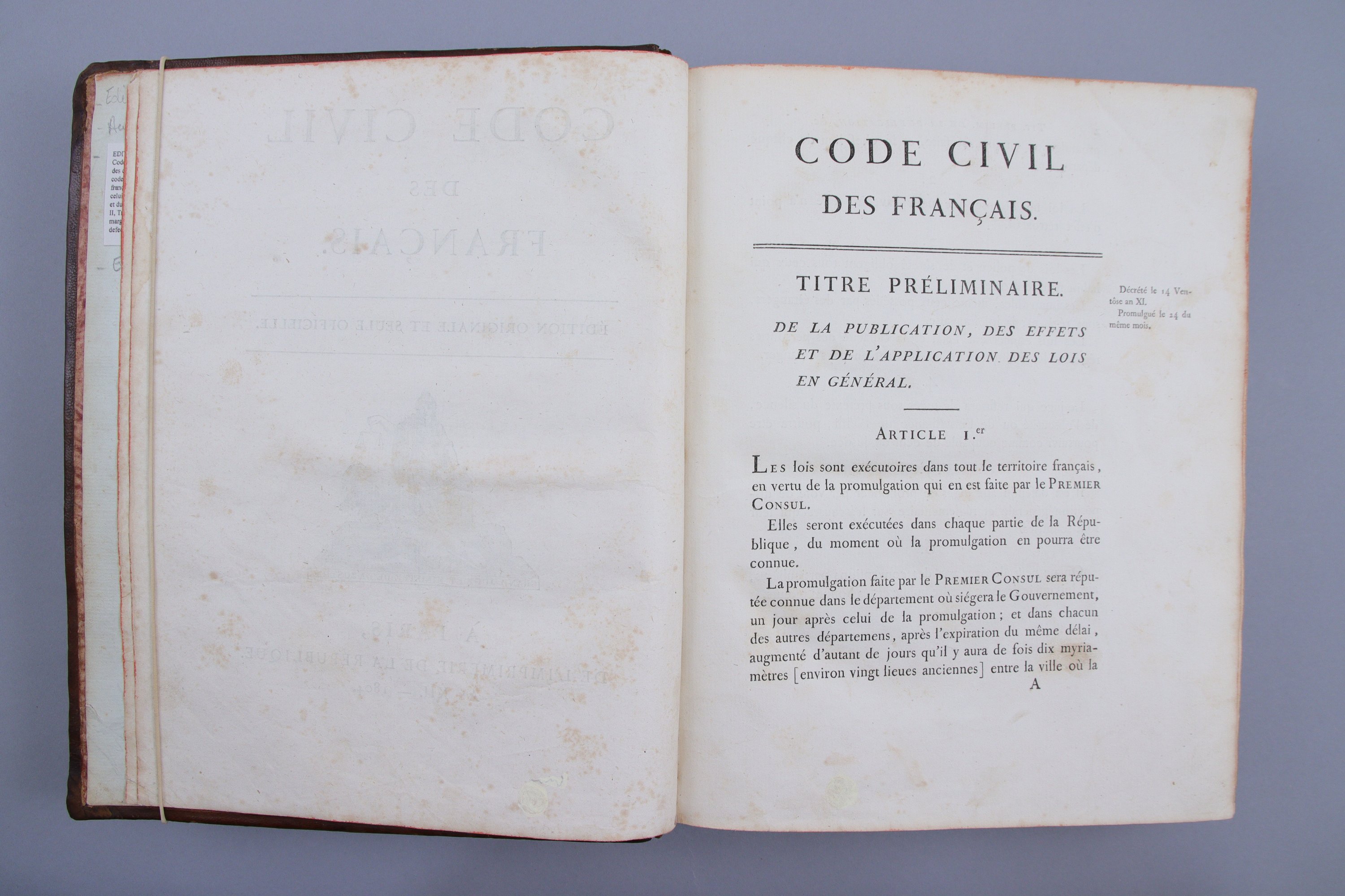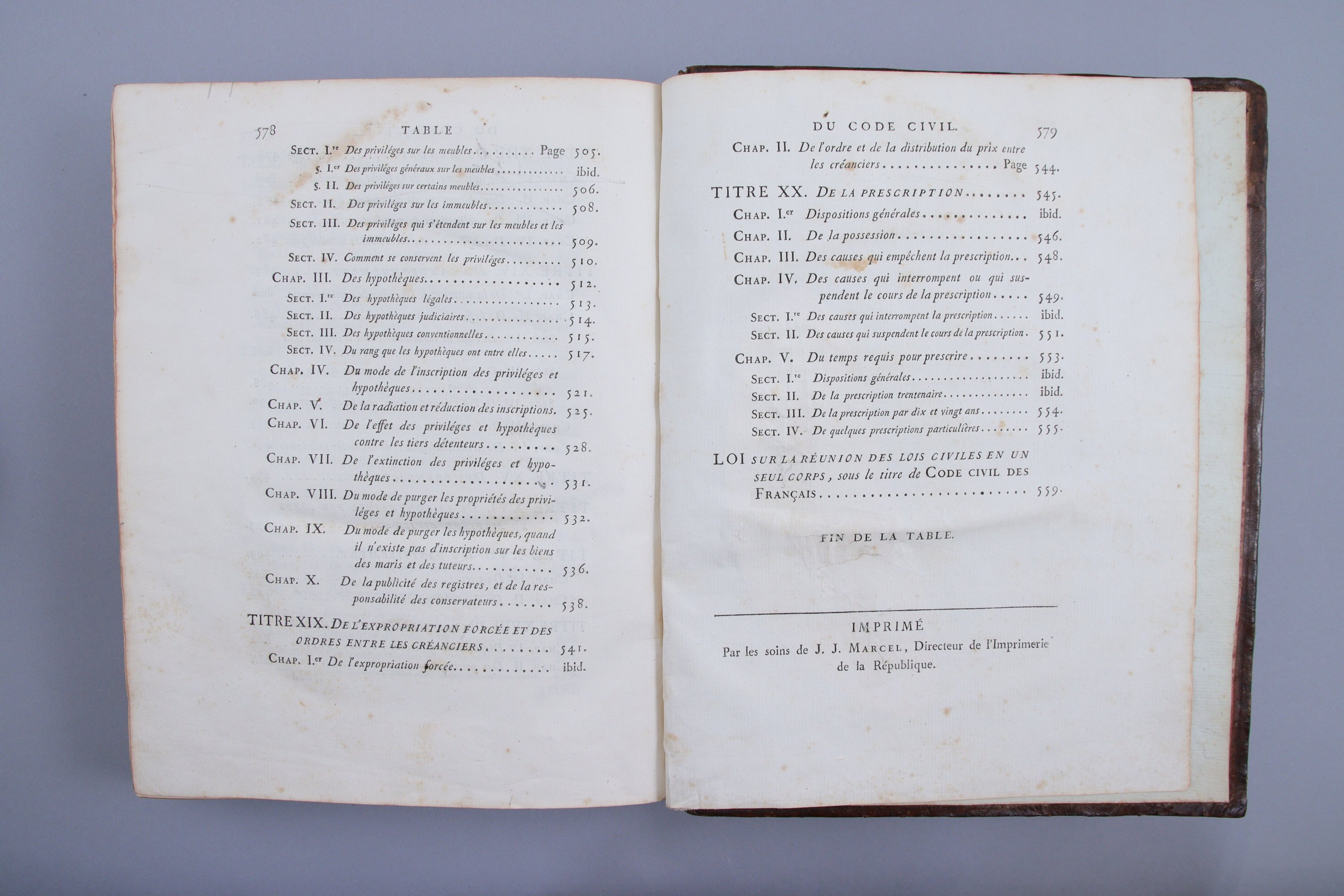 Bon exemplaire de la véritable édition originale du Code Civil en format in-4°, plus rare que l'in-8. Il est "imprimé par les soins de J.J. Marcel, Directeur de l'Imprimerie de la République", comme il est spécifié au colophon, p. 579.