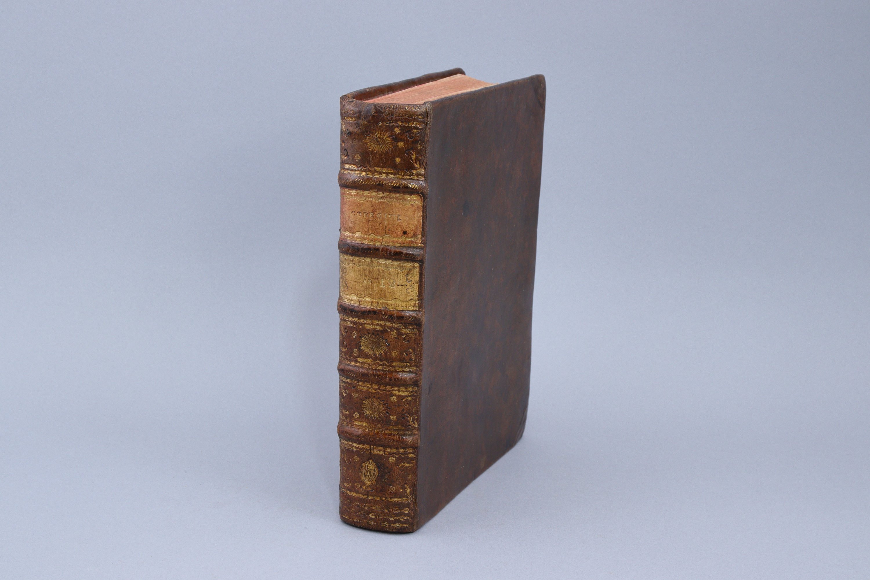 In-4° (250 X 200 mm). Faux-titre, titre, 579 pages. Pleine basane racinée fauve. Dos à 5 nerfs, orné de fers spéciaux "au soleil rayonnant" dans les entre-nerfs. Pièces de titre et de datation. (Restauration à la coiffe supérieure. Restauration discrète aux charnières. Quelques défauts bénins)