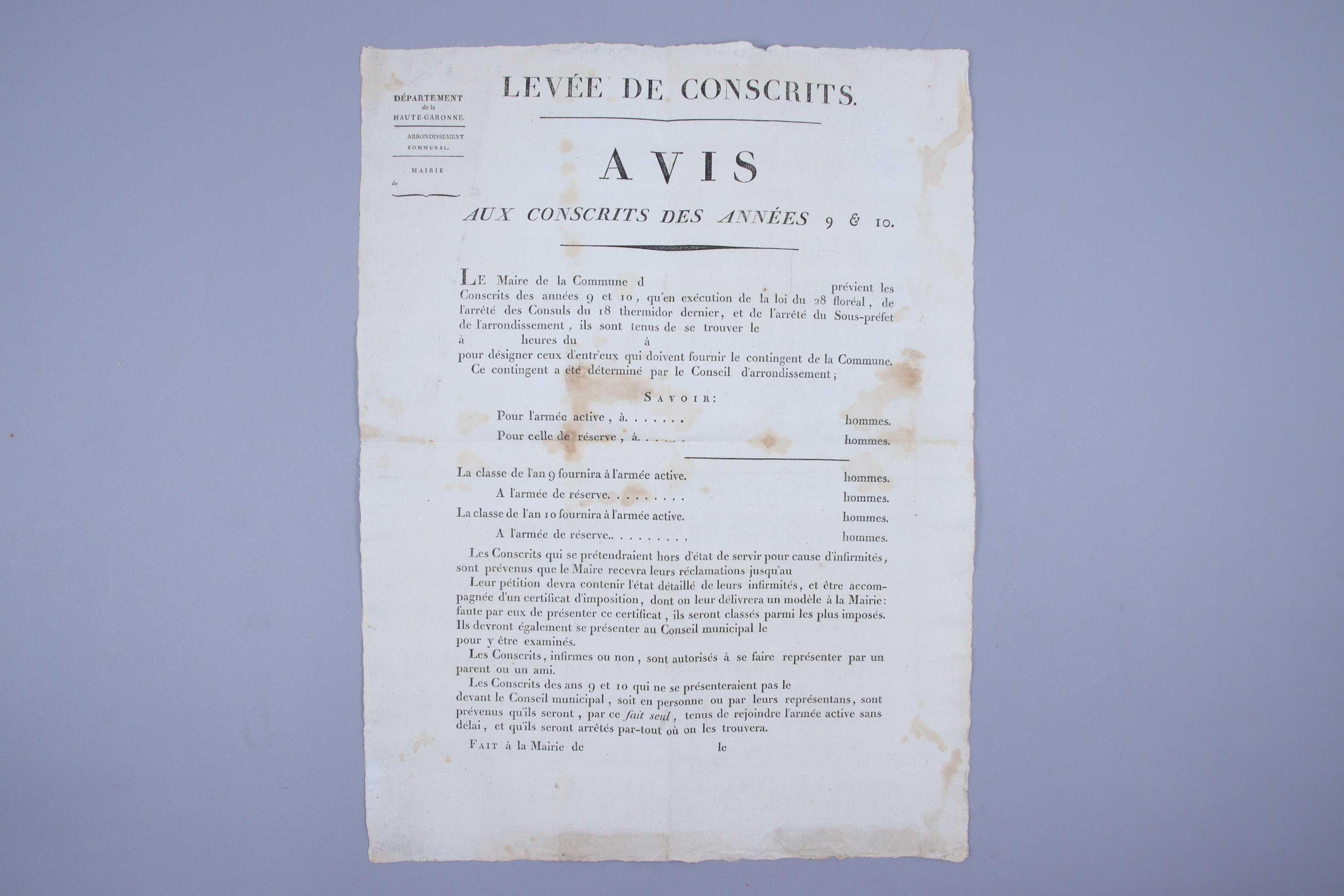 "Les conscrits des ans 9 et 10 qui ne se présenteraient pas le .........[Les espaces typographiques ont été laissés en blanc] devant le Conseil Municipal sont prévenus qu'ils seront arrêtés partout où on les trouvera".