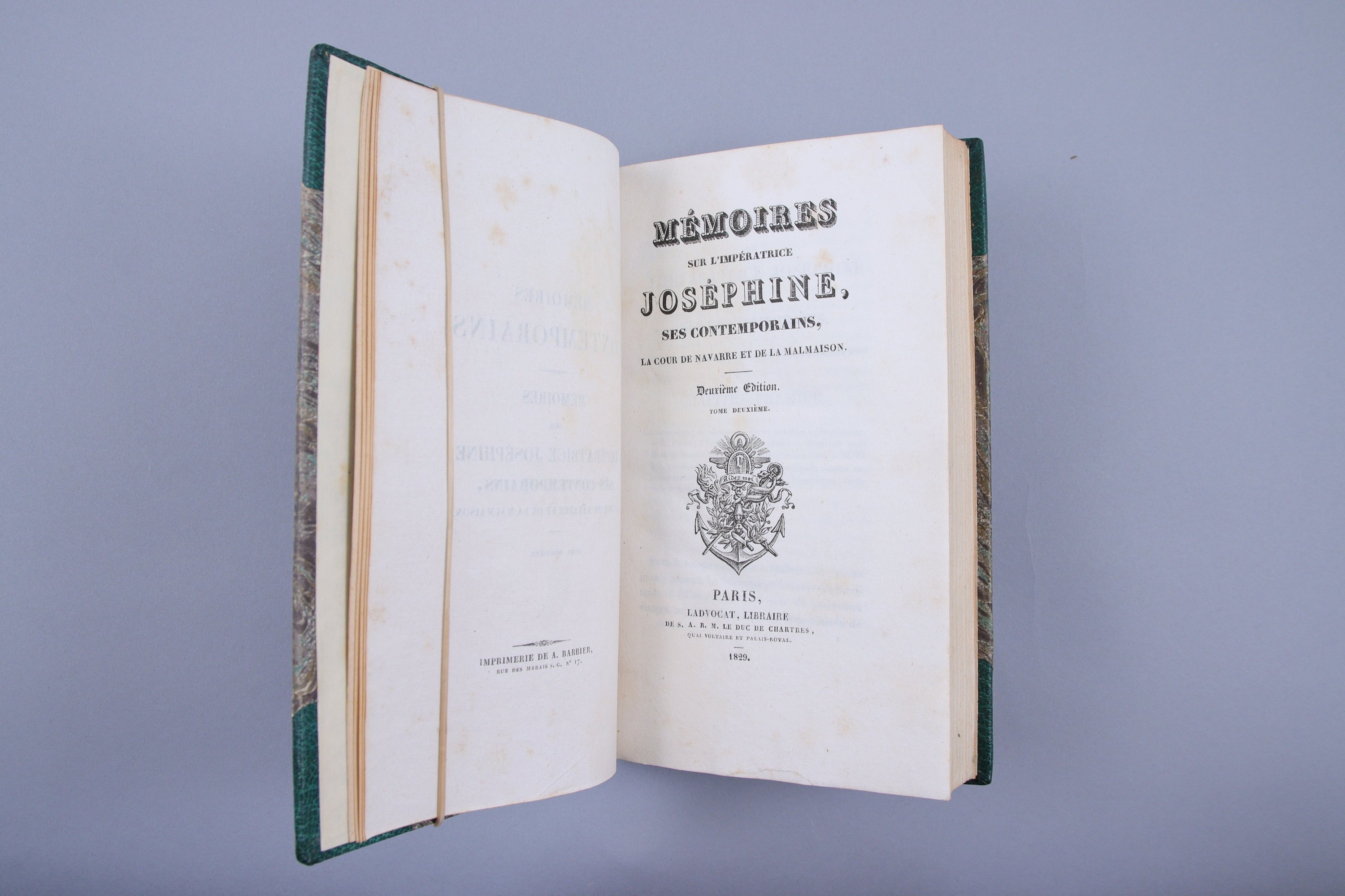 Edition originale portant la mention de seconde édition de la passionnante correspondance de Joséphine, et d'anecdotes très vivantes, souvent curieuses, qu'on ne trouve qu'ici .. En 1808, Madame de Stael reçoit chez elle l'helléniste et philhellène Eynard, accompagné de deux révolutionnaires grecs, Demetrios et Carianthes, qui lui apprennent la Pyrrhique, danse martiale du Pont-Euxin (I, , page 154). A l'arrivée des Cosaques dans Paris, les musiciens les plus célébres s'engagent dans la musique de l'Etat-Major pour éviter d'être enrôlés dans la Garde Nationale; Boyeldieu devient chapeau-chinois, Nadermann frappe sur la grosse caisse,