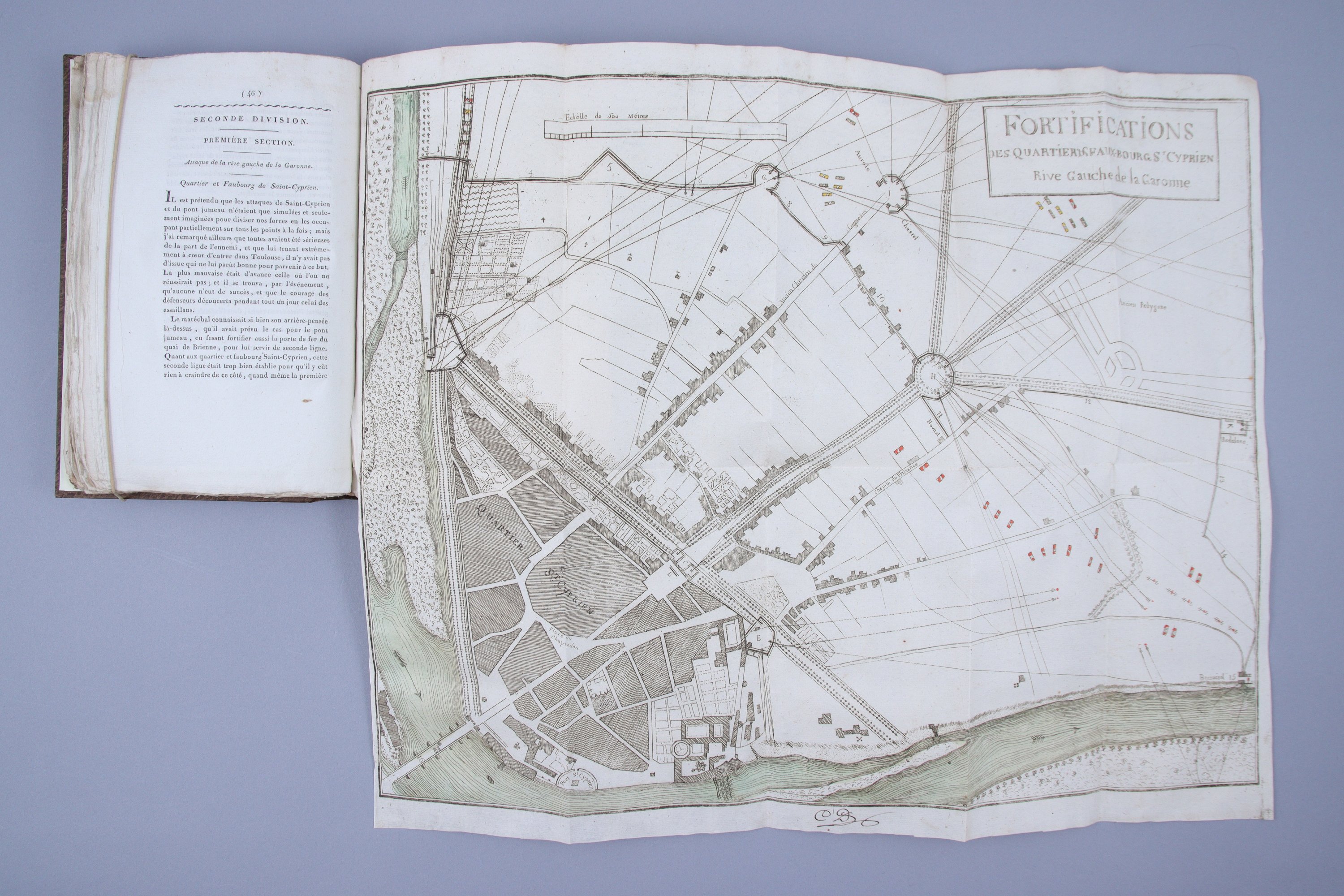Seule édition, peu courante.. Elle est illustrée de 5 cartes ou plans hors-texte rehaussées à la gouache, dont 4 dépliantes , et d'une planche dépliante gravée en noir.