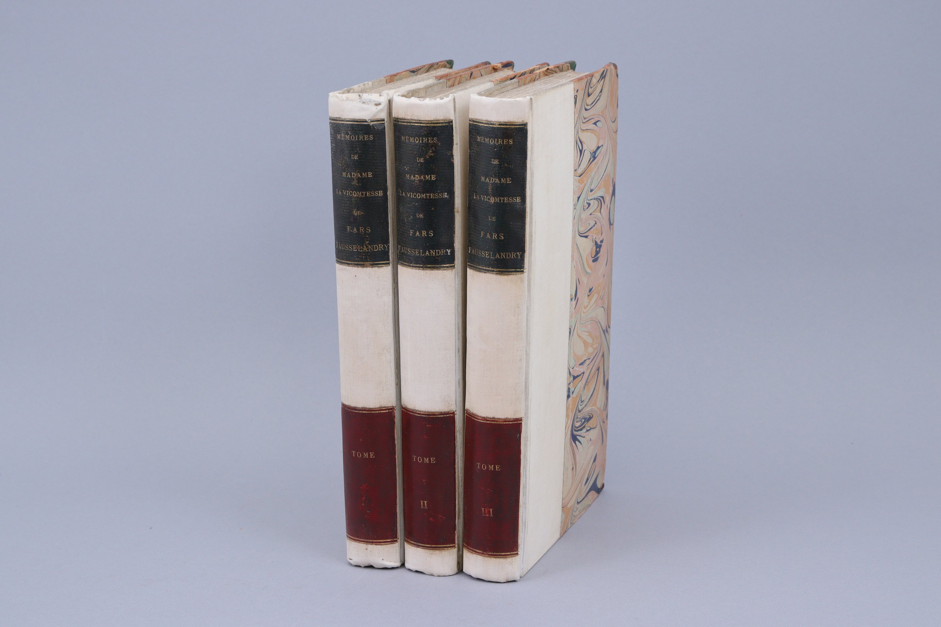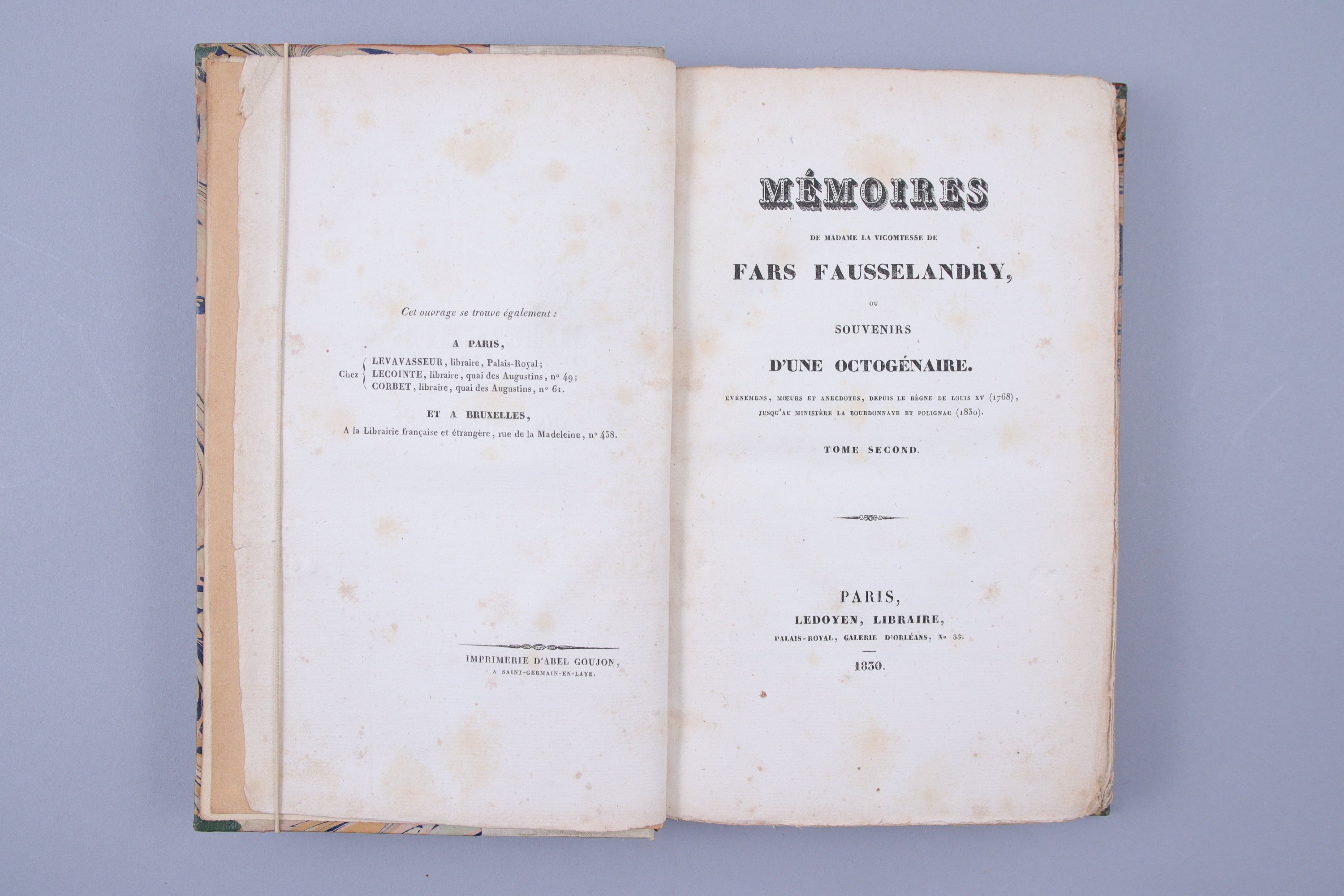 Mémoires de Madame la Vicomtesse de Fars Fausselandry, ou Souvenirs d'une octogénaire. Evénements, moeurs et anecdotes depuis le règne de Louis Xv (1768) jusqu'au ministère La Bourdonnaye et Polignac (1830) Paris, Ledoyen. 1830.