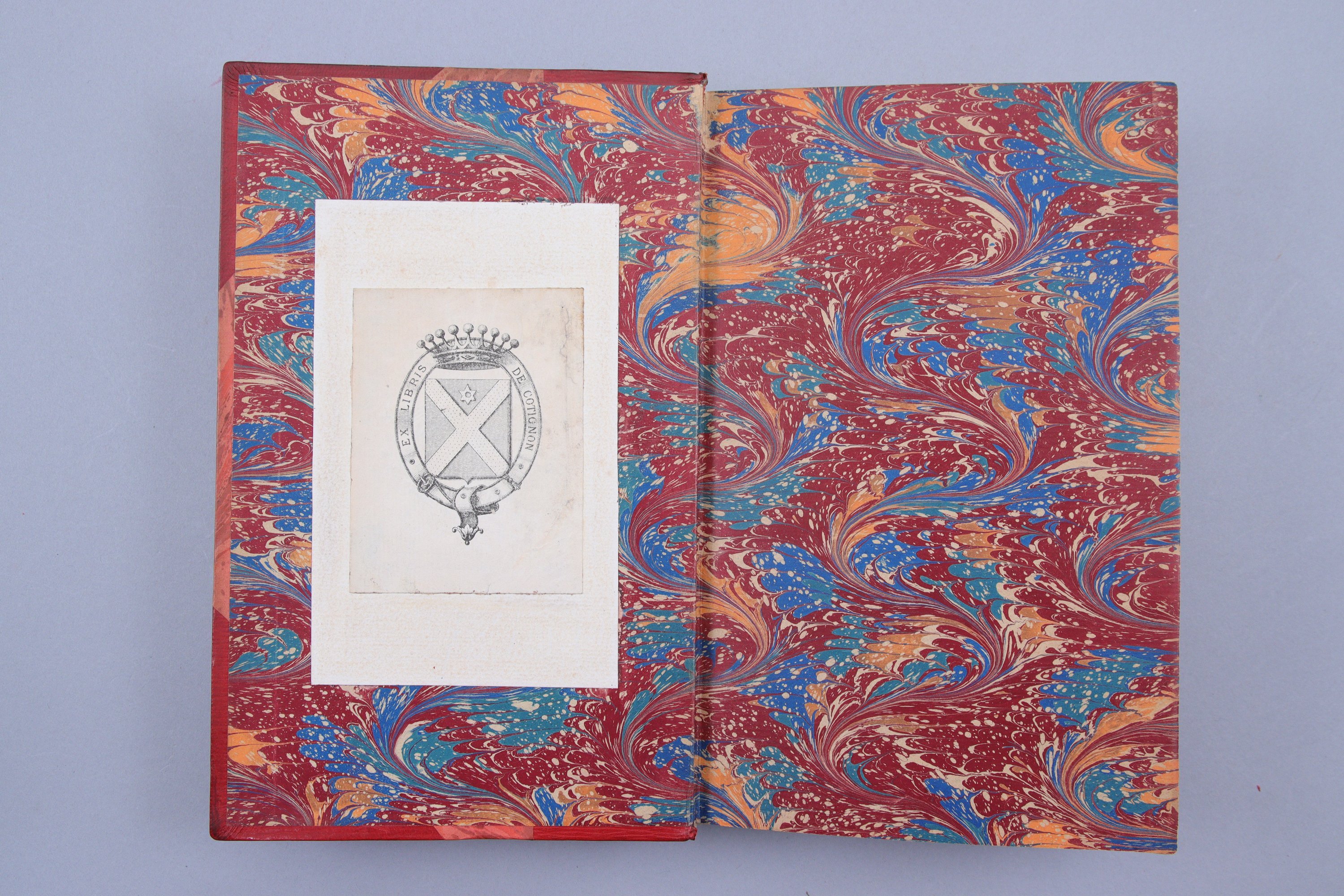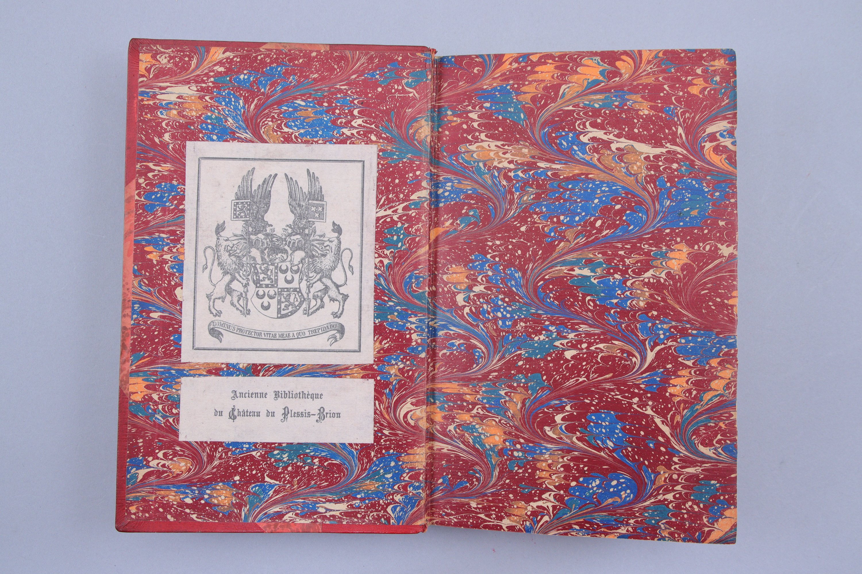 8 volumes in-8 d'environ 300 à 500 pages chacun. Reliures en 1/2 maroquin cerise à coins, couvertures conservées. Dos à 4 faux-nerfs, orné en tête et en queue d'un superbe décor de grecques, frappé en son centre d'un écusson à froid ; tête dorée. Reliures établies vers 1900, signées Durvand. Très bel exemplaire en élégantes reliures uniformes de Lucien Durvand (1852-1924).