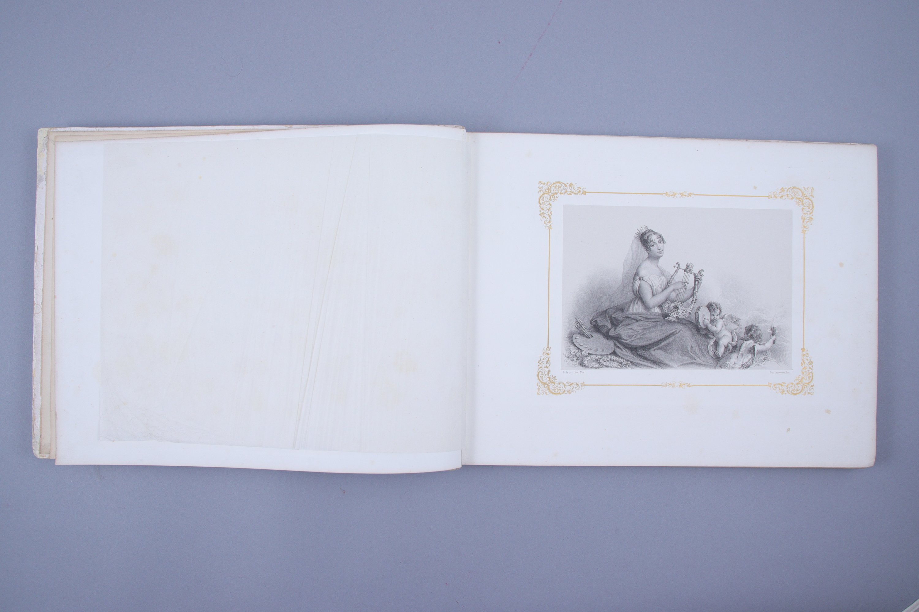 Charmant ouvrage. 7 chromolithographies hors-texte, de toute fraîcheur, et 6 lithographies en noir d'après les tableaux d' Hortense de Beauharnais, fille de Joséphine, reine de Hollande de 1806 à 1810, et mère de Napoléon III. . Et 7 chromolithographies de toute fraîcheur, protégées par des serpentes de Chine.