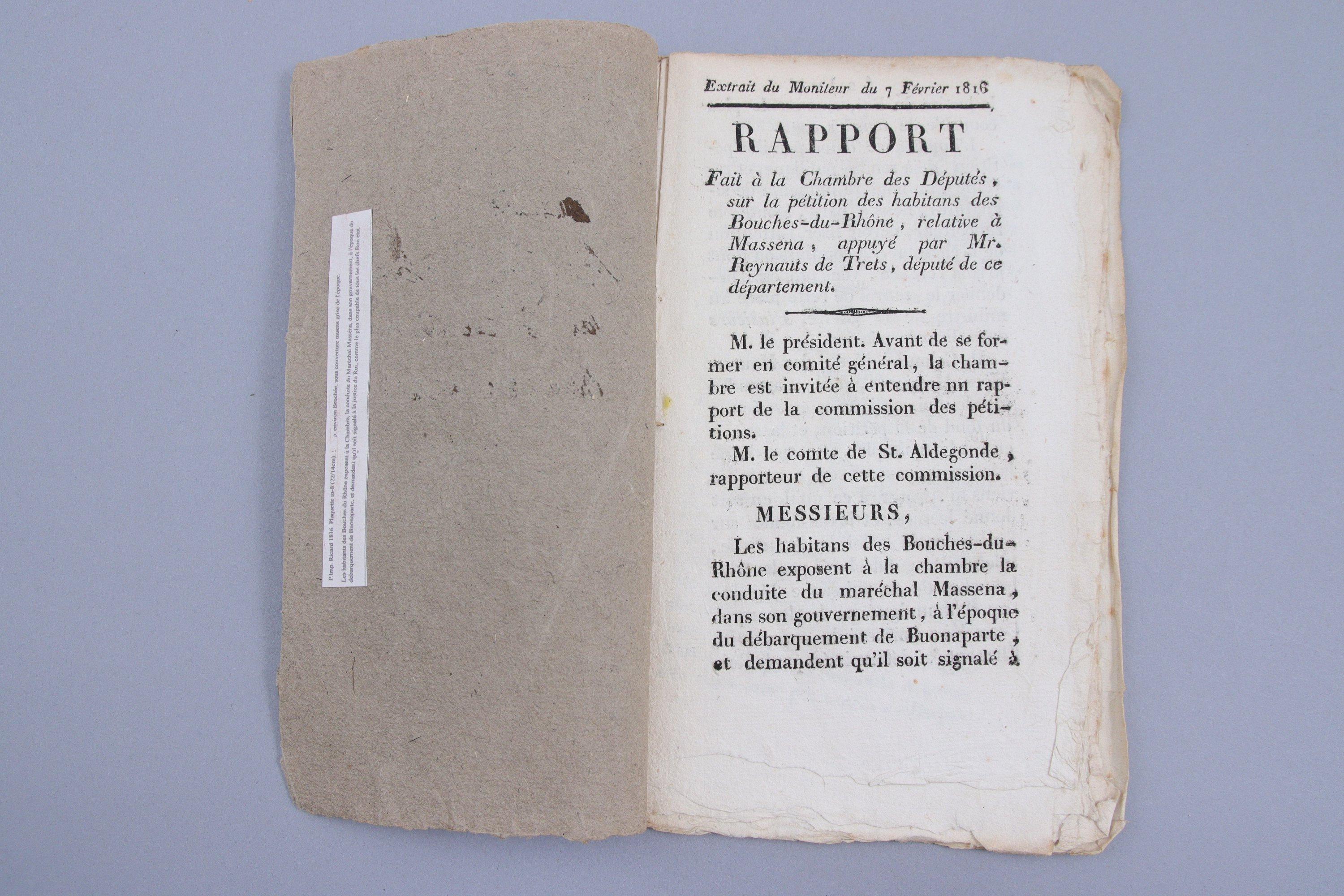 - Rapport fait à la Chambre des Députés sur la pétition des habitans des Bouches du Rhône relative à Masséna, appuyé par M. Reynauds de Trets, député de département.