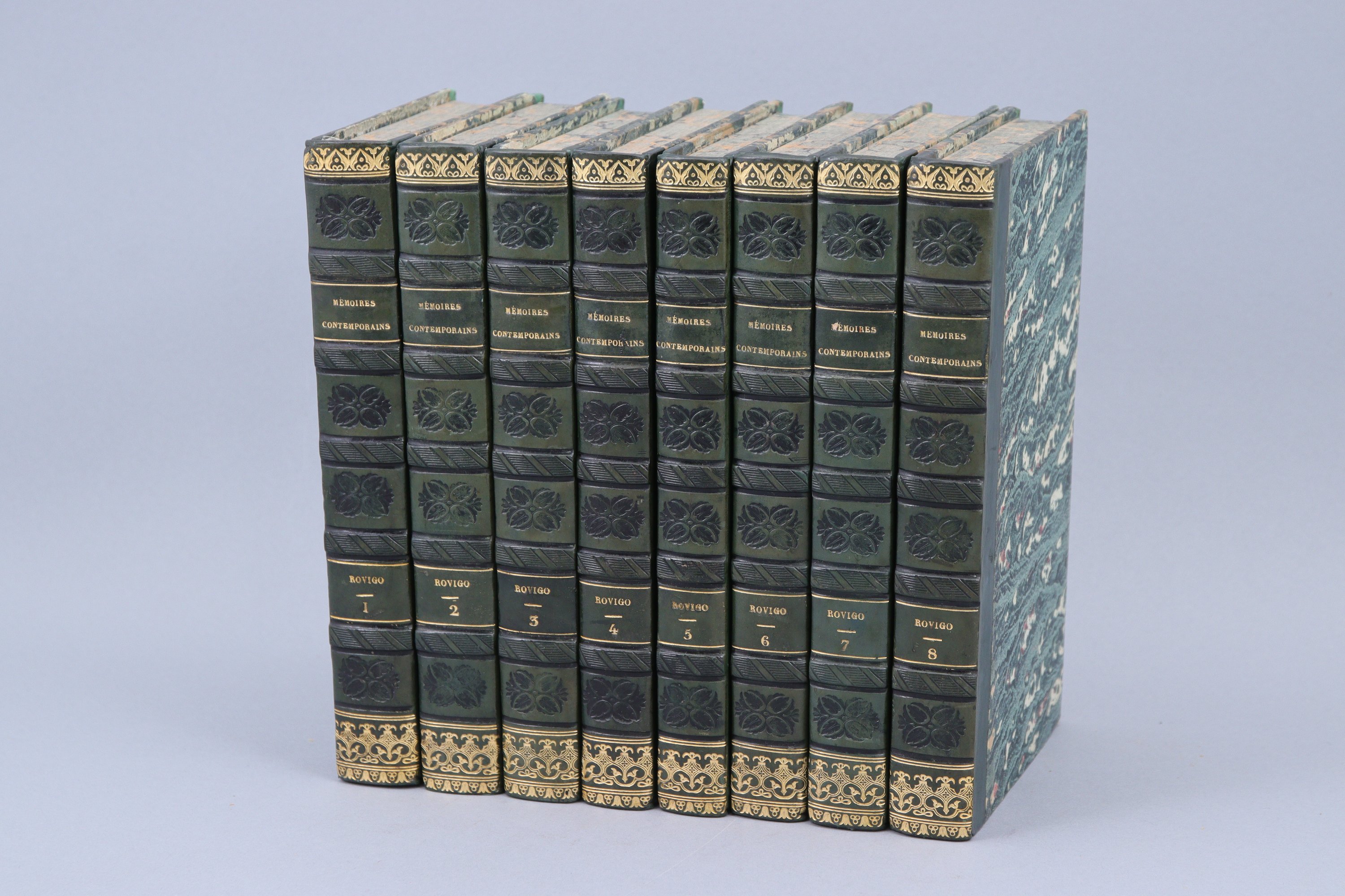 8 volumes in-8. Très fines reliures romantiques en 1/2 veau vert bouteille ; dos à 5 faux nerfs soulignés d'un fer à filets frappé à froid ; dans les entre-nerfs, large fer à décor de palmes frappé à froid ; décor à l'or en tête et en queue ; titres et tomaisons frappés directement sur le 2ème et le 5ème caisson. Tranches mouchetées.