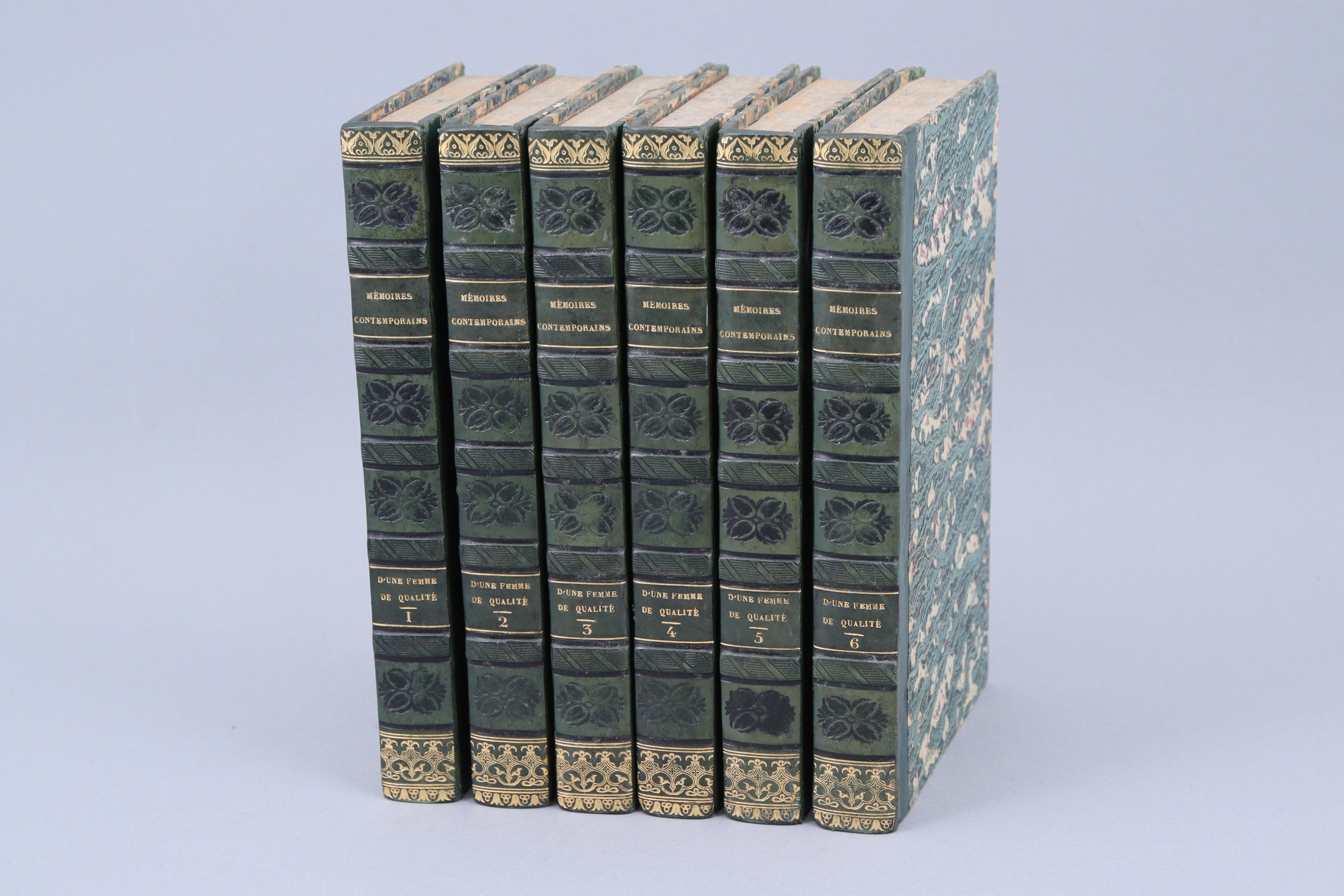 6 volumes in-8. Très fines reliures romantiques en 1/2 veau vert bouteille ; dos à 5 faux nerfs soulignés d'un fer à filets frappé à froid ; dans les entre-nerfs, large fer à décor de palmes frappé à froid ; décor à l'or en tête et en queue ; titres et tomaisons frappés directement sur le 2ème et le 5ème caisson. Tranches mouchetées