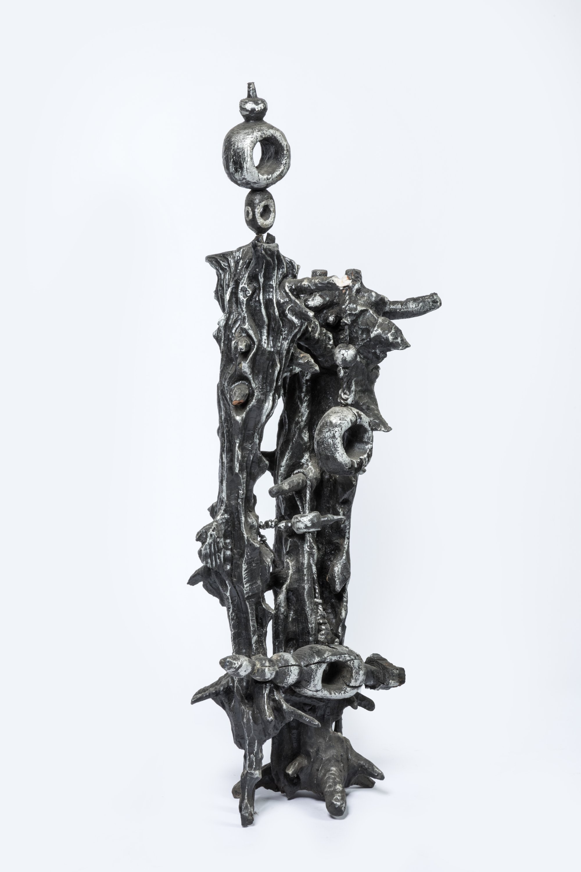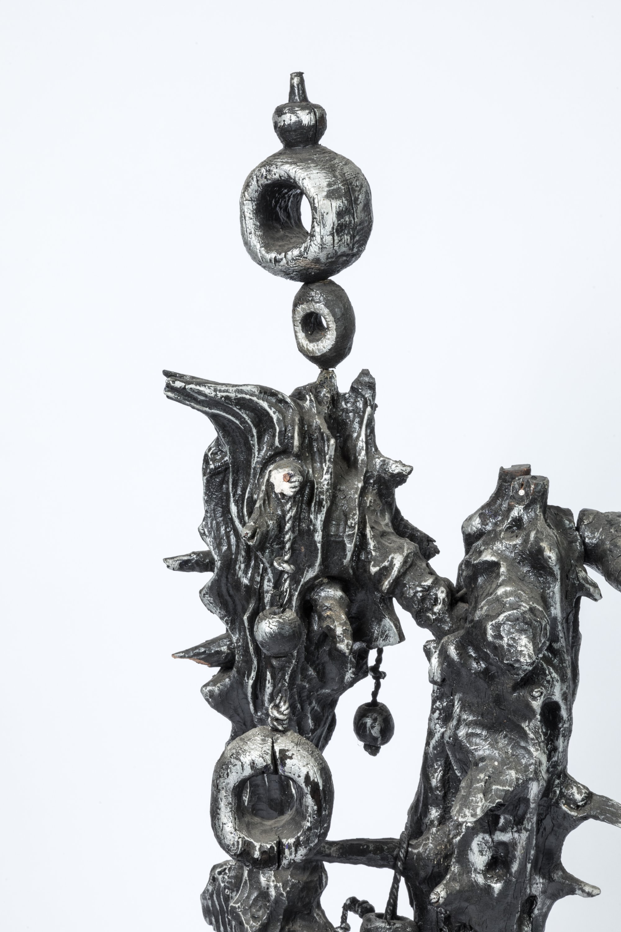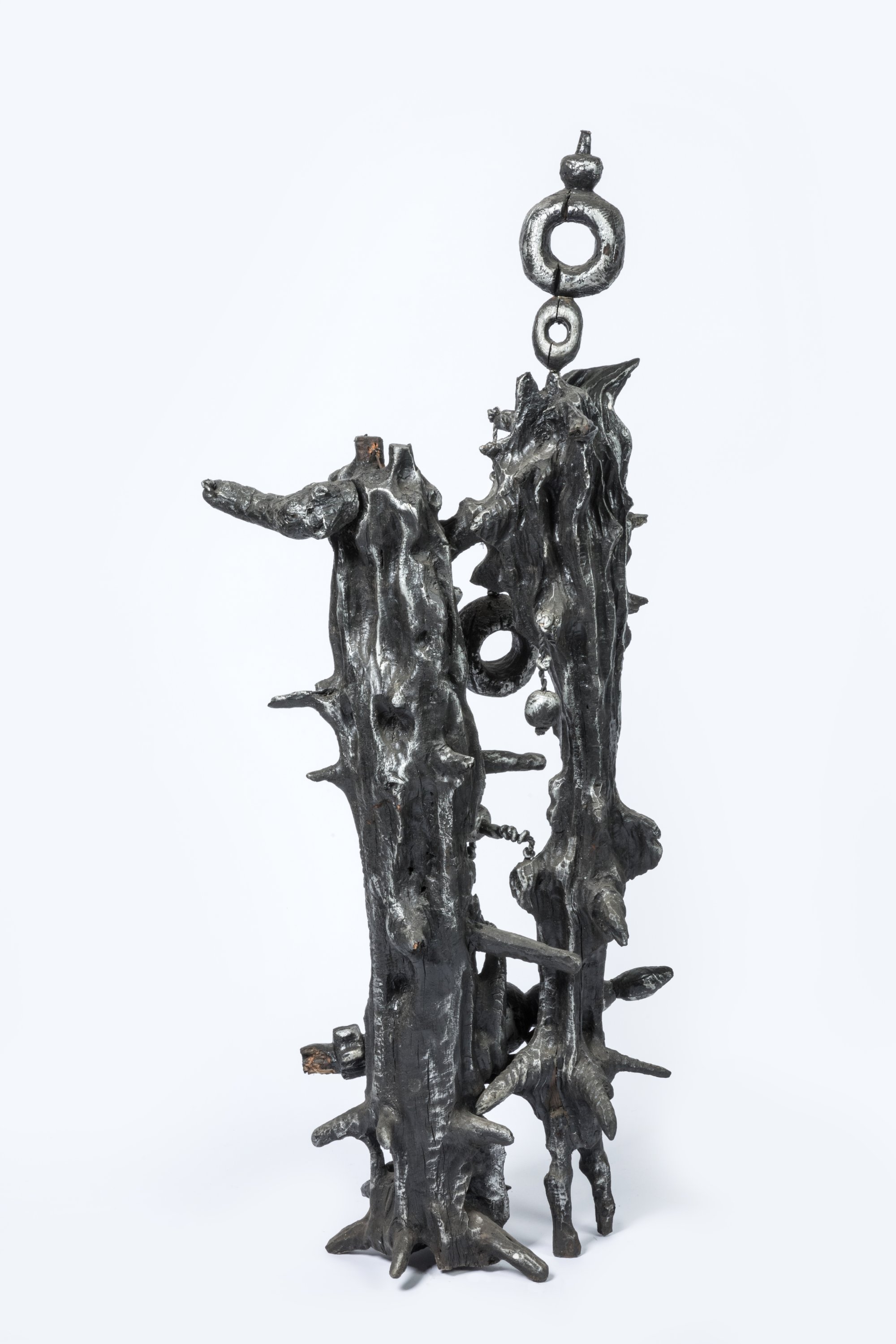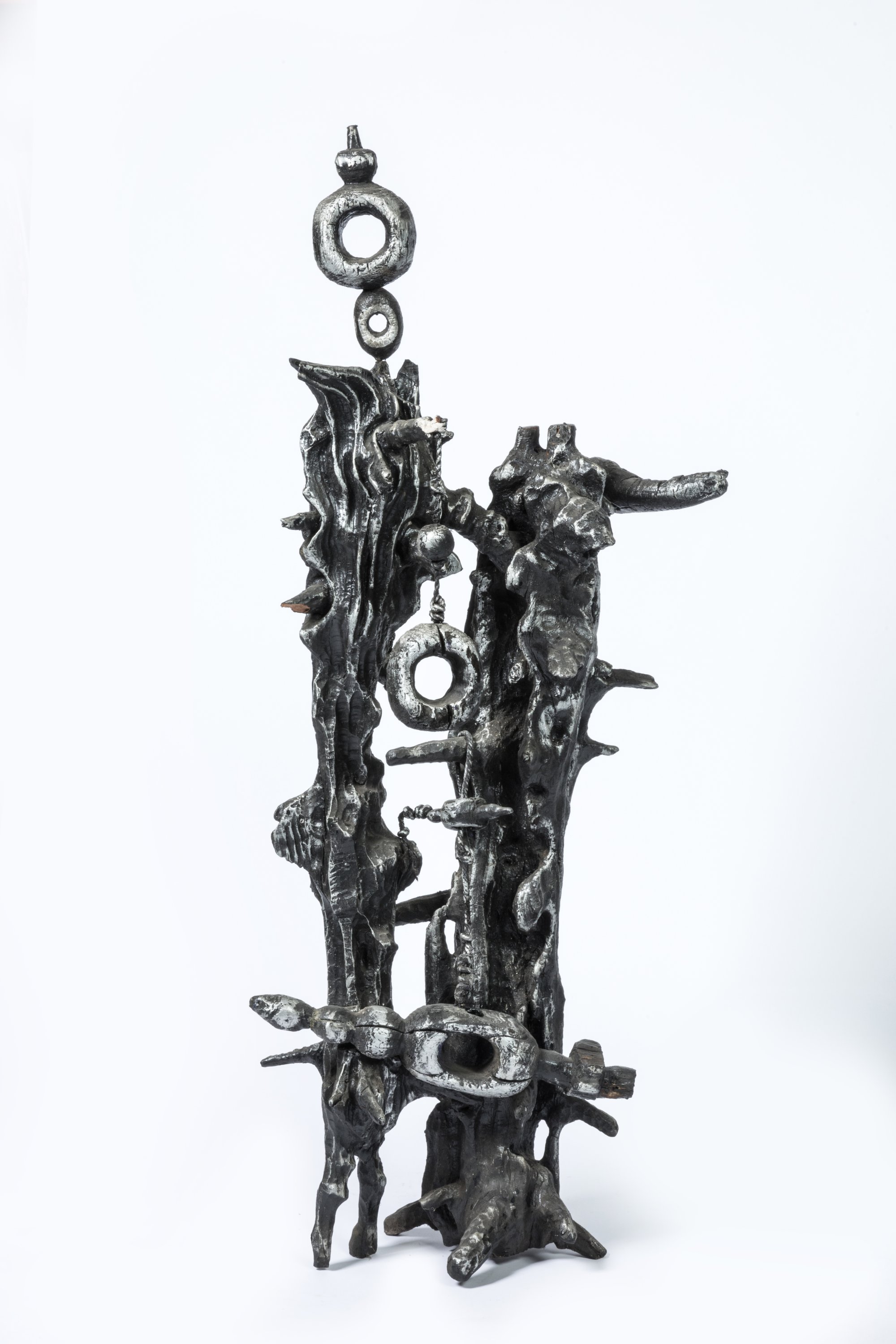 Bois brûlé, sculpté et peint, corde. Un élément mobile détachable