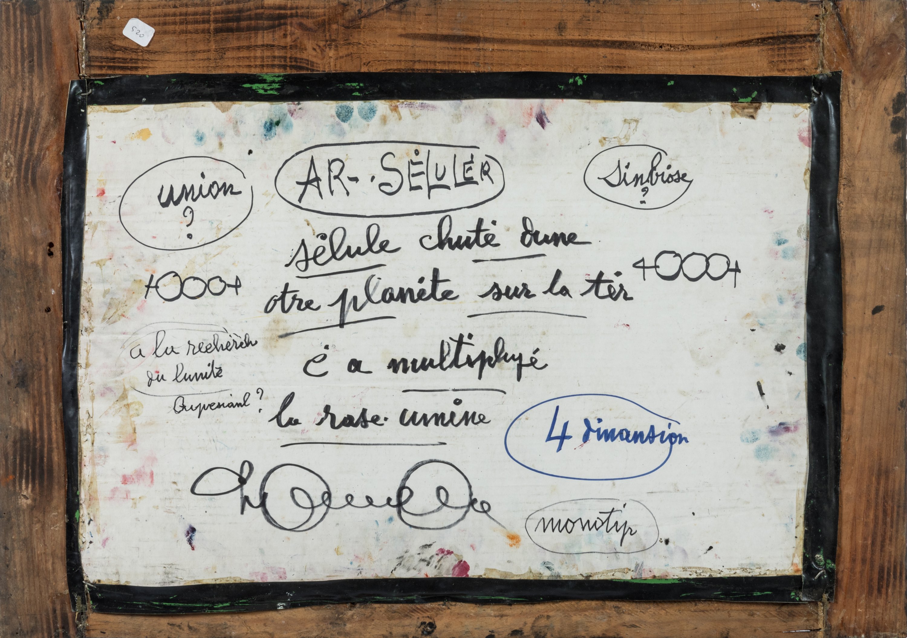 Signé. Contresigné, titré et légendé au dos: "union? sinbios? a la recherch de lunité / 4 dimension"