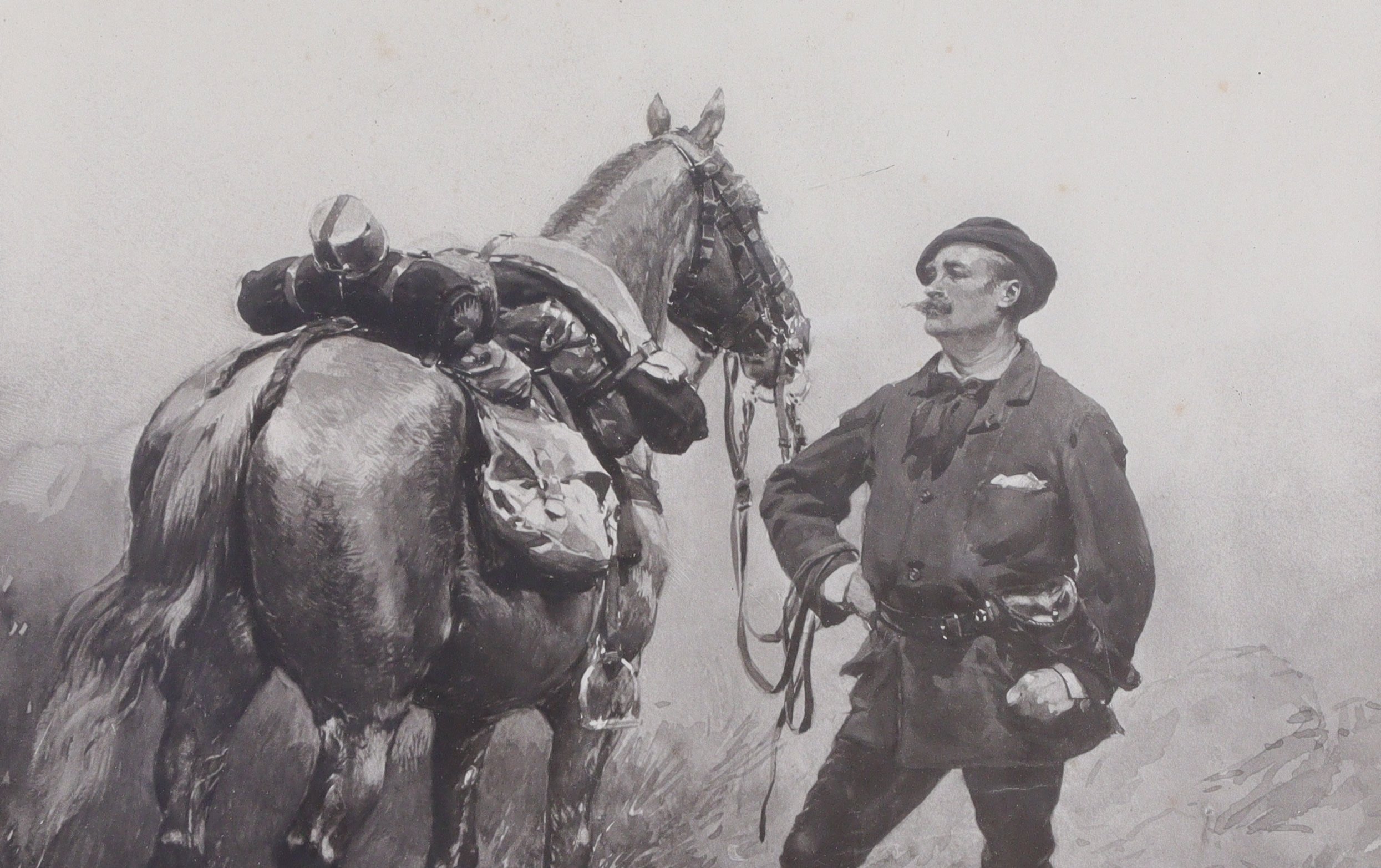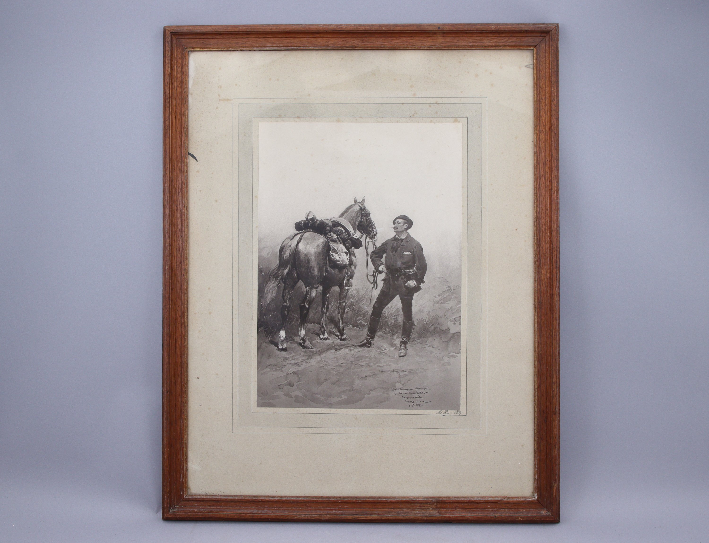 - D'après Edouard Detaille, Homme et son cheval, photogravure, marquée "Souvenir du pays de ... / à Madame Berni Bell... / témoignage d'amitié / Edouard Detaille / 31 Xbre / 1882". Haut. 43 Larg. 30,5 cm. Cadre en bois mouluré. Haut. 74,5 Larg. 59,5 cm.