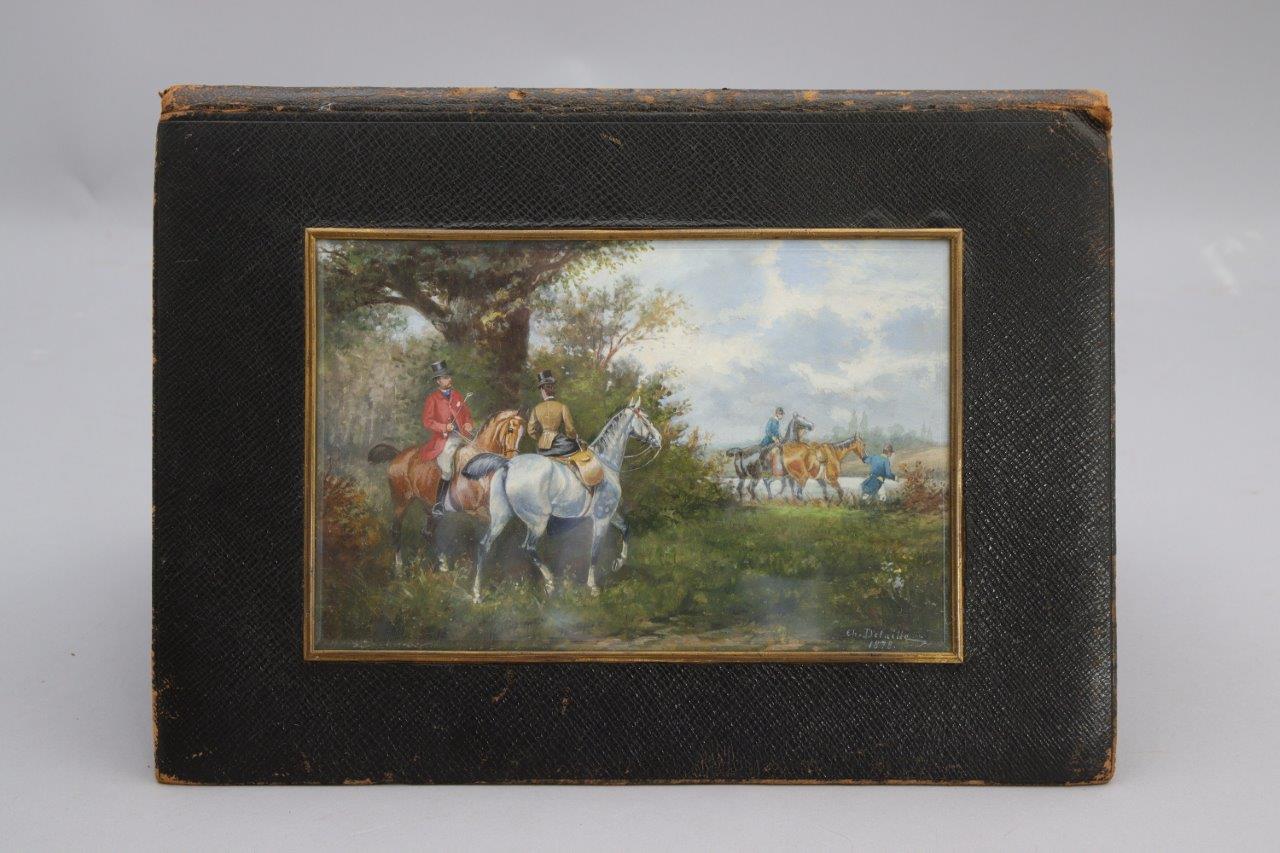 - Charles Detaille (Français, 1852-1894), Scène de chasse à courre, 1878, aquarelle signée et datée en bas à droite. Haut. 15,5 Larg. 23,5 cm. Présentée dans un sous-main en cuir noir, marqué "Tonnel 12 rue de la Paix" (Haut. 26 Larg. 36 cm, usures) ;