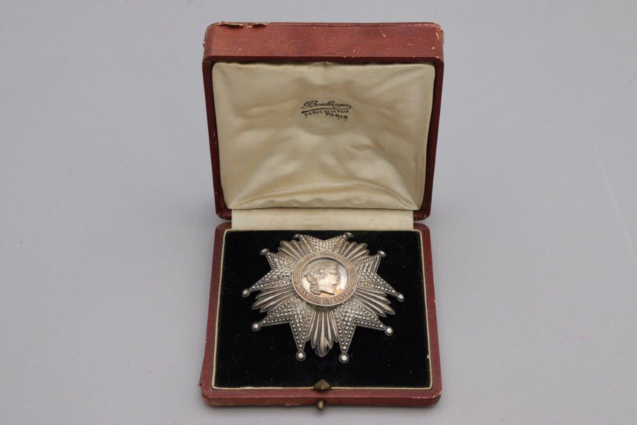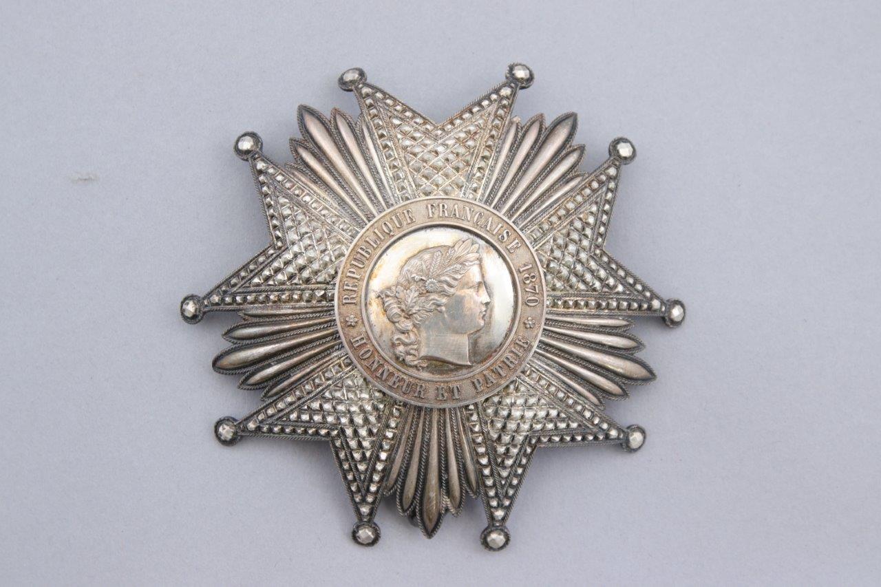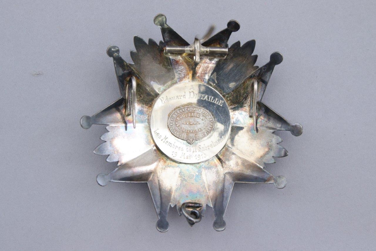 - sa plaque de la Légion d'Honneur en argent, modèle 1870. Marquée au revers "A Edouard Detaille / Les membres de la Sabretache / 19 mai 1910". Orfèvre: Boulanger, 24 rue de la Paix, Paris. Dans son écrin marqué "Les membres / de la Sabretache / a / leur chef président / Edouard Detaille / membre de l'Institut / 19 mai 1910" ;