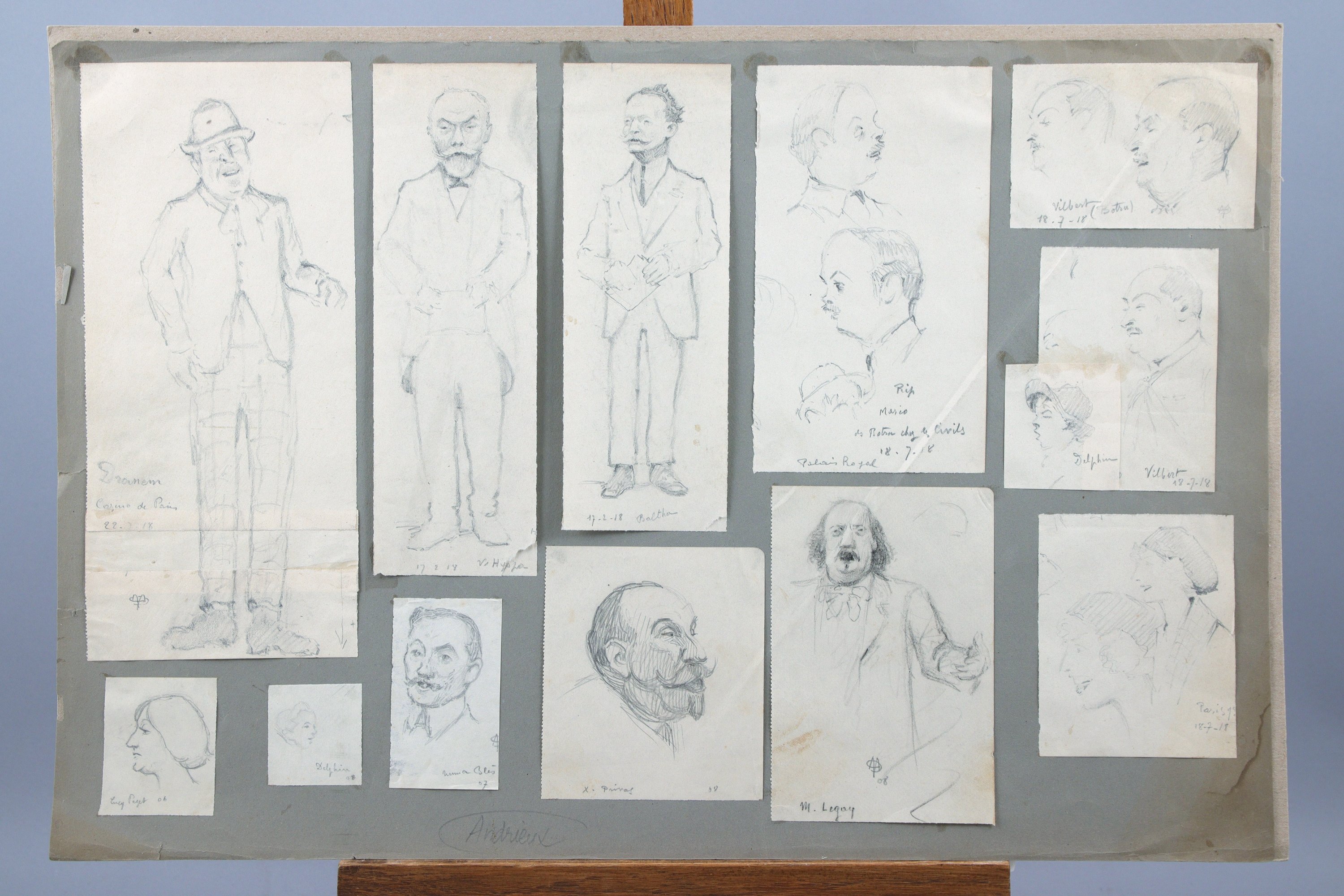 Portraits d'Armand Ménard (acteur, 1869-1935), dit Dranem ; Vincent Hypsa (acteur, écrivain et compositeur, 1865-1938 ; Baltha, Rip (parolier, s.d.) ; Henri Vilbert (acteur, 1870-1926) ; Delphin Sirvaux (acteur, 1882-1938) dit Delphin ; Lucy Pezet (interprète) ; Numa Blès (chansonnier, 1871-1917) ; Xavier Privas (chansonnier, 1863-1927) ; Marel Legay (chansonnier, 1851-1915 et Portrait de femme.
