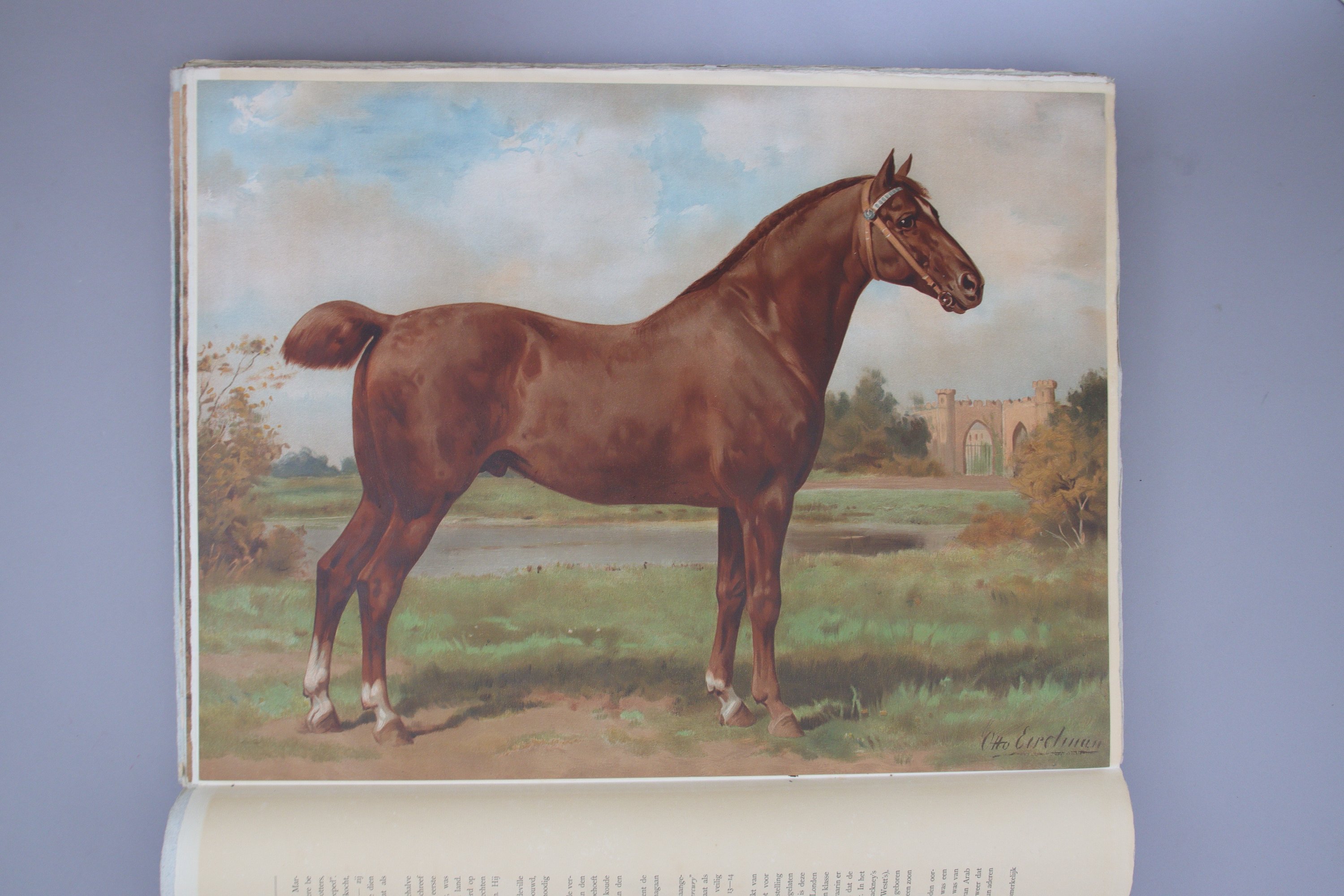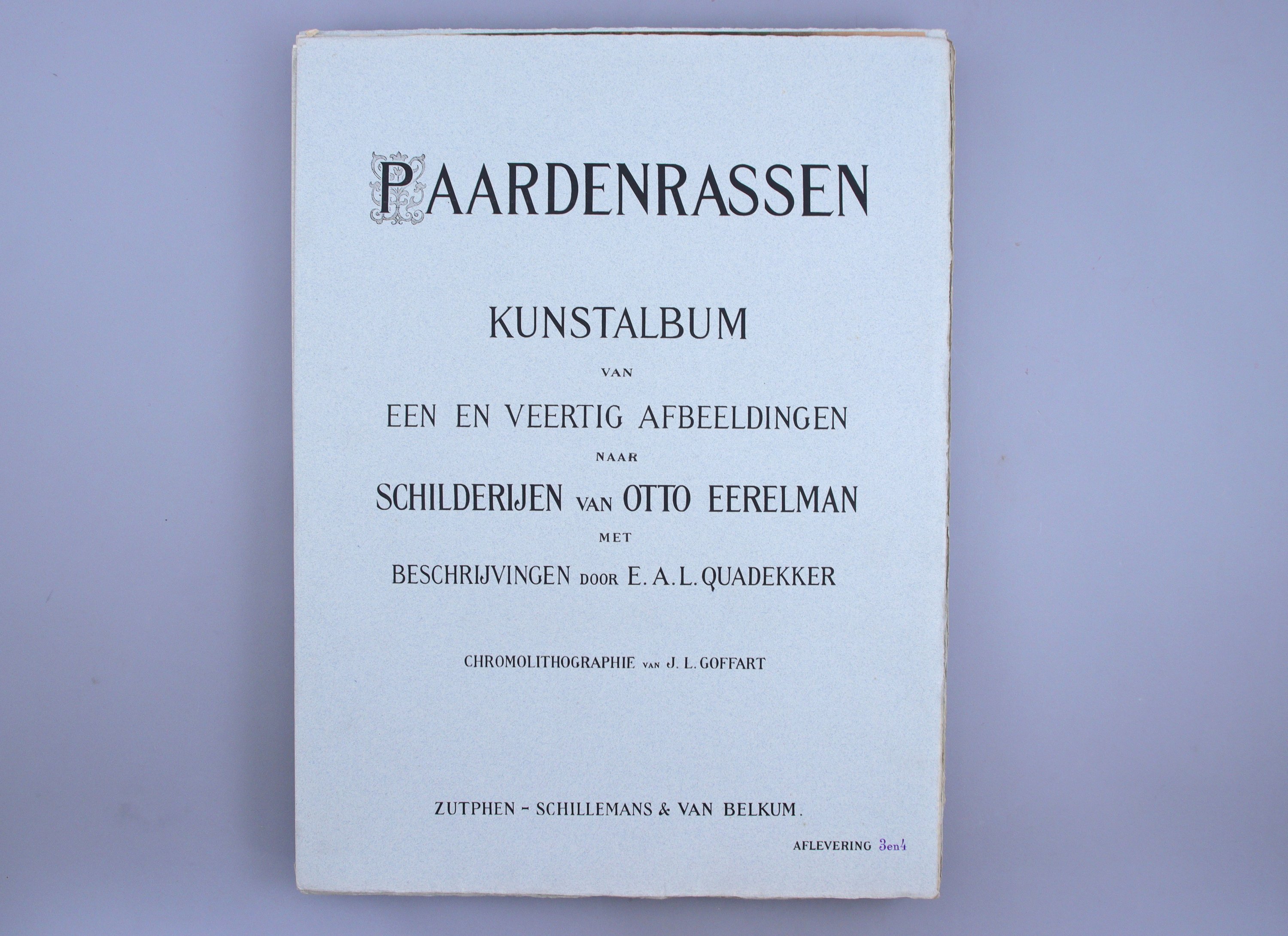 Peintre officiel, Otto Eerelman est au service de la famille royale des Pays-Bas, livrant notamment des portraits en tenue d'équitation de la reine Wilhelmine. Il se spécialise par ailleurs dans les représentations équines, dont cet album livre un corpus intéressant de 41 races de chevaux. Afin de financer l'édition, une souscription est lancée auprès des plus importants mécènes, dont leurs Majestés la Reine et la Reine mère.