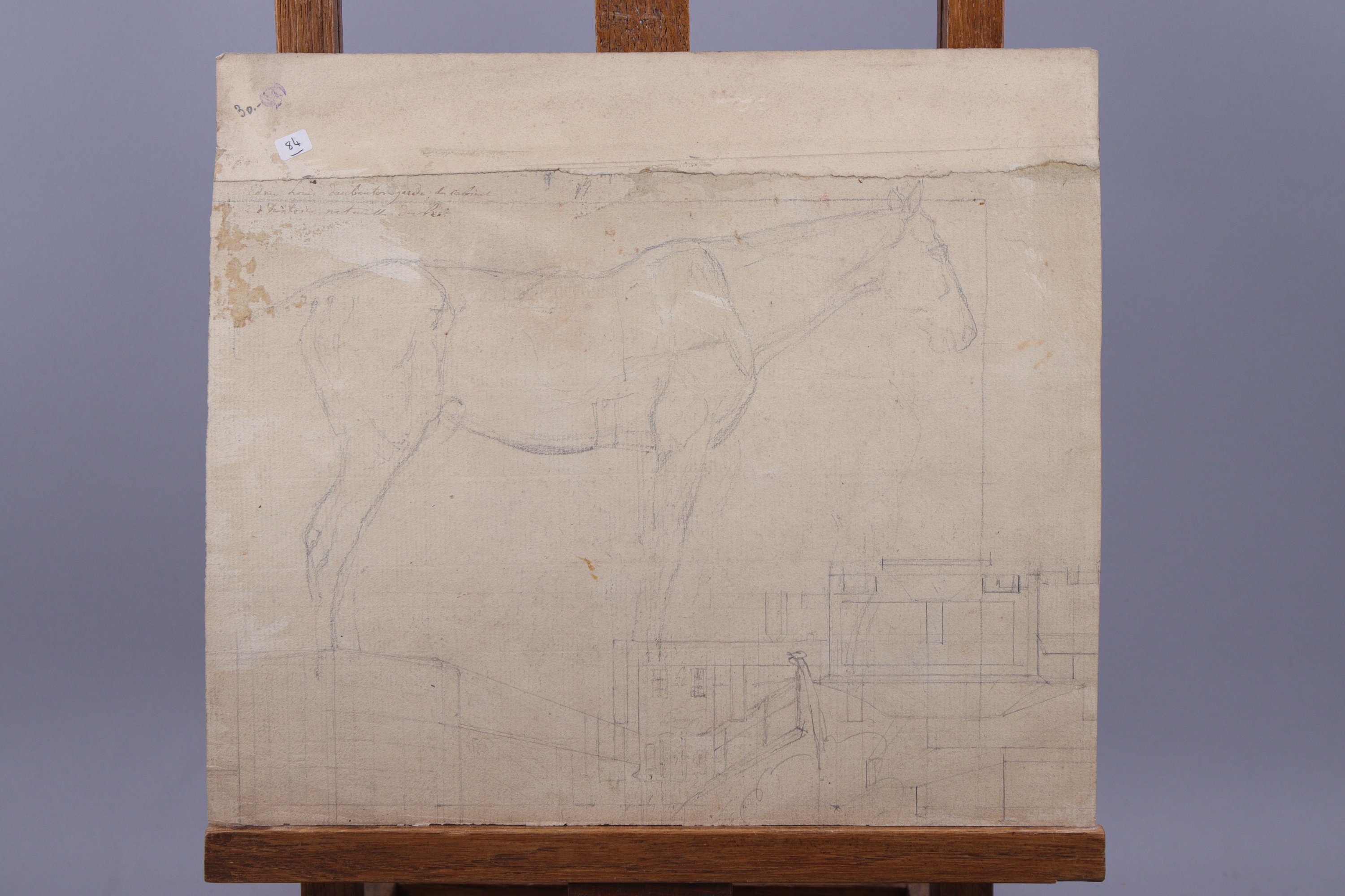 - Ecole du XIXe siècle, Eglise d'Avon près de Fontainebleau et Cheval. Dessin recto-verso. Sur une face, crayon, aquarelle et encre sur deux feuilles. Daté "21 juillet 1836" et situé en bas à gauche. Annotations de couleurs. Sur l'autre face, crayon. Haut. 28 Larg. 32 cm.