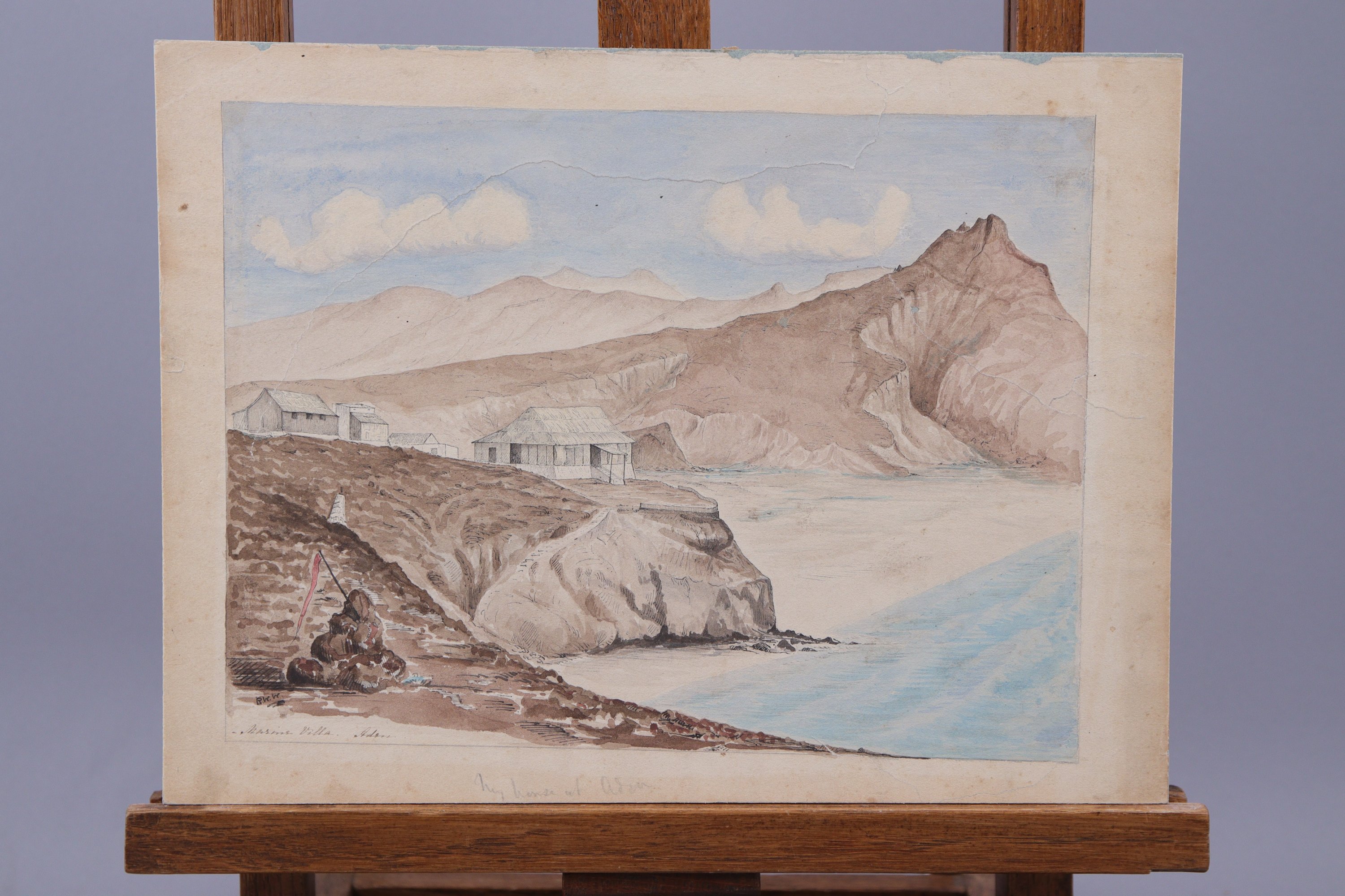 - Ecole du XXe siècle. Maisons au bord de l'eau. Encre et aquarelle sur carton. Monogrammée en bas à gauche "R.W.W" et annotée "Marine villas Adam". Haut. 22,5 Larg. 30 cm.