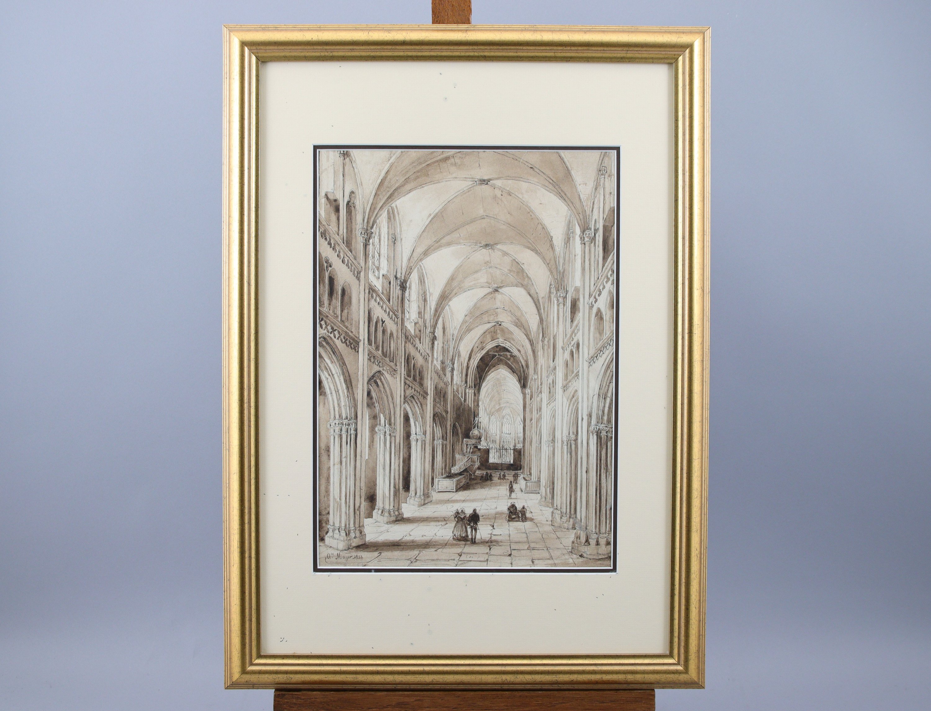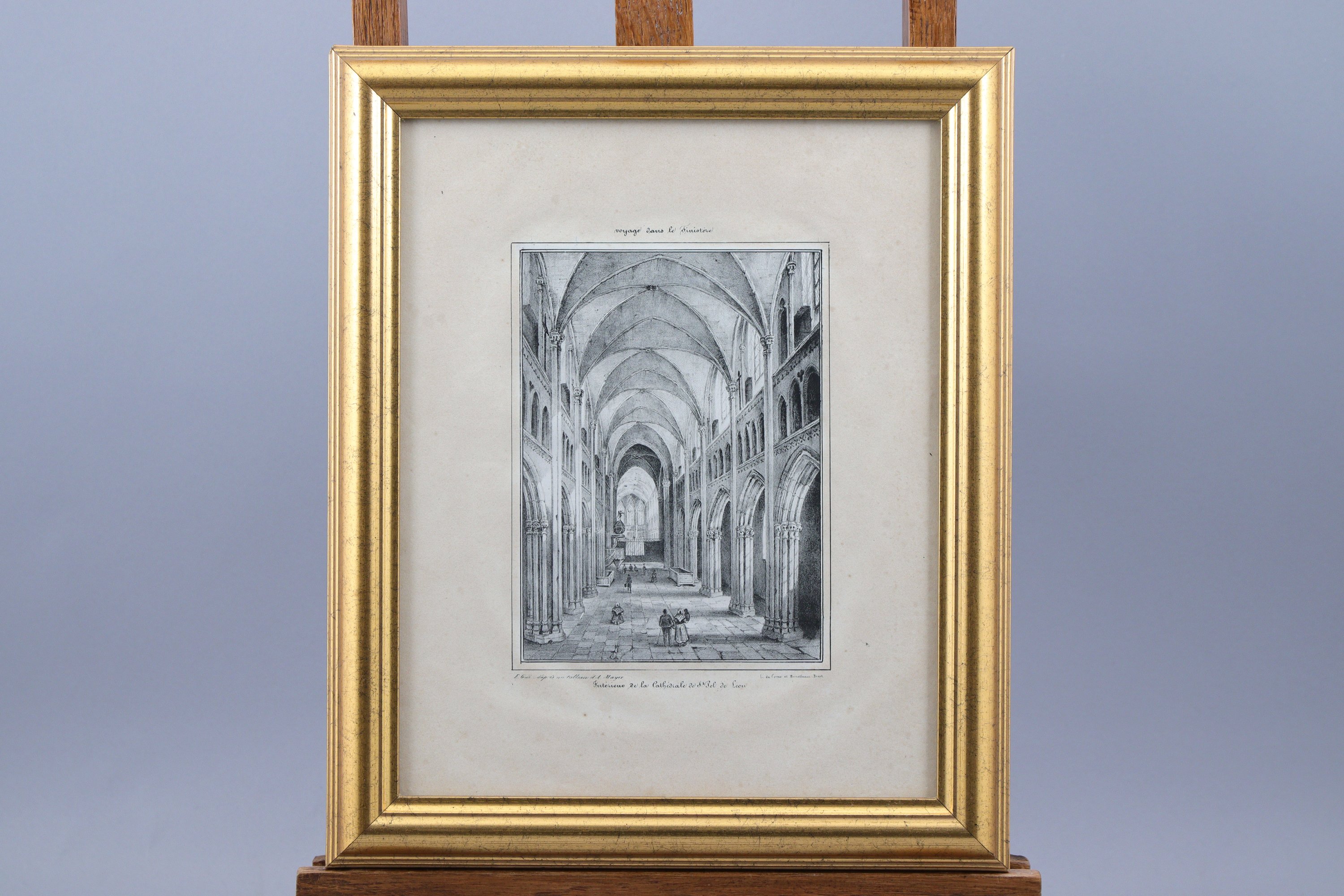 Joint: E. Gui (XIXe siècle) d'après Auguste Meyer (Français, 1805-1890), "Intérieur de la cathédrale de Saint-Pol-de-Léon", lithographie en noir. Haut. 17,5 Larg. 12,8 cm. Cadre moderne à baguettes dorées (Haut. 35,5 Larg. 29,5 cm).