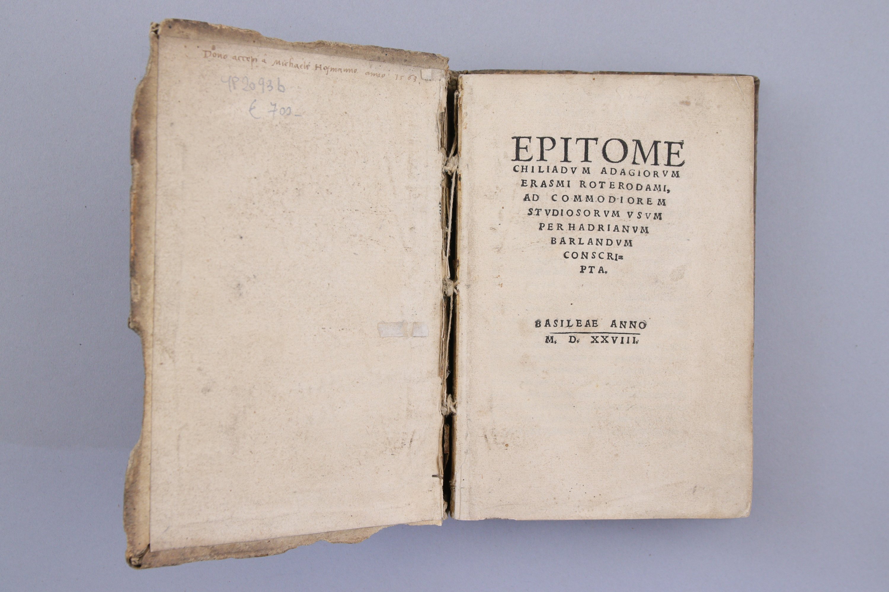 Adriaan van Baerland, philosophe et linguiste, occupe la chaire de latin au Collège des Trois Langues de Louvain, dès son ouverture en 1518. Proche d'Erasme, il écrit ce rare abrégé des Adages d'Erasme pour en faciliter l'étude, publié chez le typographe humaniste et protestant Thomas Wolff, dont la très belle marque de libraire avec sa devise en trois langues (latin, grec et hébreu) figure sur le dernier feuillet. "Il a dit qu'il se repentait de n'avoir jamais gardé le silence".