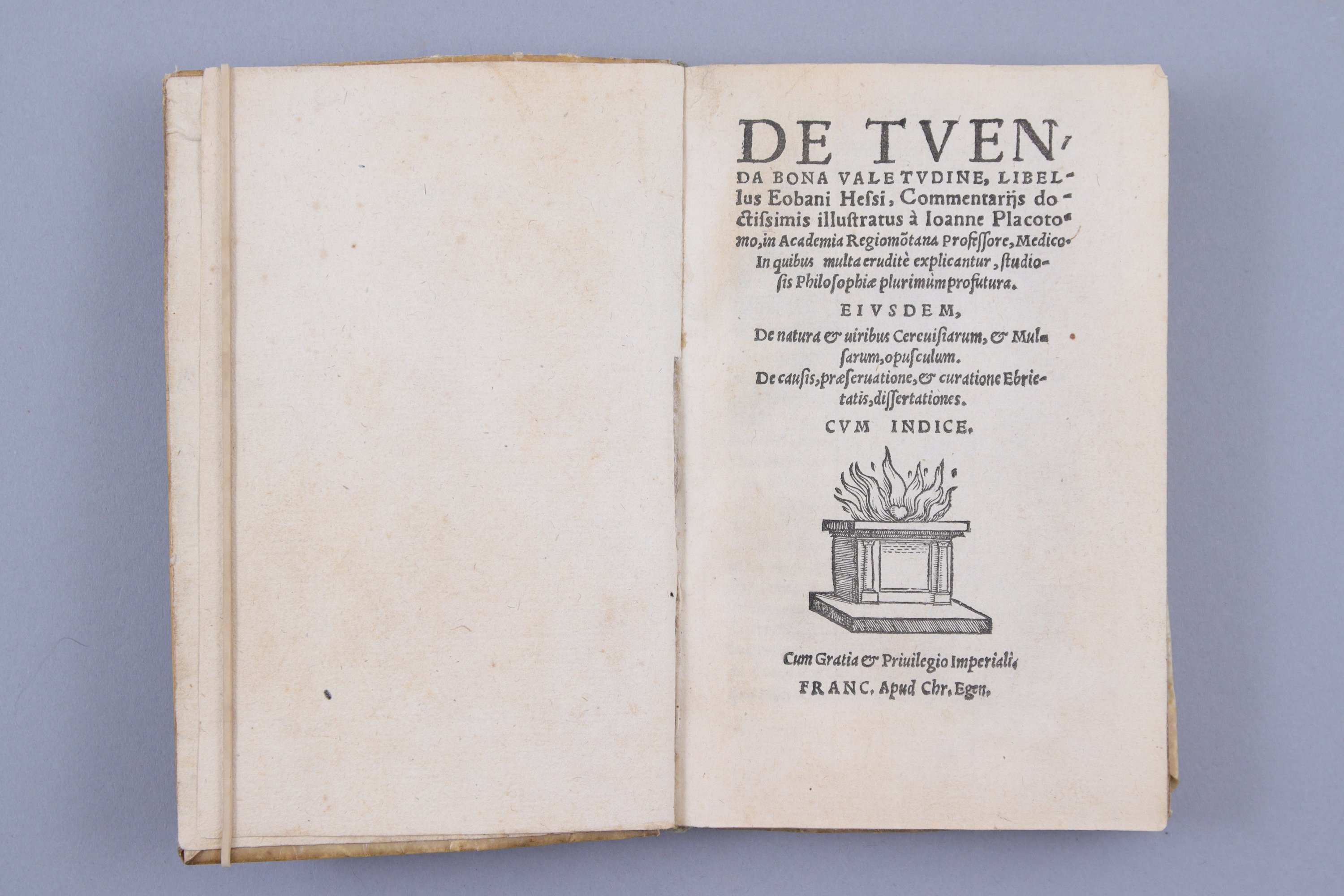 De tuenda bona valetudine libellus Eobani Hessi, commentariis doctissimis illustratus a Ioanne Placotomo... Ejusdme De natura et viribus cerevisiarum et mulsarum opusculum. De causis, praeservatione et curatione Ebrietatis dissertationes..