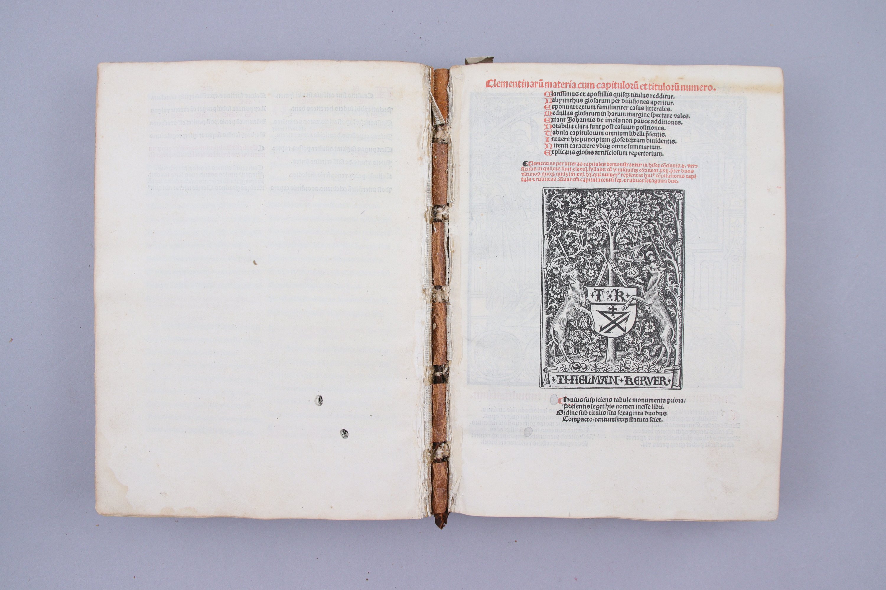 2) Clementinarum materia. Paris; Thielman Kerver, fin février 1509. . 110 feuillets + table. Bois gravé à pleine page au verso du titre. Deux galeries de vers traversent tout l'ouvrage, affectant de 2 à 4 lettres sur chaque page. (Renouard, IC, page 313, n°52)