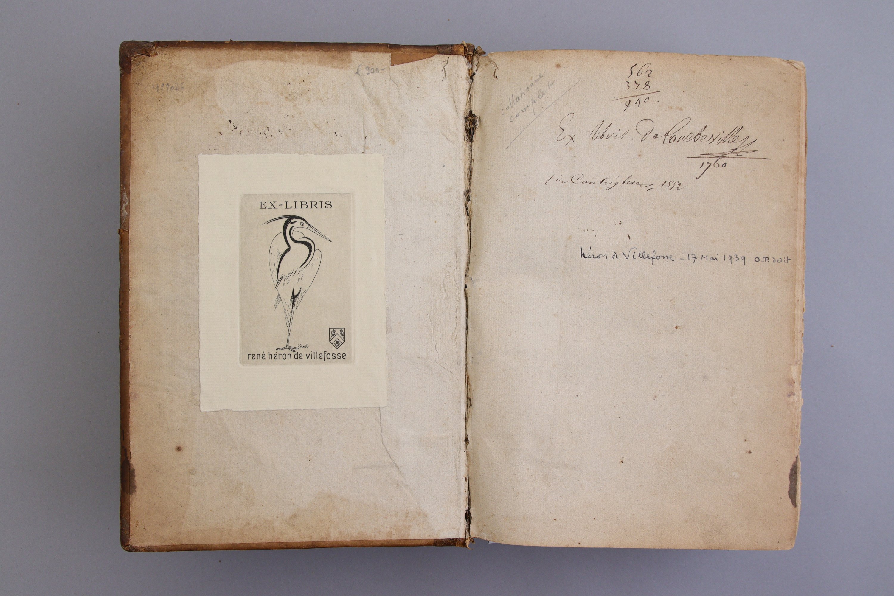 Exemplaire portant l'ex-libris gravé de l'historien de Paris Héron de Villefosse, et l'ex-libris manuscrit Courbeville, daté 1760.