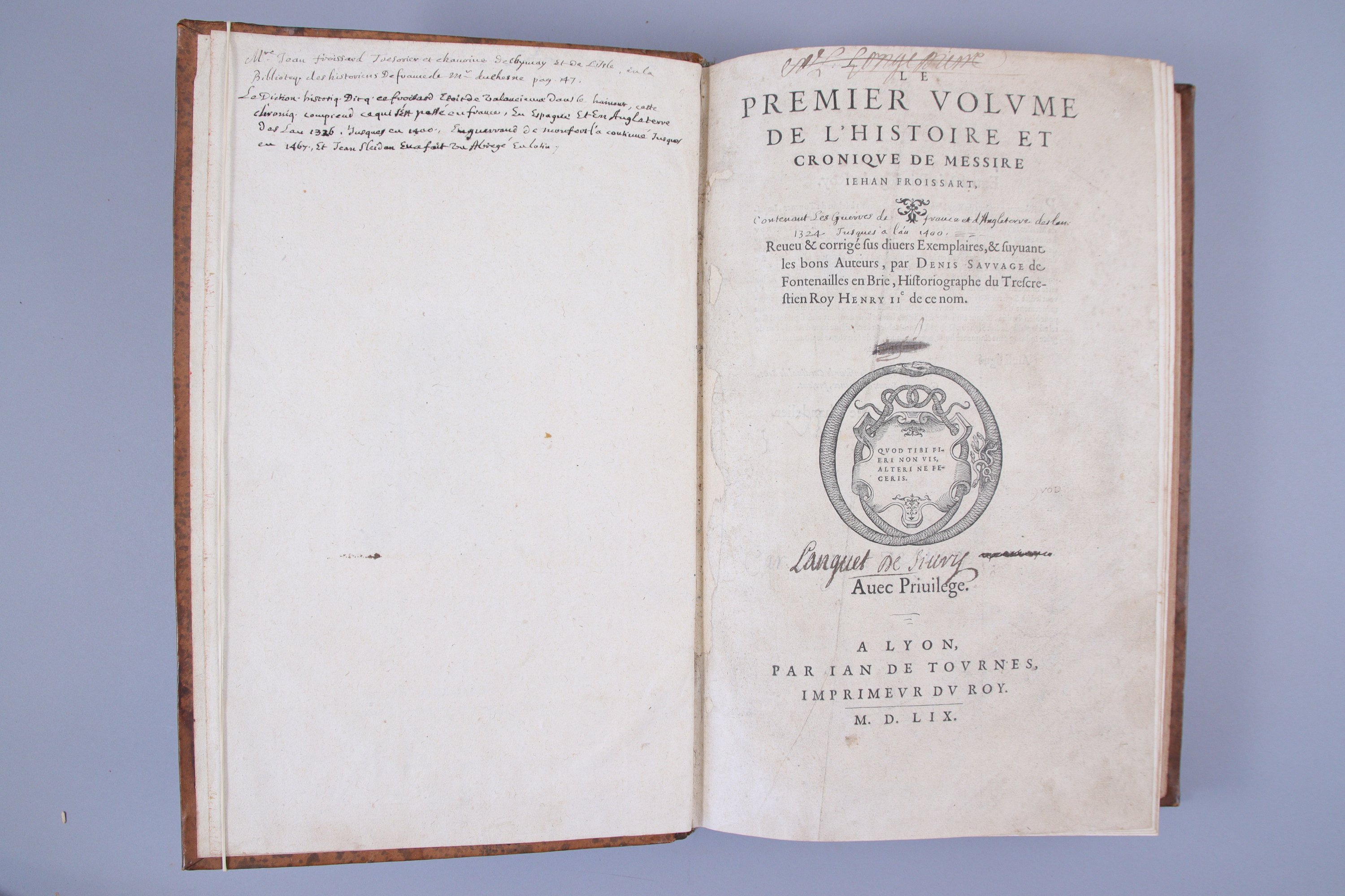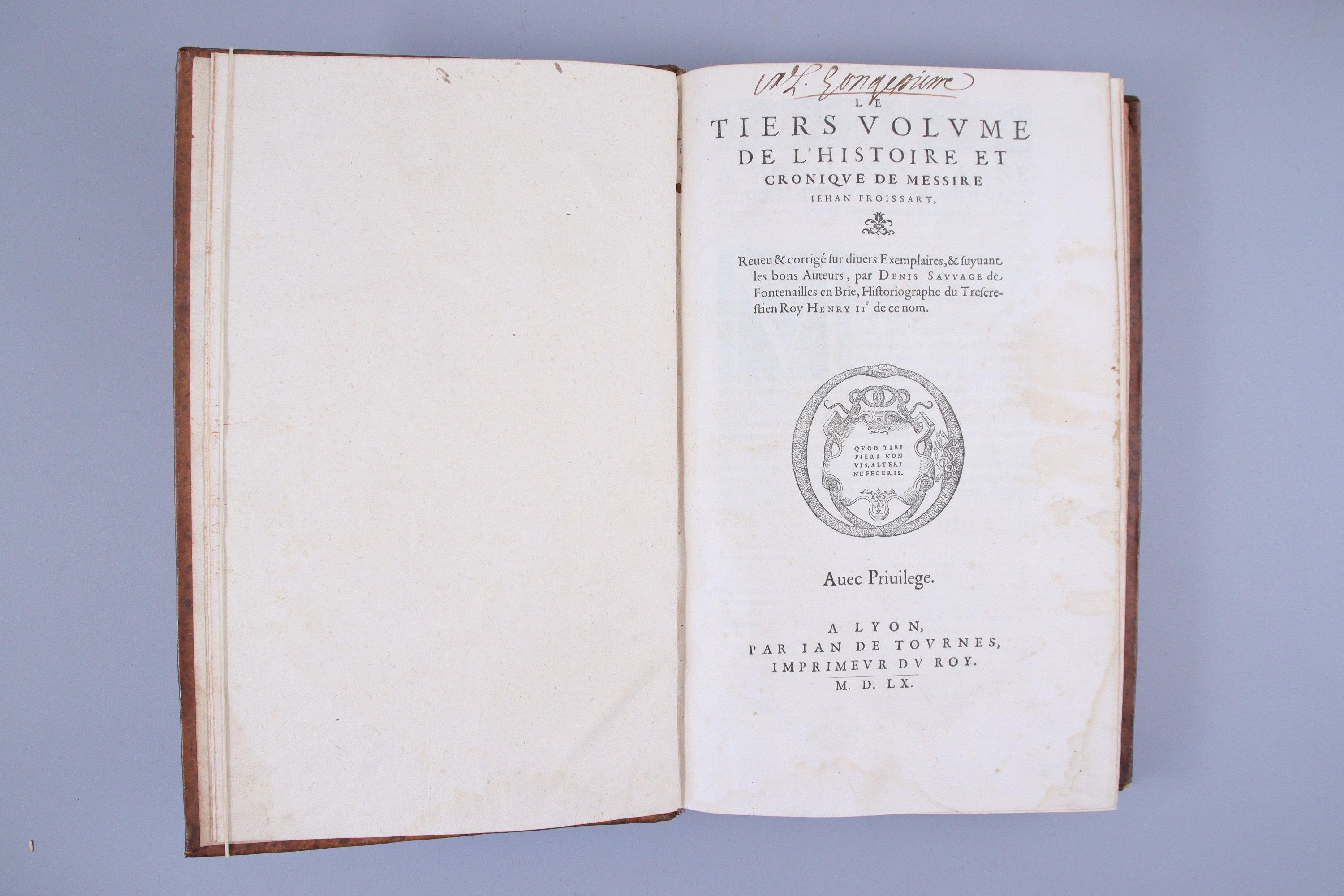 Premier (second, tiers et quart) volume de l'histoire et cronique de Messire Jehan Froissart. Reveu, et corrigé sur divers exemplaires et suyvant les bons auteurs, par Denis Sauvage de Fontenailles en Brie, historiographe du Treschrestien Henri II de ce nom..
