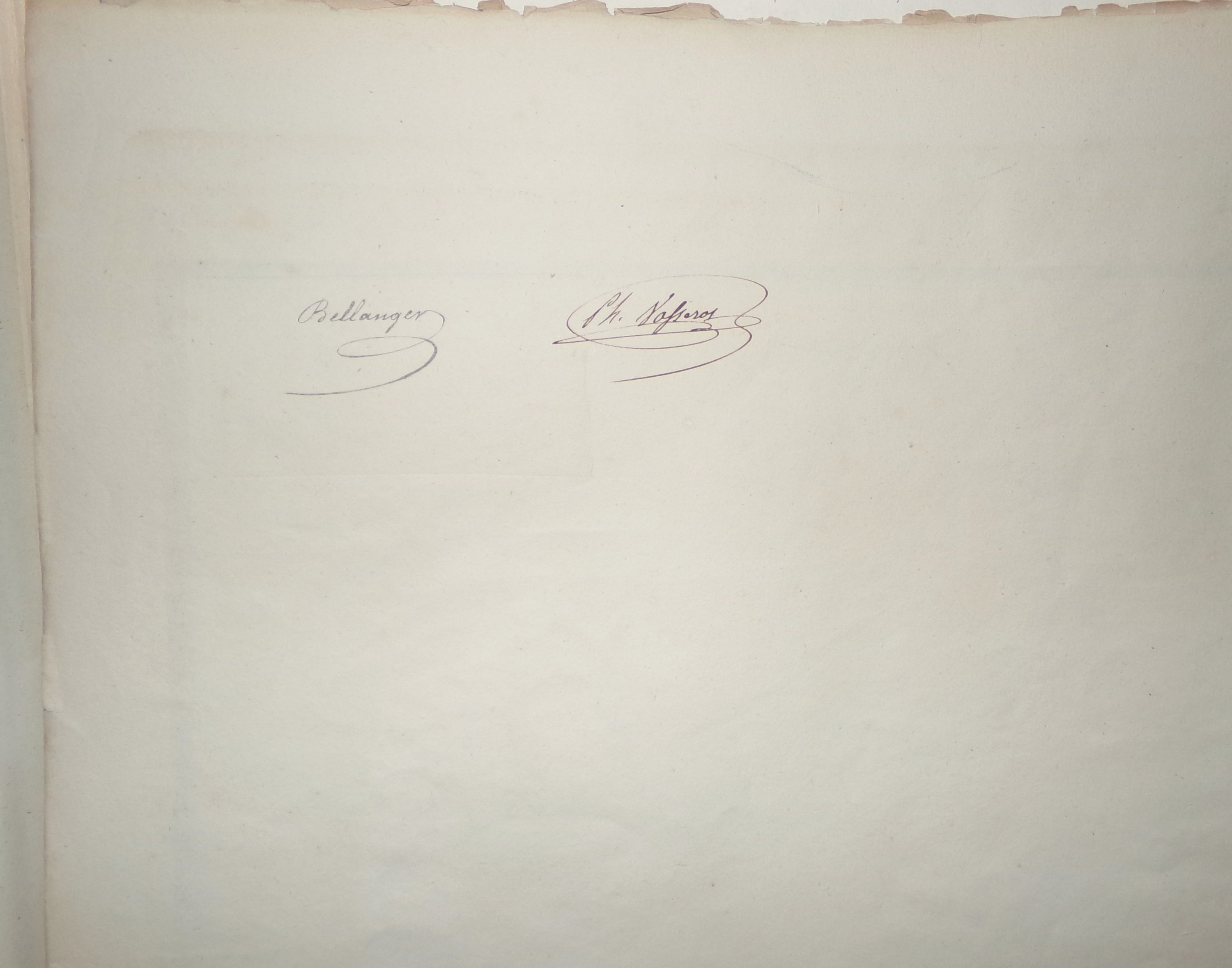 Contrecollés sur la 2e de couverture: 7 reçus de souscription signés par J.H. Bellanger et remis à M. Vallet, 1828-1830 ; et sur la 1ère page: prospectus de présentation de 1826 et tableau manuscrit détaillant la répartition numérotée par quartier et le nombre de planches pour chaque quartier.