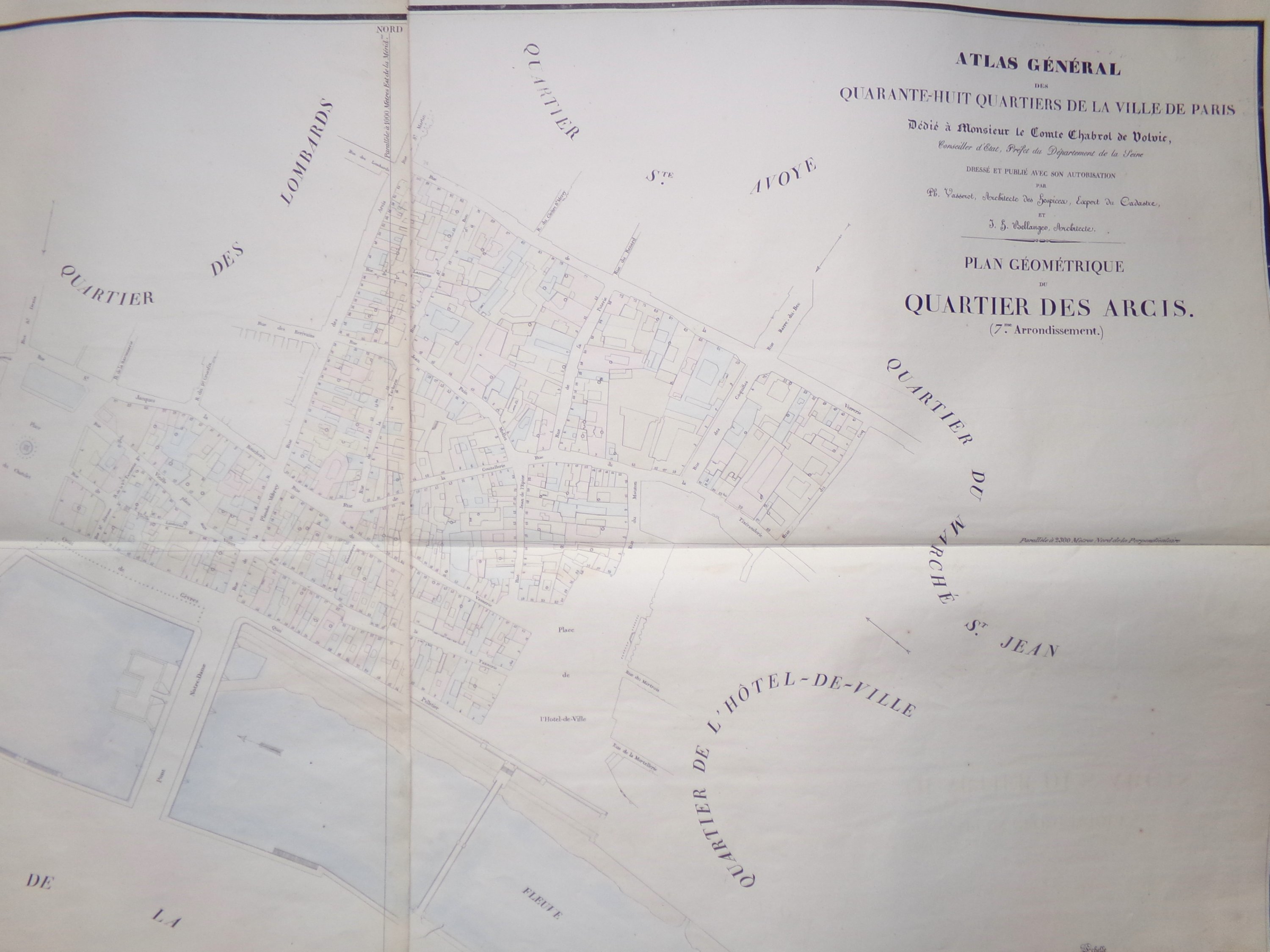 Plan détaillé de la ville de Paris dédié à M. le comte de Chabrol de Volvic, conseiller d’Etat, préfet du département de la Seine, dressé géométriquement à l’échelle d’un millimètre pour mètre, par Ph. Vasserot, architecte des hospices, expert du cadastre, et J.H. Bellanger, architecte, et comprenant la division de toutes les propriétés avec le numéro que porte chacune d’elles, la distinction des bâtiments et des cours dans les maisons particulières et le détail des monuments et établissements publics ou remarquables. Paris, chez les auteurs, [1827-1836].