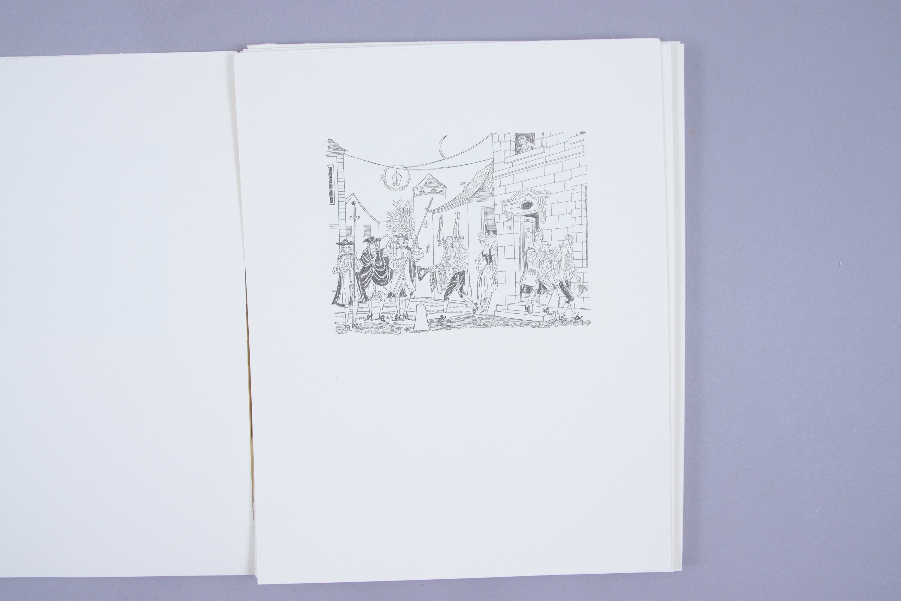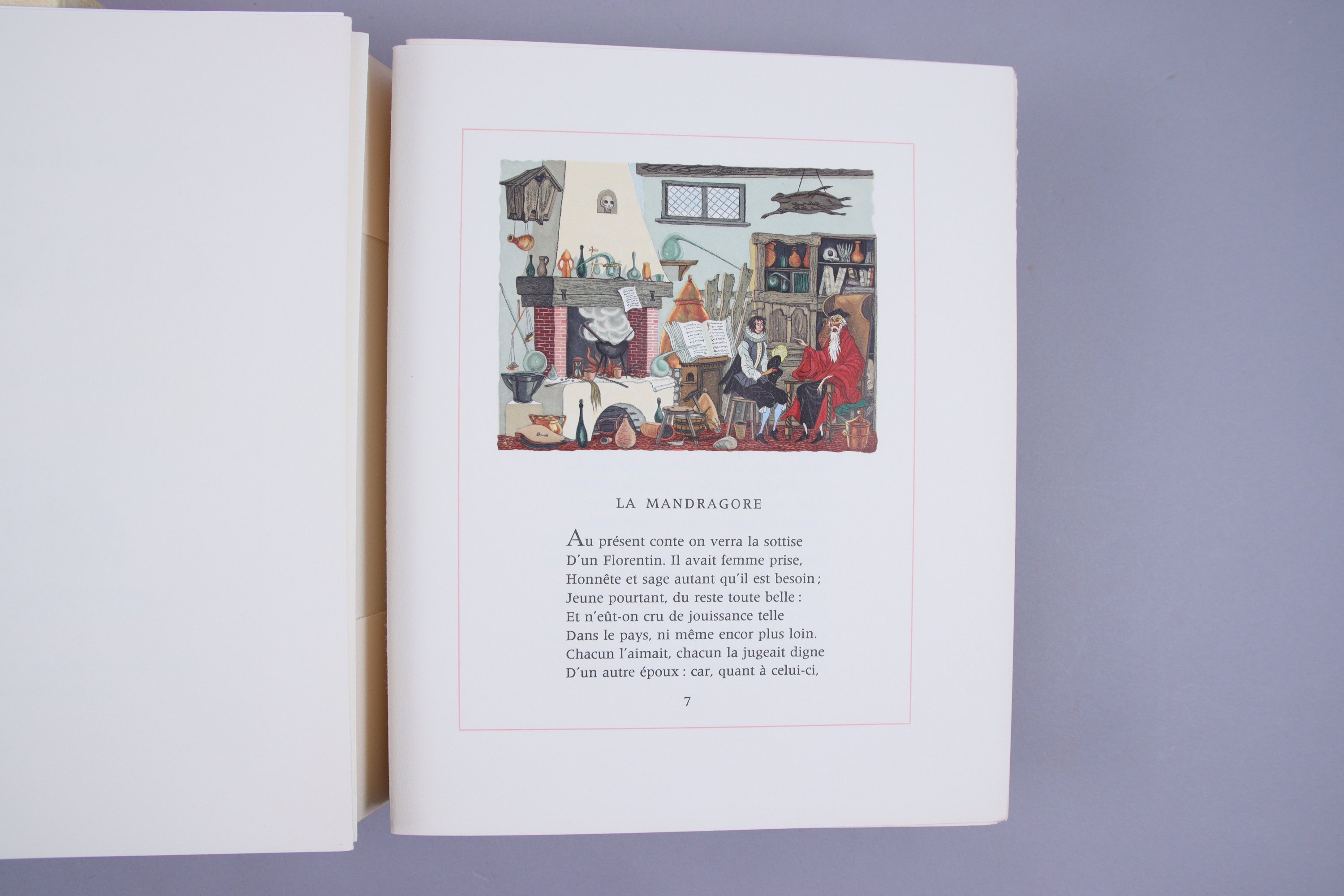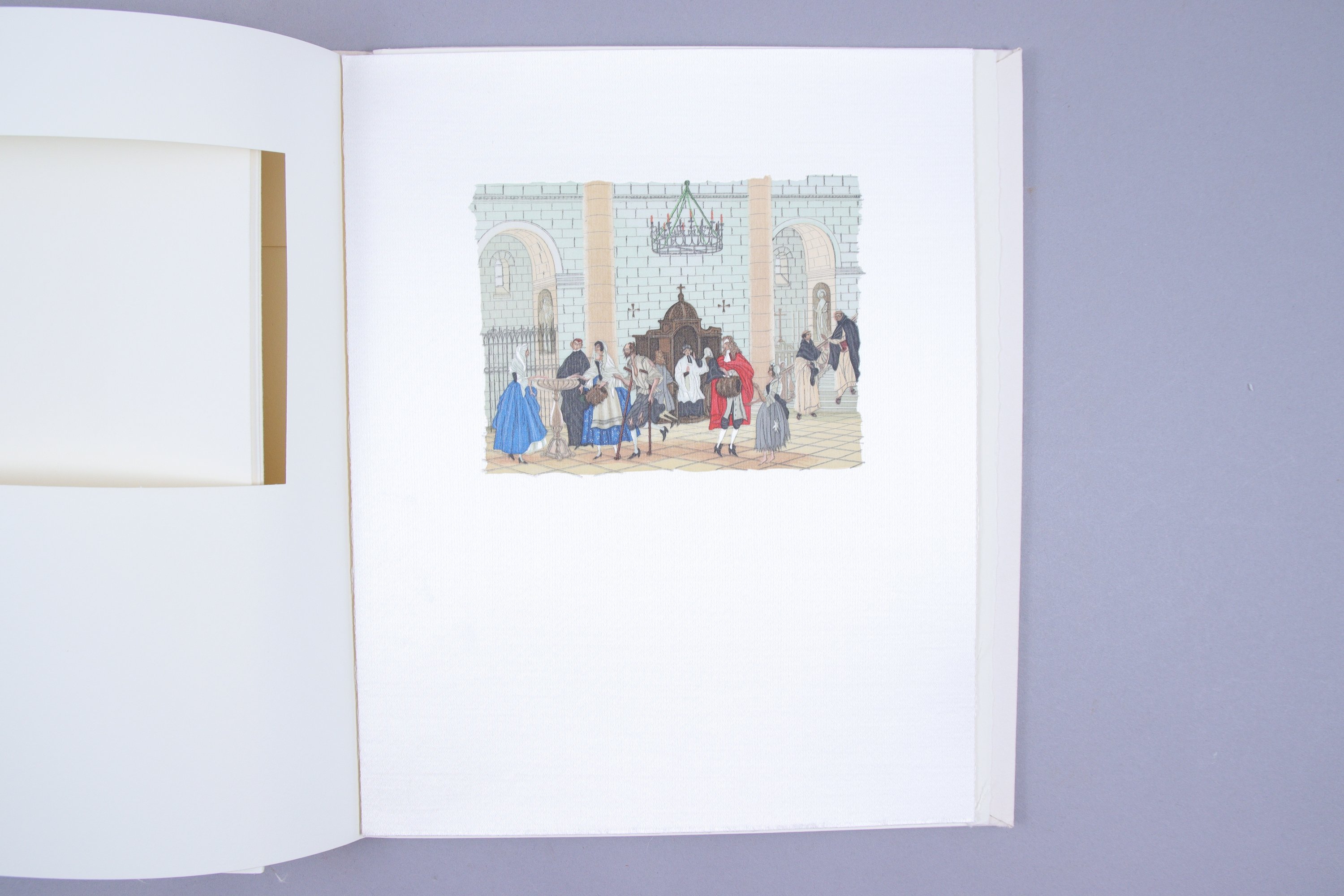 Le premier grand papier ne comprend qu'un exemplaire, 1. Le deuxième grand papier est limité à 8 exemplaires, numérotés de 2 à 9, dont celui-ci, n°5. Il est complet de toutes ses suites sur soie et sur vélin, de ses 3 aquarelles originales, , ainsi que des 3 cuivres encrés.