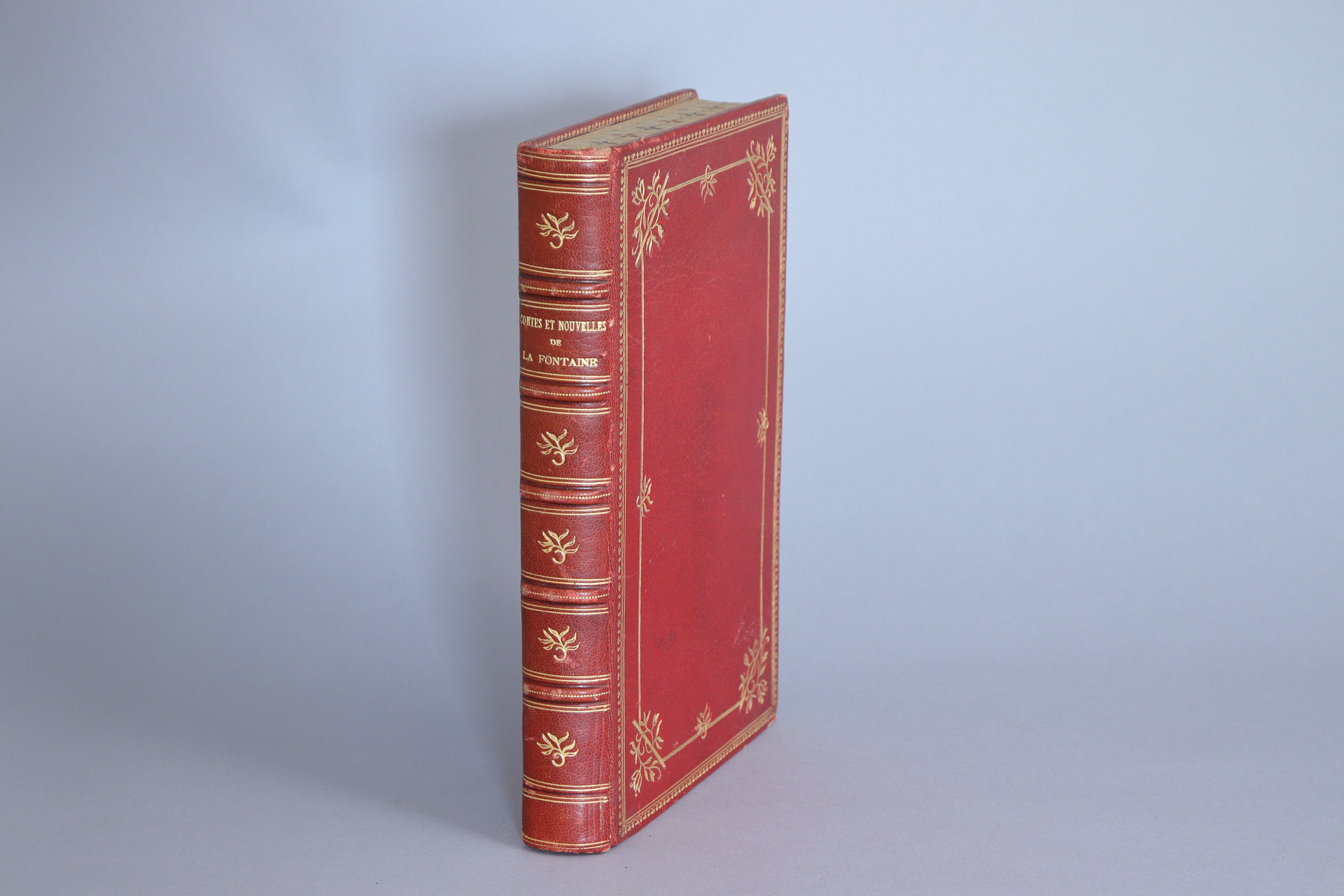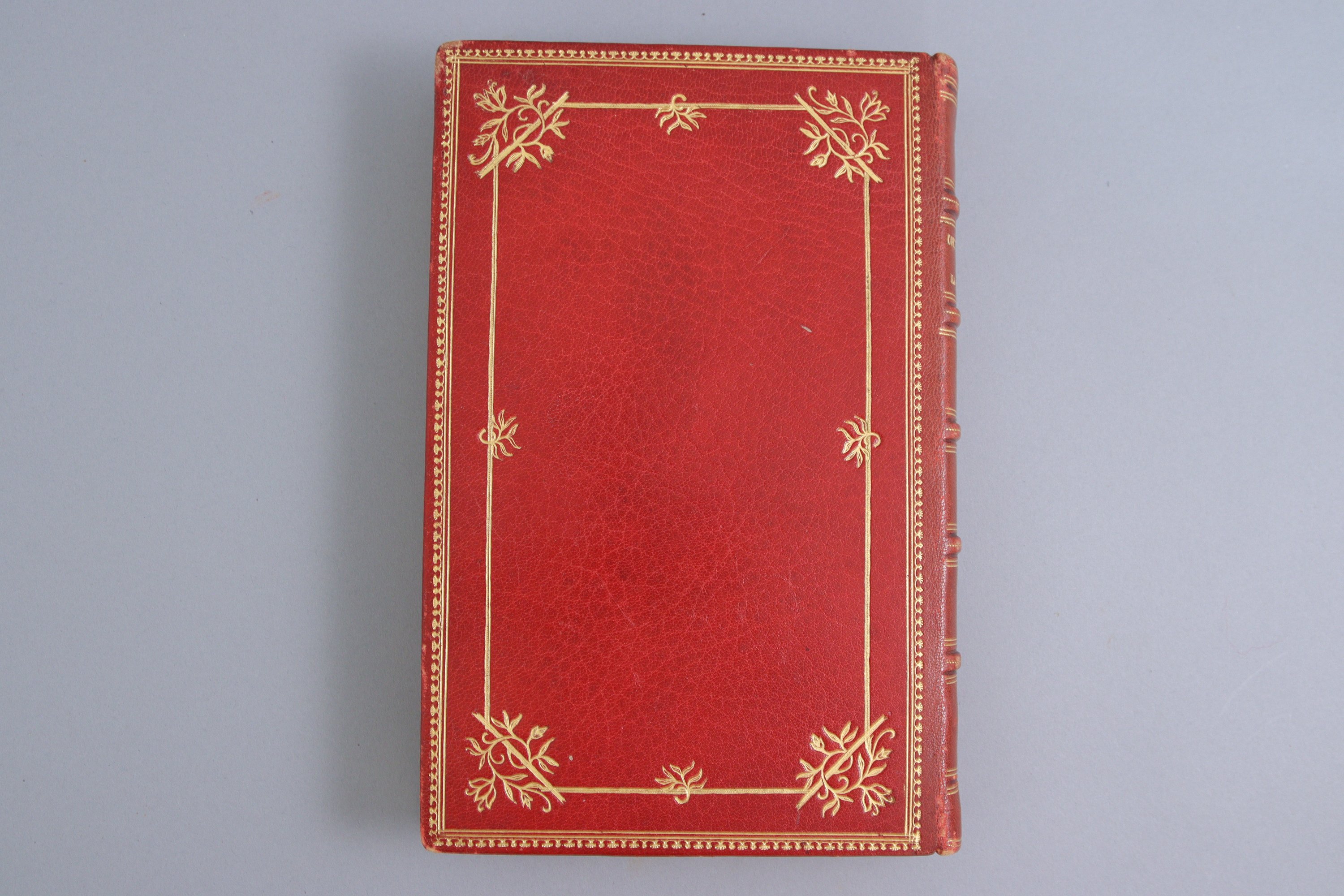 Plein maroquin rouge, roulette et filets droits d'encadrement dans lesquels s'inscrivent deux autres filets droits ornés dans les angles de grands fers à motif floral stylisé, et dans leur milieu d'un fer à motif de rameau. Dos à 5 nerfs, orné dans les entre-nerfs d'un fer à motif de rameau. Doublure de maroquin vert, dans un large encadrement composé de filets droits, de roulettes à la grecque, et d'une large roulette de fleurs de style Art Déco. Toutes tranches dorées, ciselées avec motifs peints en rouge et en vert. Reliure du temps. (2 coins très légèrement frottés).