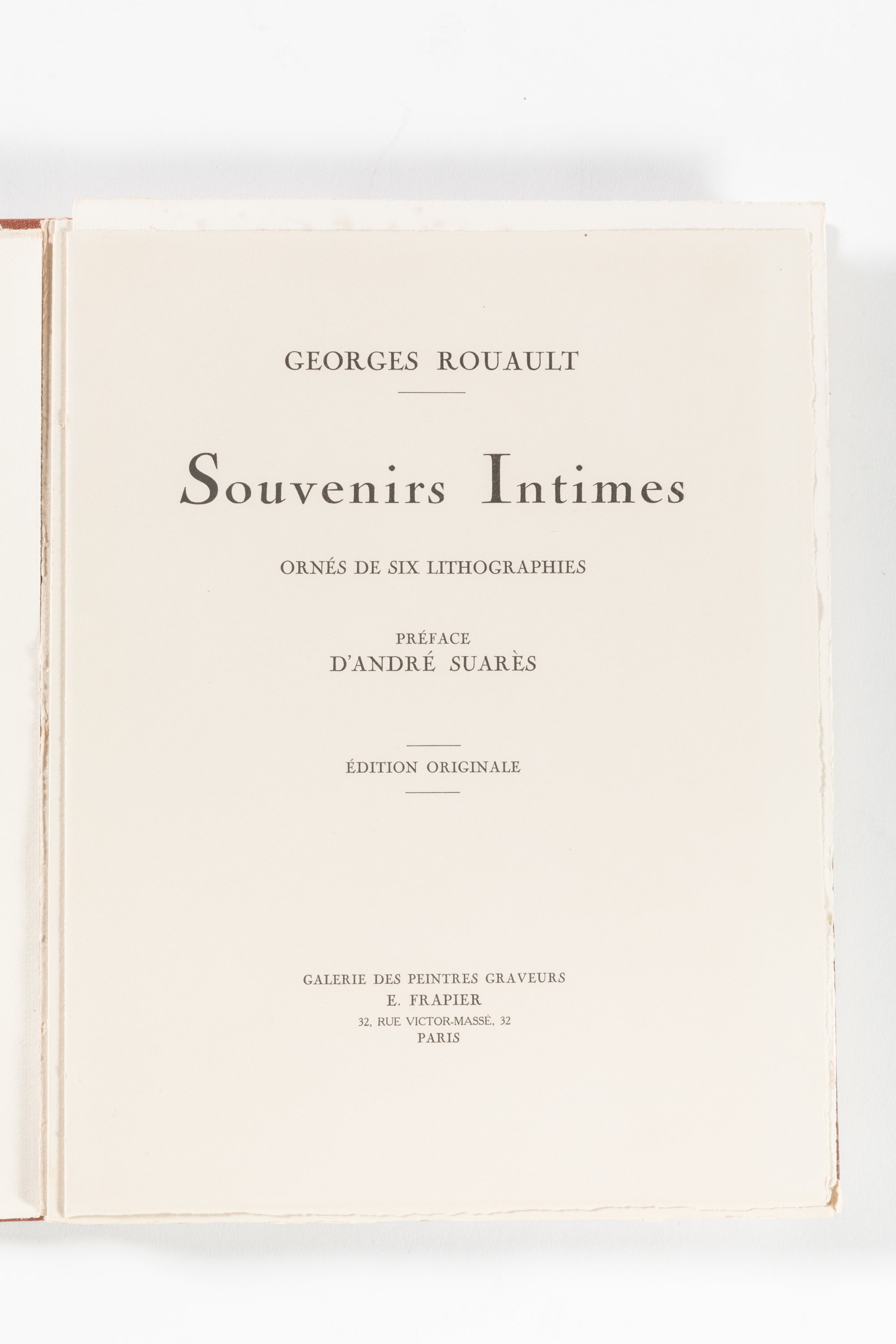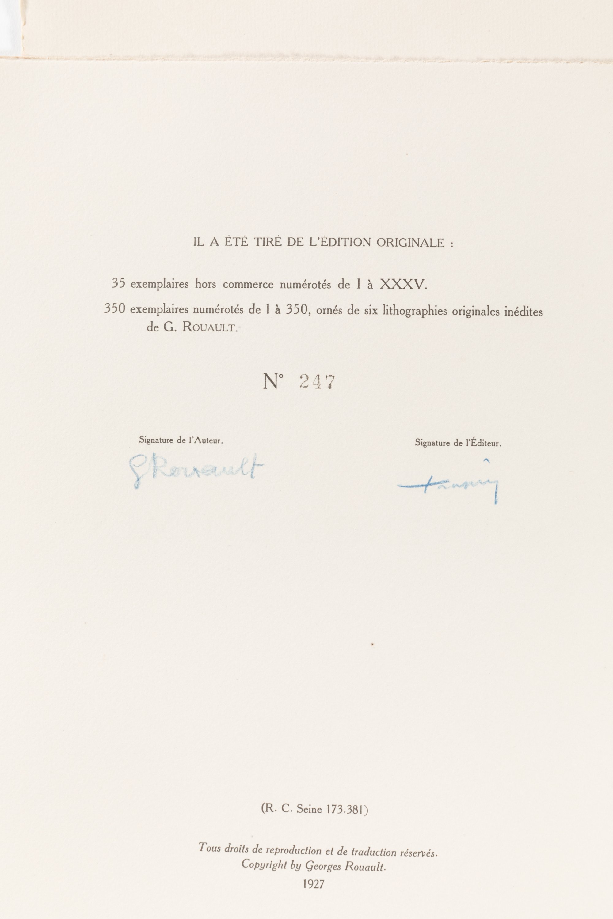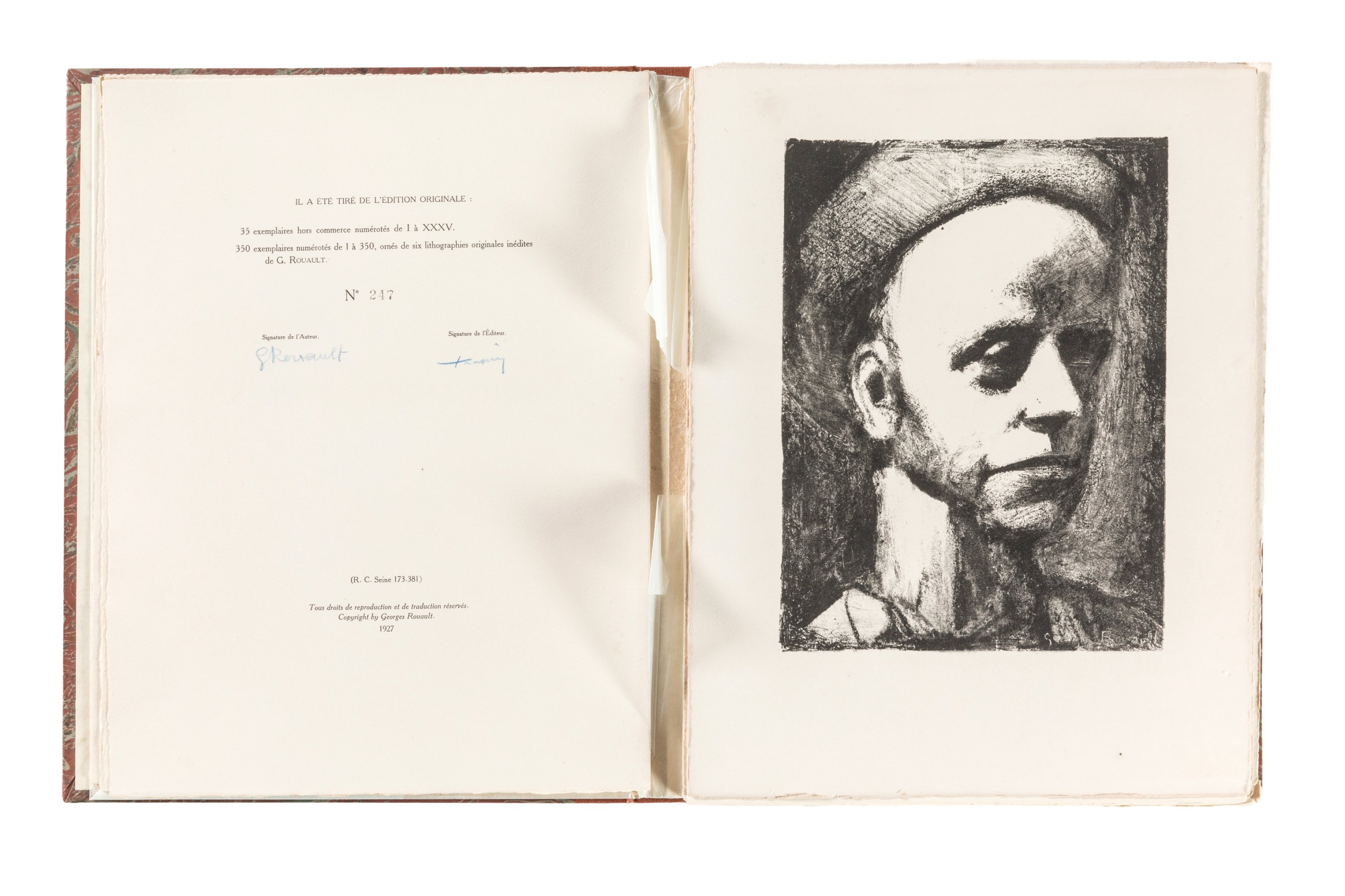 Tirage limité à 350 exemplaires, tous signés par l'artiste, tous sur vélin d'Arches, celui-ci n°247, ornés de 6 lithographies originales de Rouault: autoportrait de Rouault en frontispice, portraits d'André Suarès (avec taches d'humidité), Gustave Moreau (2), Léon Bloy et J. K. Huysmans.