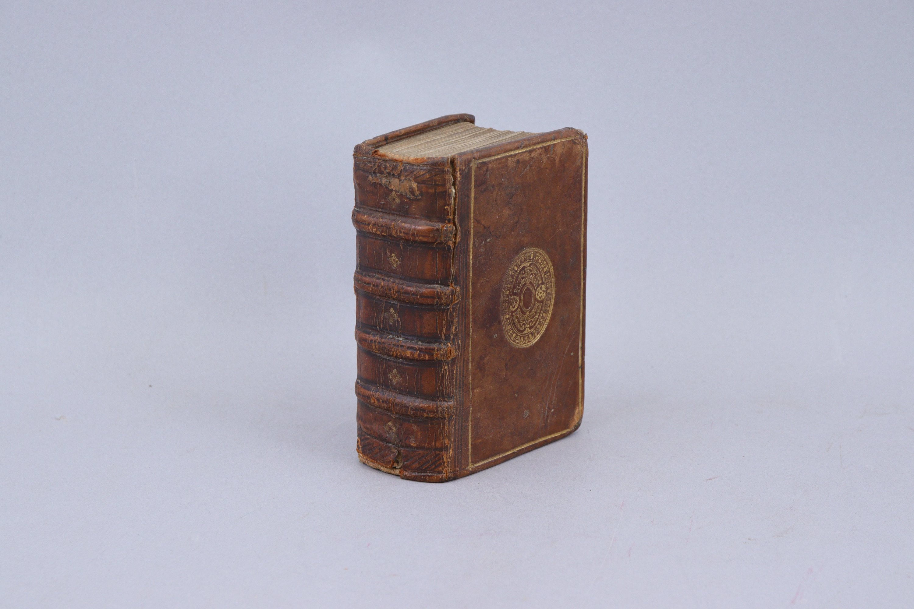 Fort in-16, (1 ff), 596 pages, 304 pages pour les traductions, ( 6 ff) pour le Balladin de Clé. Marot, et ( 2 ff) pour la Table des Psaumes. Veau fauve ; encadrement de 2 filets dorés, large olive centrale dorée, dos à 4 doubles nerfs orné de petits fleurons. Reliure du temps. (Mors fendus sur environ 5 cm ; coiffes émoussées ; coins frottés. Quelques légères rousseurs. Déchirure sans manque sur le feuillet (a5) réparée au ruban adhésif)..