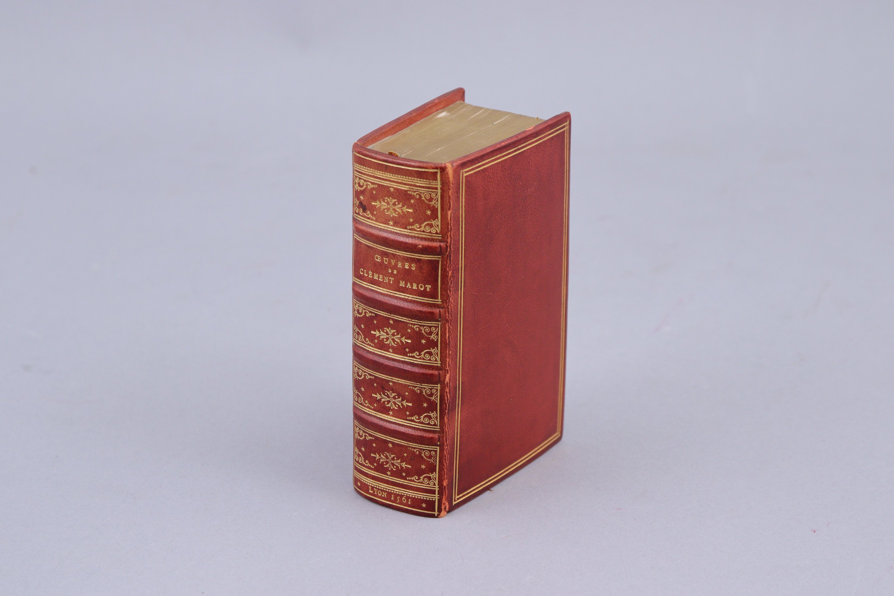 In-16, 830 pages. Plein veau glacé rouge, double filet d'encadrement. Dos orné.toutes tranches dorées. Reliure du XXème siècle. (Le titre manque. ainsi que le dernier feuillet, qui est blanc. Exemplaire rogné un peu court en tête, avec atteinte à quelques titres courants.).