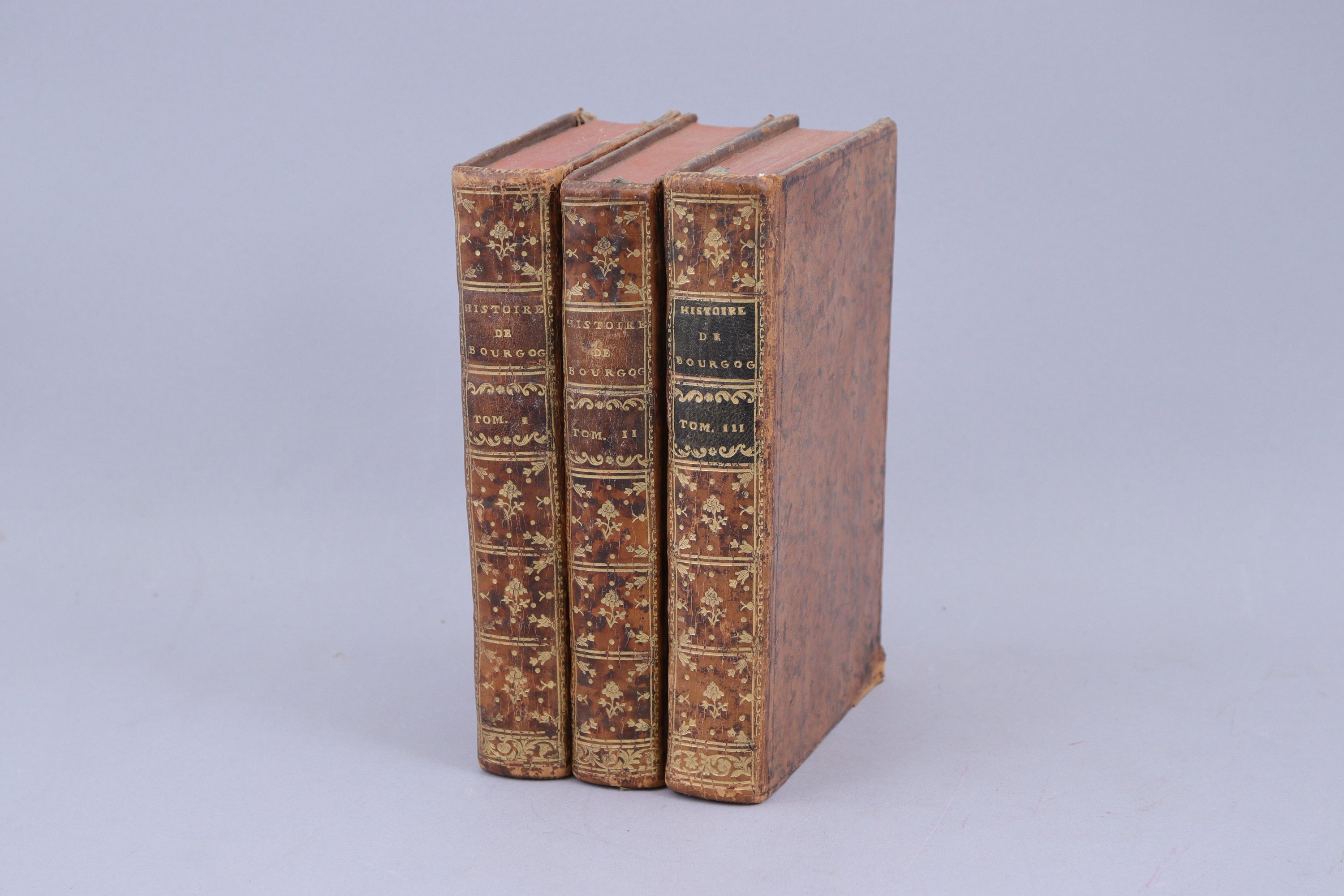 3 volumes in-8, plein veau du temps. (Quelques défauts aux coins et aux coupes. Importante galerie de vers dans la marge de tête de 30 feuillets du tome III).