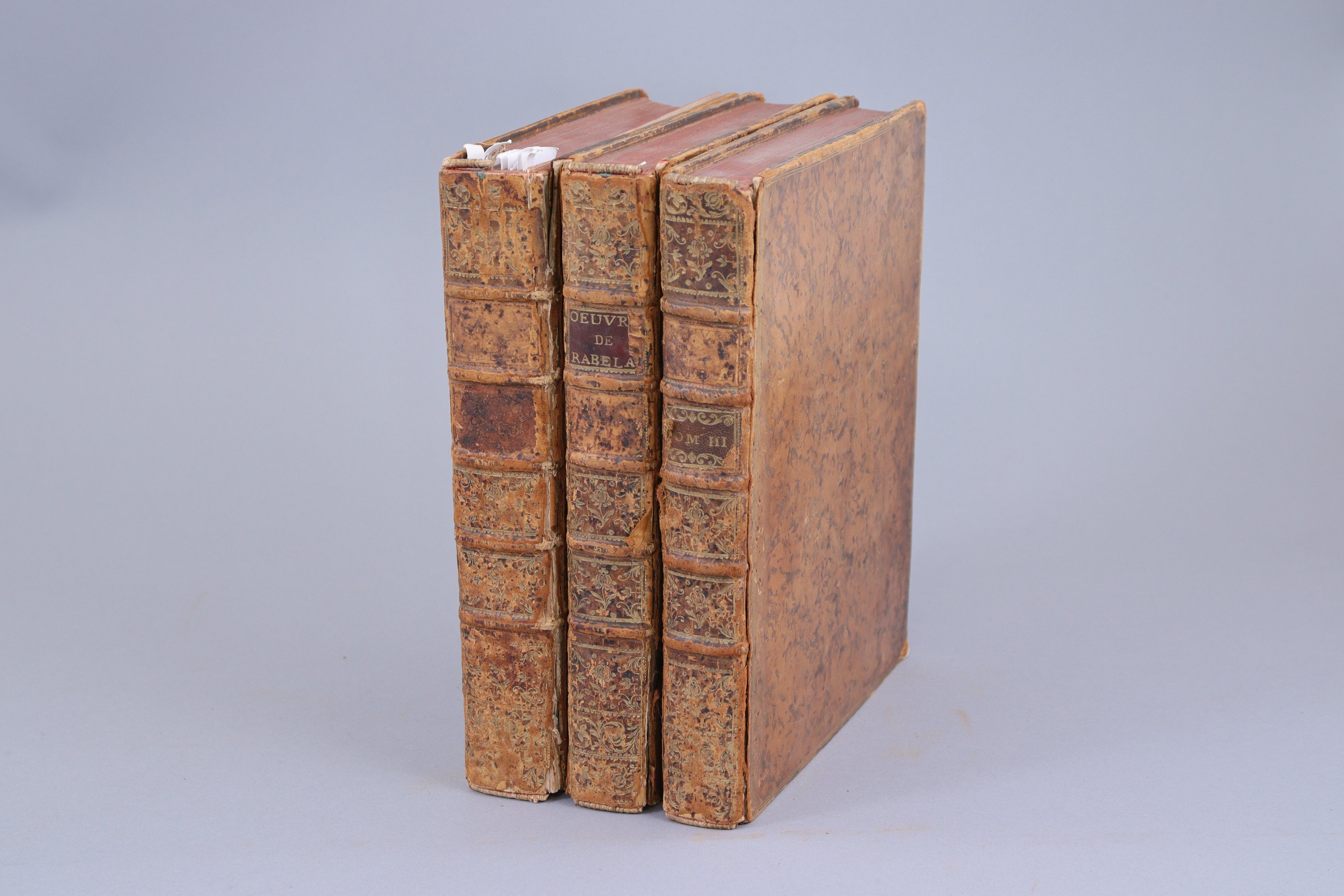 Bon état intérieur. Les reliures méritent une restauration soignée: c'est en effet la meilleure édition XVIIIème de Rabelais, "très recherchée" (Tchemerzine, IX, 319 B), "la plus importante édition illustrée de Rabelais au XVIIIème siècle" (Oberlé, 353).