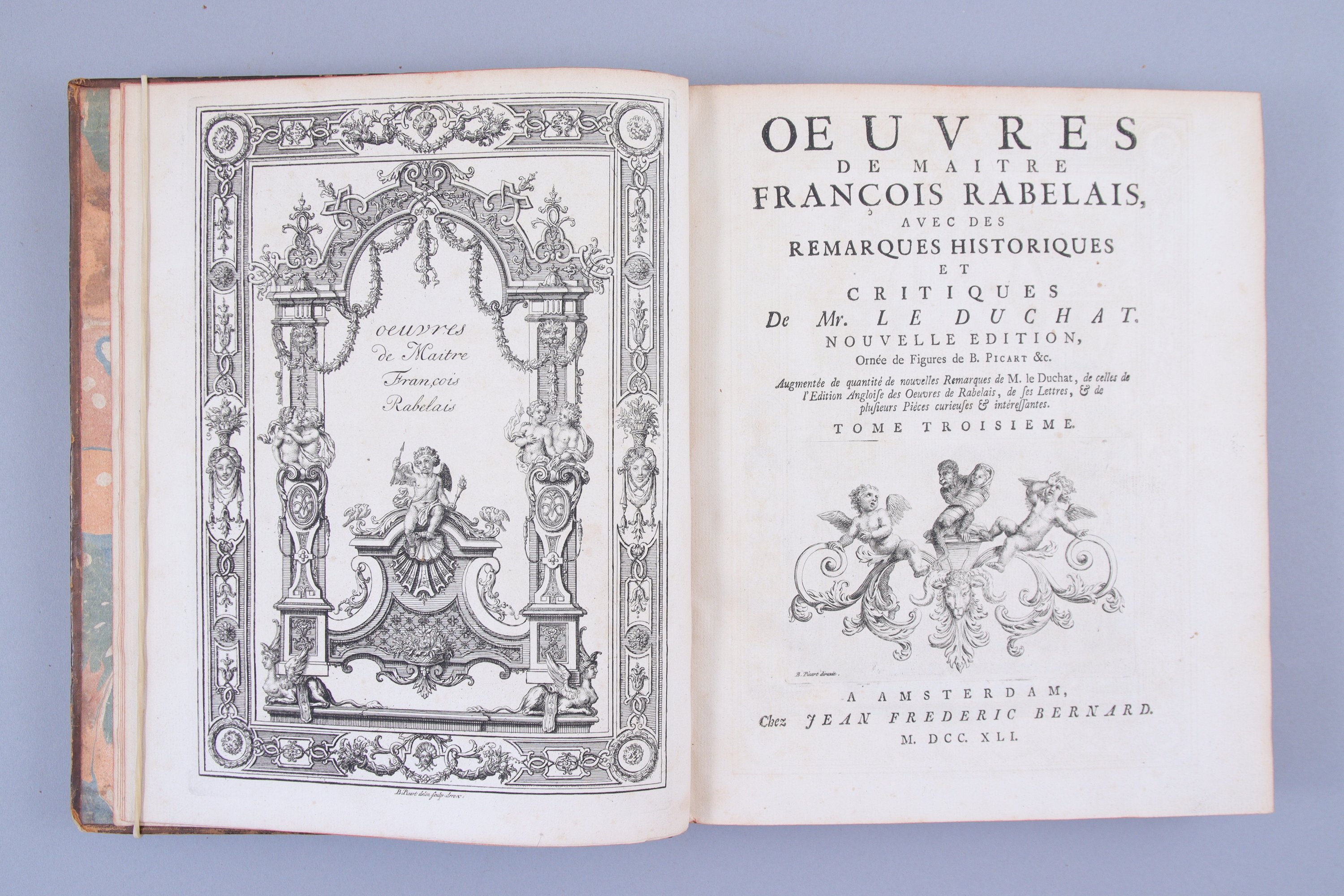 Oeuvres de Maître François Rabelais. Avec des remarques historiques et critiques de M. Le Duchat. Nouvelle édition ornée de figures de B. Picart &c augmentée de quantité de nouvelles Remarques de M. Le Duchat, de' celles de l'édition anglaise des Oeuvres de Rabelais, de ses lettres et de plusieurs pièces curieuses et intéressantes..