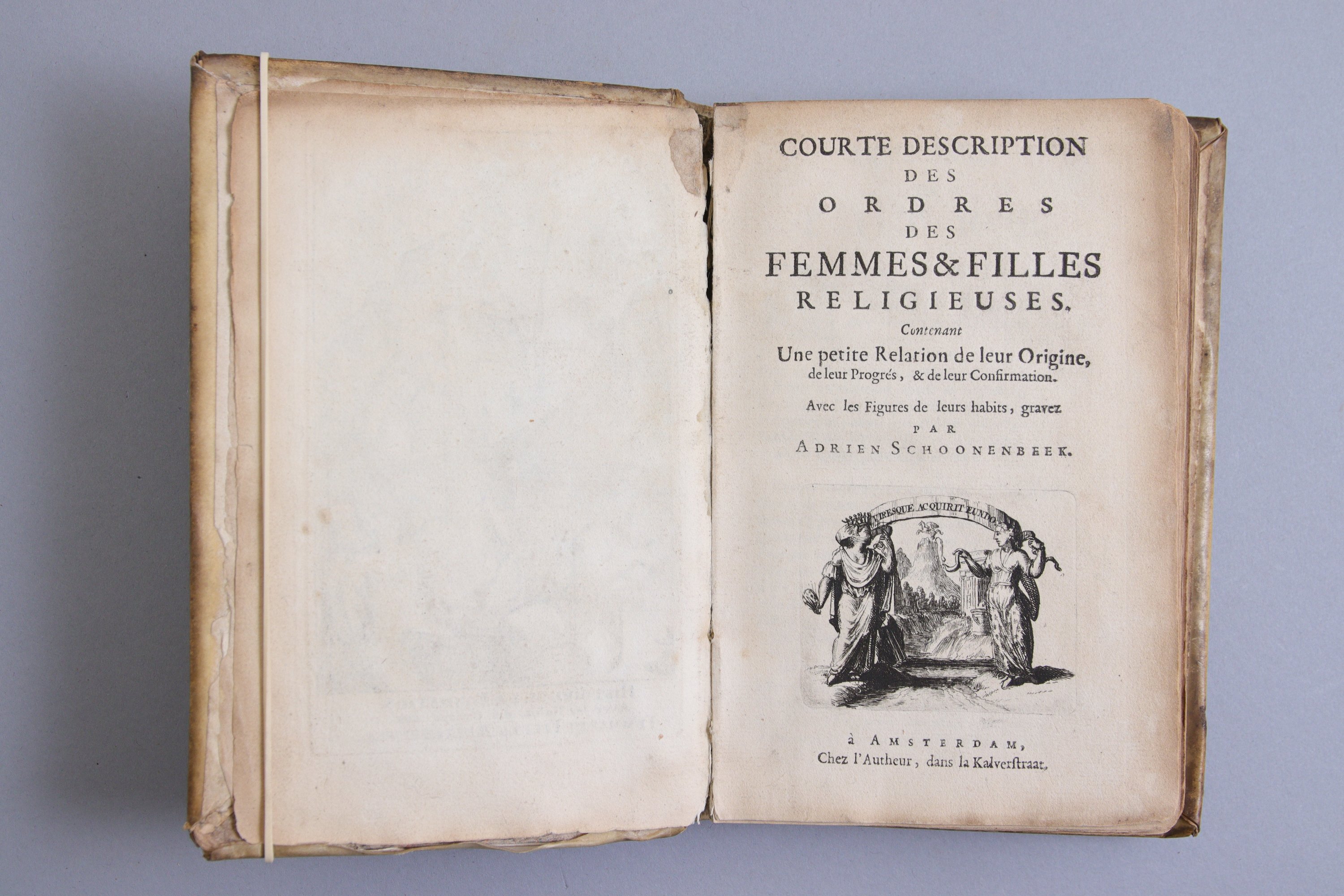 Courte description des ordres des femmes et filles religieuses contenant une petite relation de leur origine; de leur progrés et de leur confirmation. Avec les figures de leurs habits, gravez par Adrien Schoonenbek.