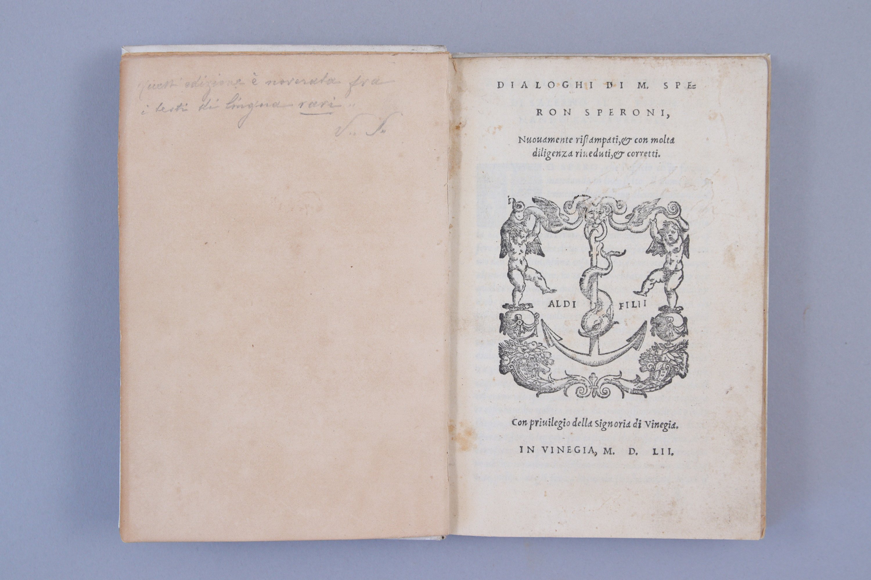 Dialoghi di M. Speron Spironi. Nuovamente ristampti & con molta diligenza riveduti & corretti.. Venise, Aldi filii. 1552