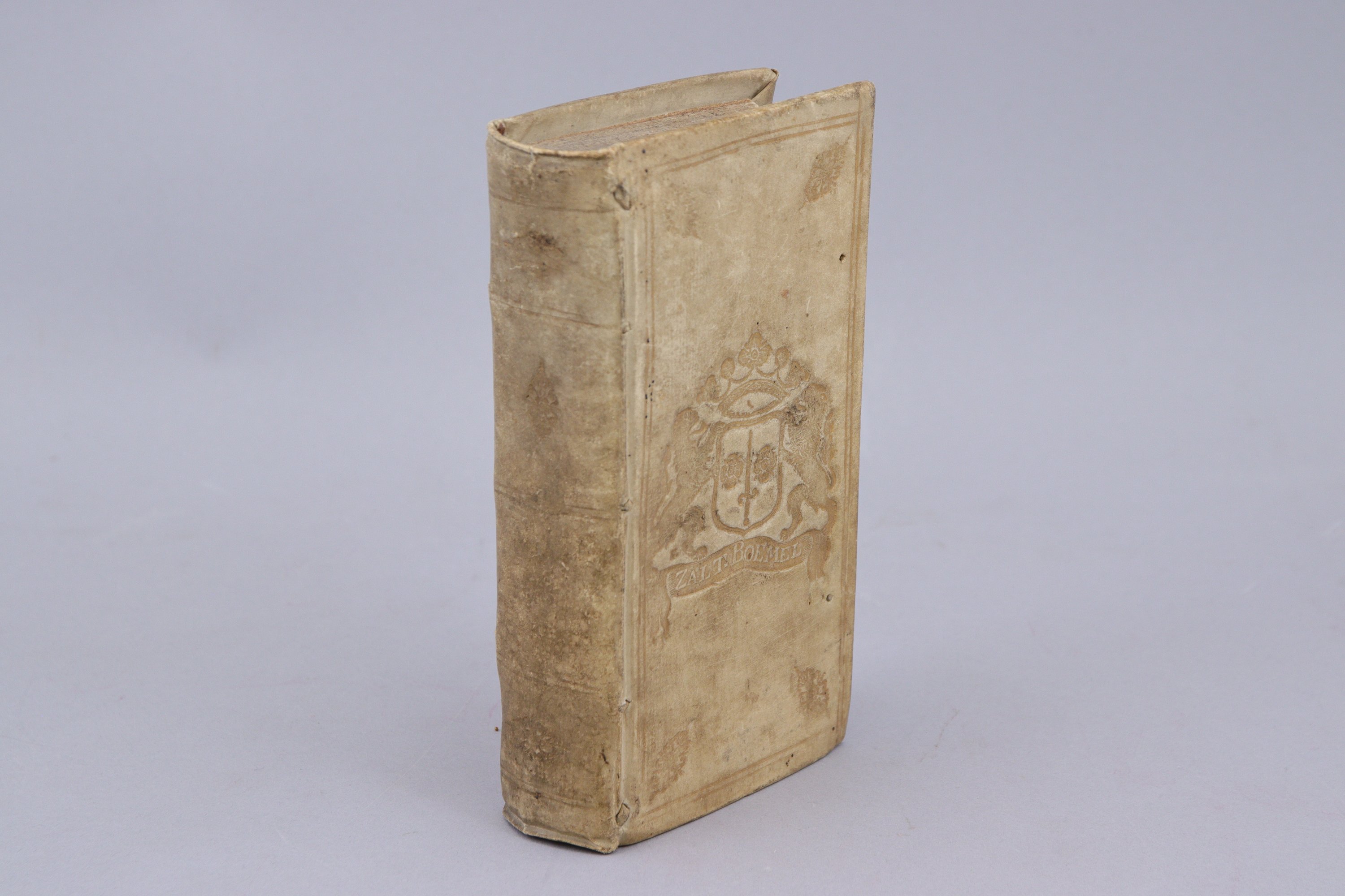 Fort in-12. Frontispice, (11 feuillets), 529 pages chiffrées 429 par erreur, plus table. Vélin du temps, aux armoiries de la ville hollandaise de Zalt Boemel..
