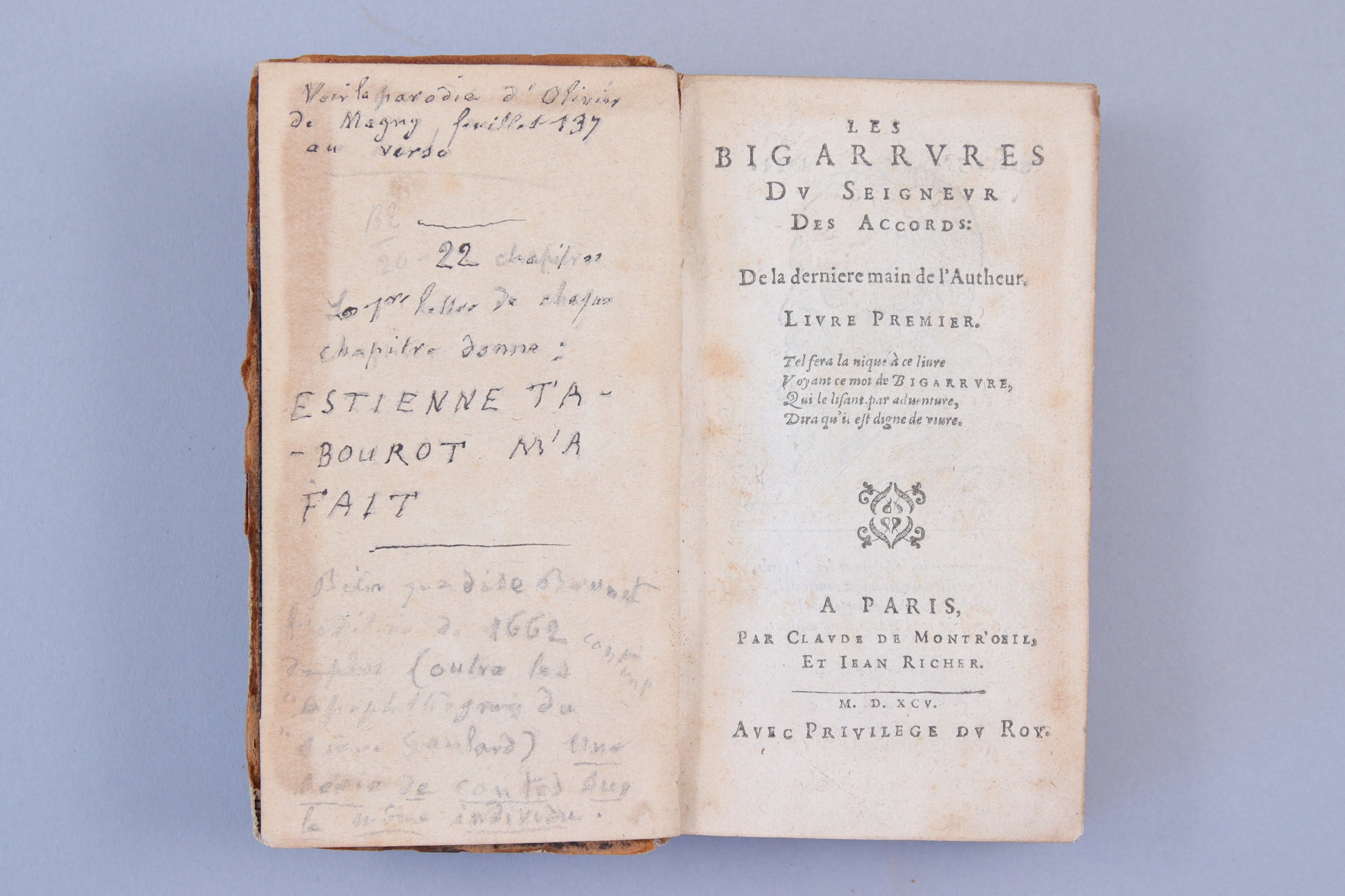 Possible première tentative d'édition de l'oeuvre complète de Tabourot des Accords. Elle se compose des 3 parties avec titres séparés publiées en 1595 chez Claude Montr'oeil et Jean Richer, et des Apophtegmes (signés AC12-D8), probable remise en vente sans le titre d'une édition antérieure (1585?) invendue.