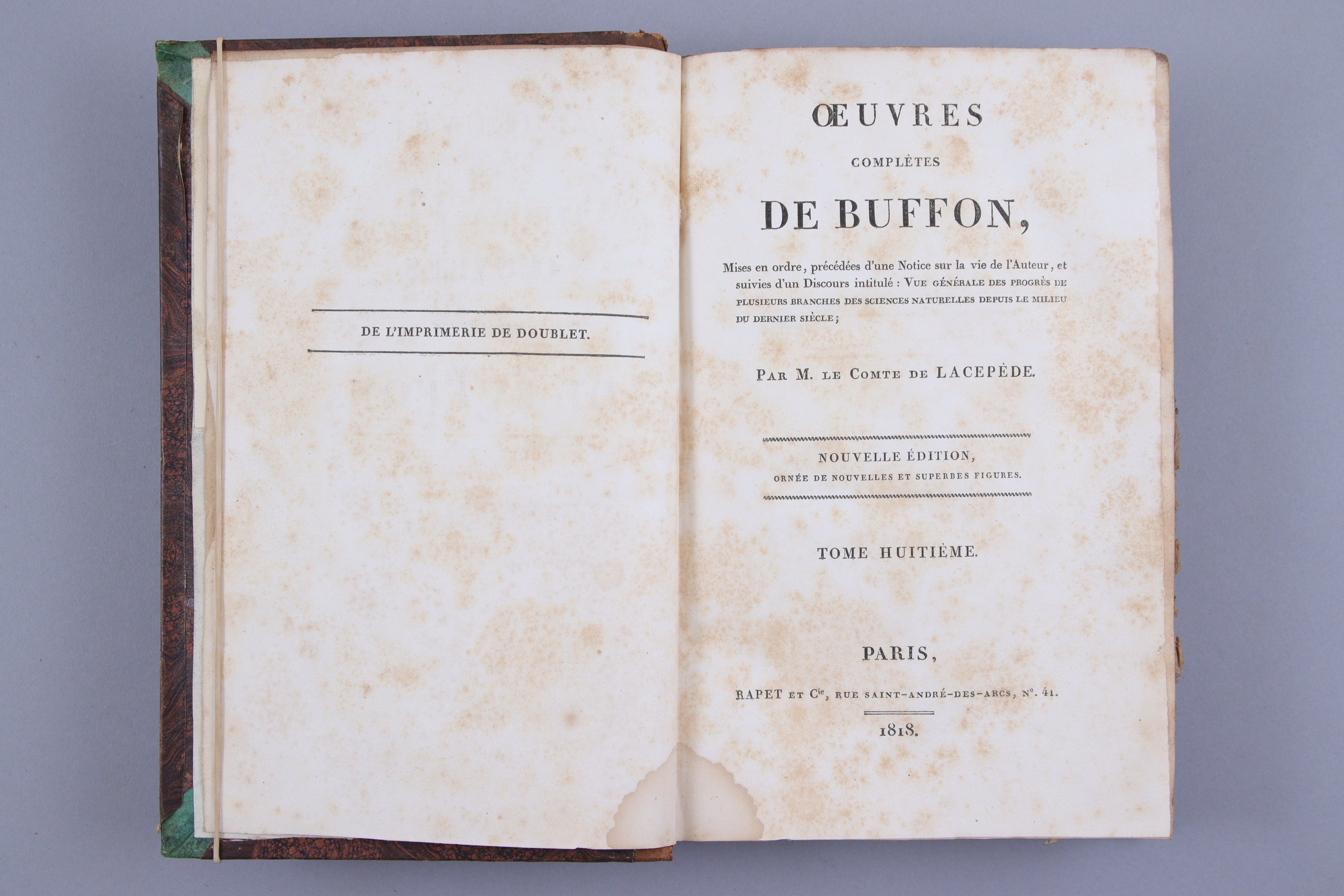 Oeuvres complètes de M. de Buffon, mises en ordre par le comte de Lacépède. (8 vol.). Histoire naturelle des poissons par M. le Comte de Lacépède, suite et complément des Oeuvres de Buffon. (5 vol).