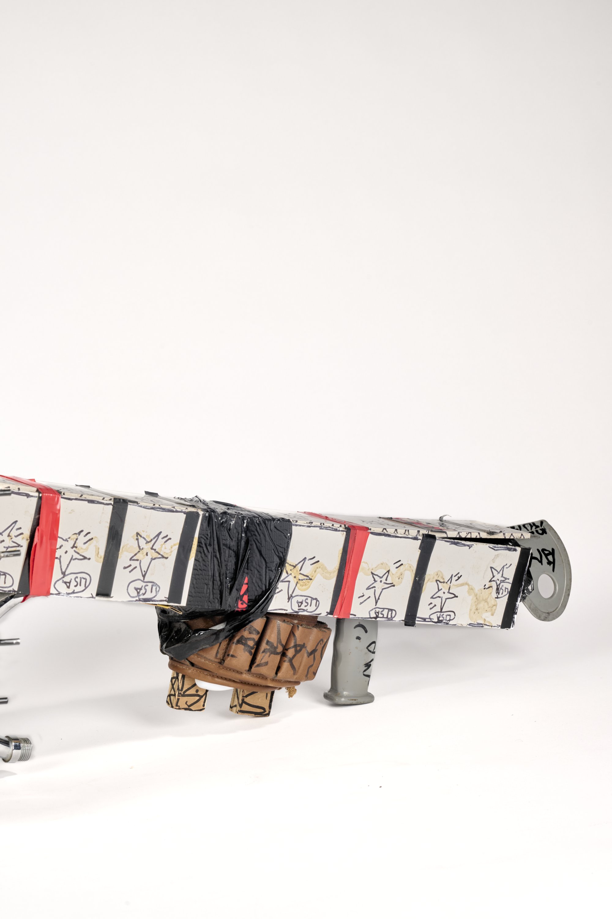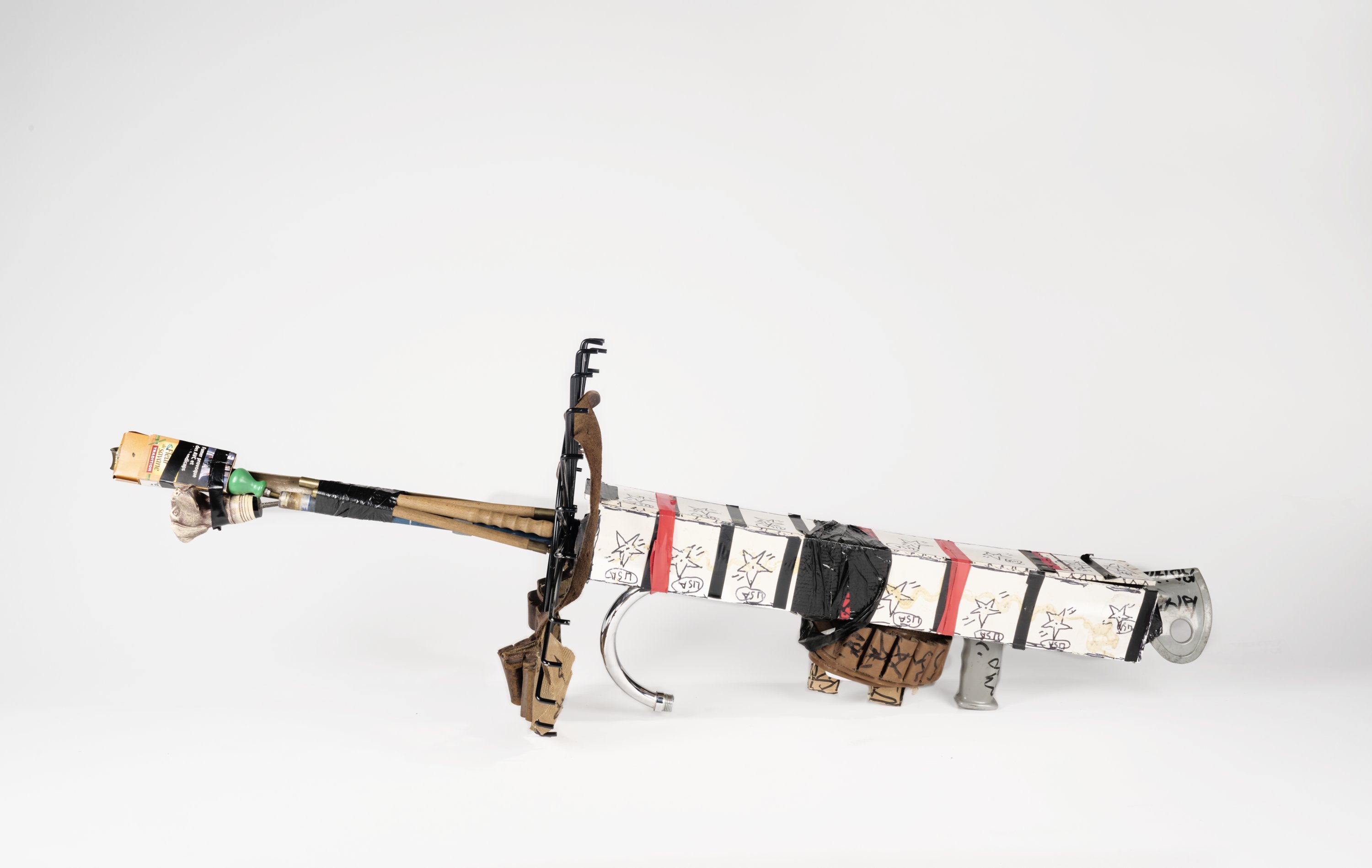 Béquille, paquet de cigarette, élément de canne, carton, robineterie, cartouchière, scotch, présentoire et feutres.