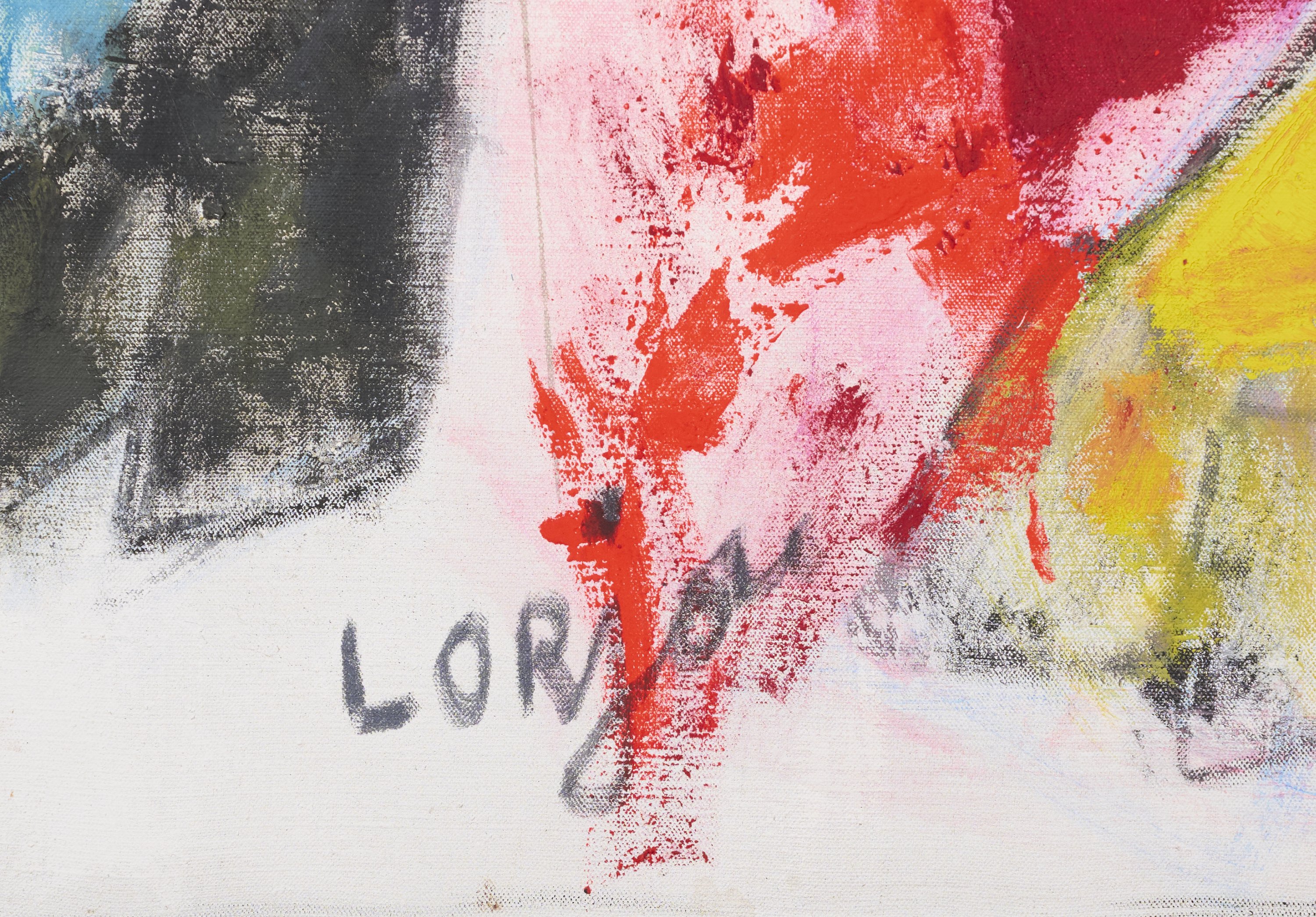 Signée en bas à gauche. Une étiquette imprimée avec le titre et la date sur le châssis.