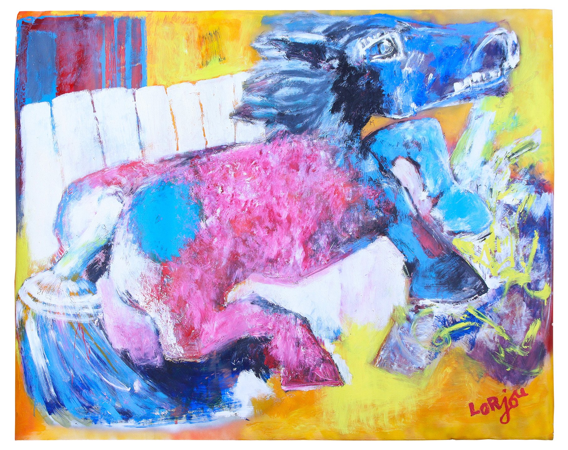 Cheval rose et tête bleue