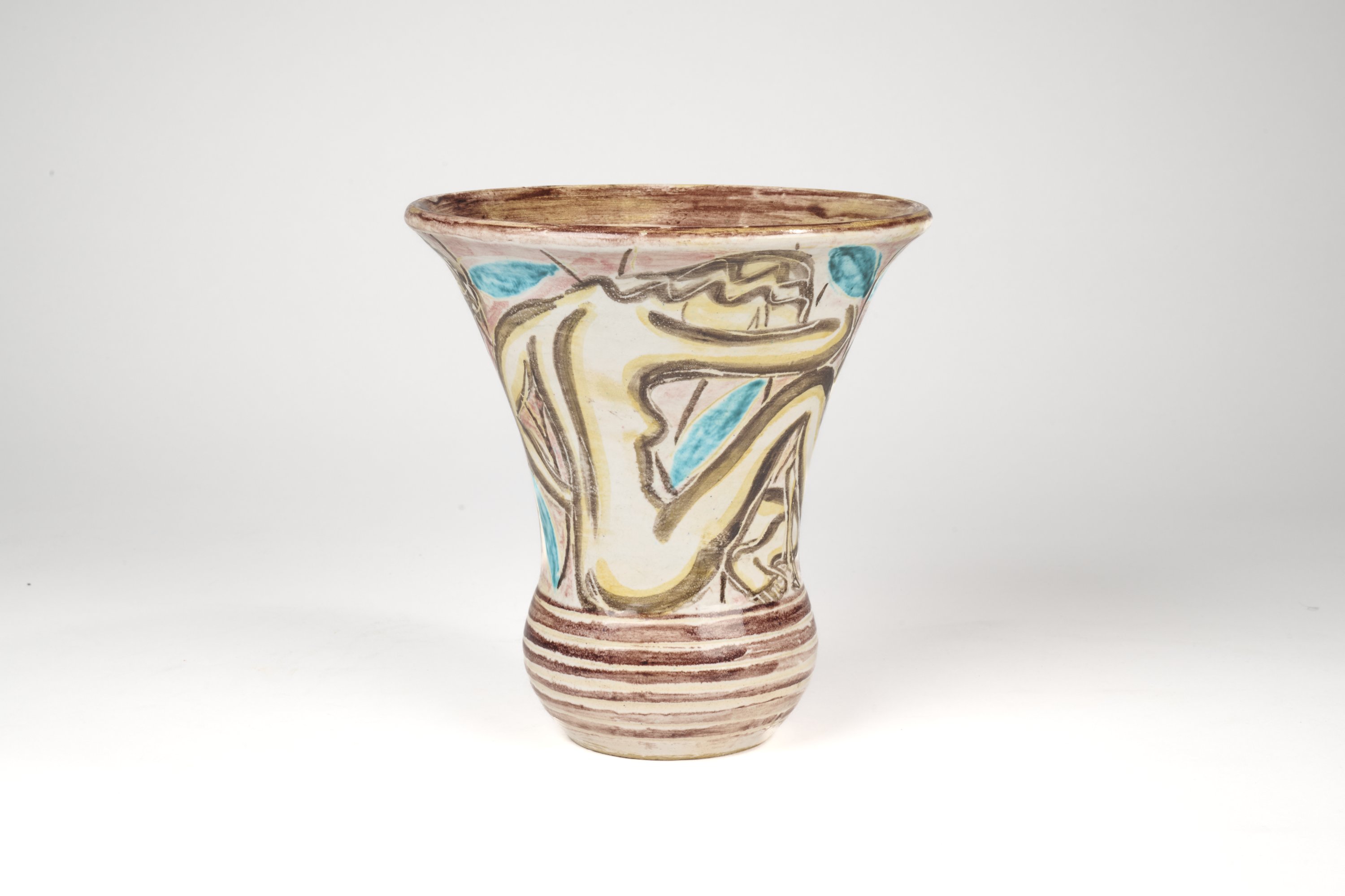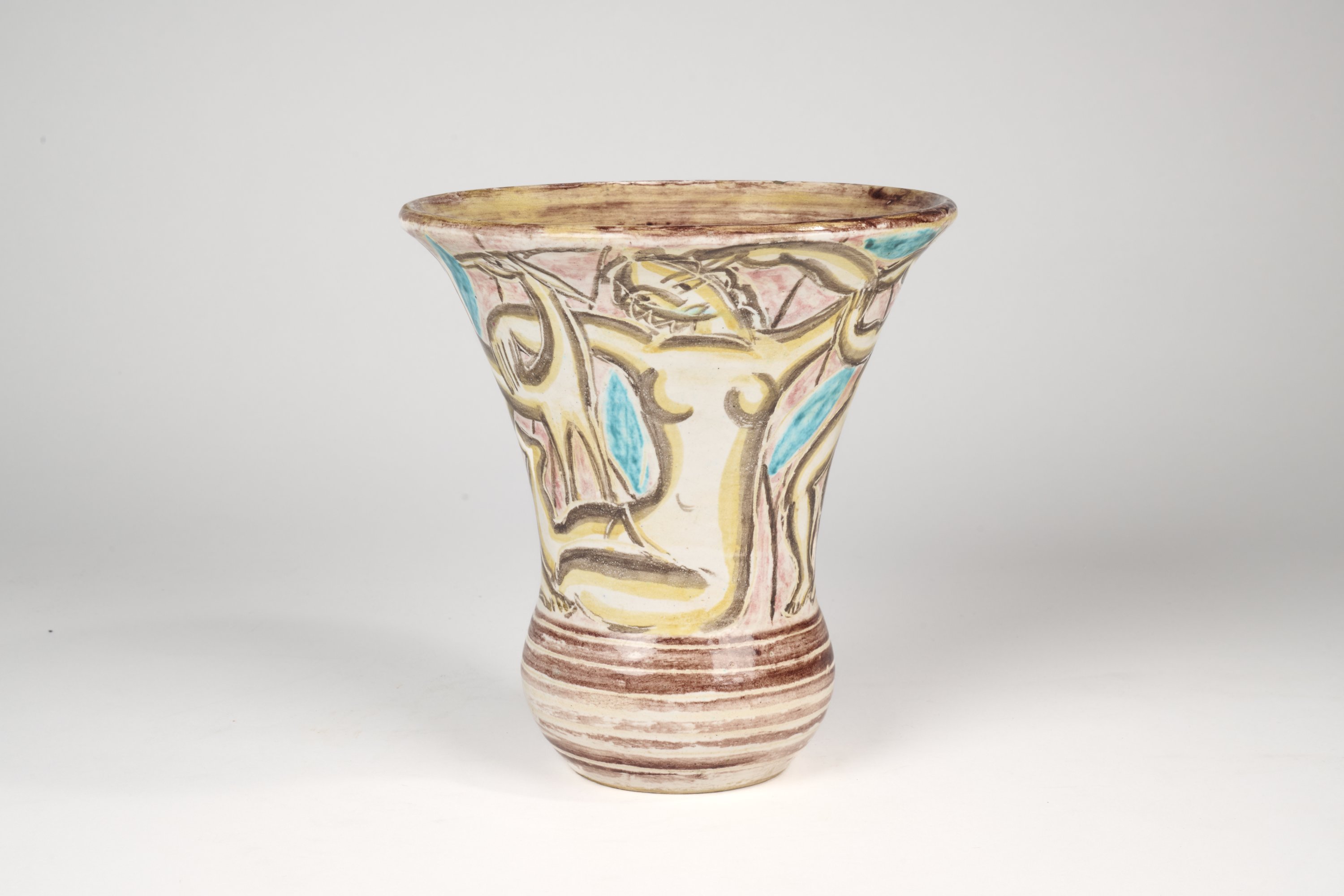 Céramique à décor émaillé de deux femmes à l'antilope et un enfant entourant un bouc sur fond de paysage feuillagé.